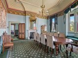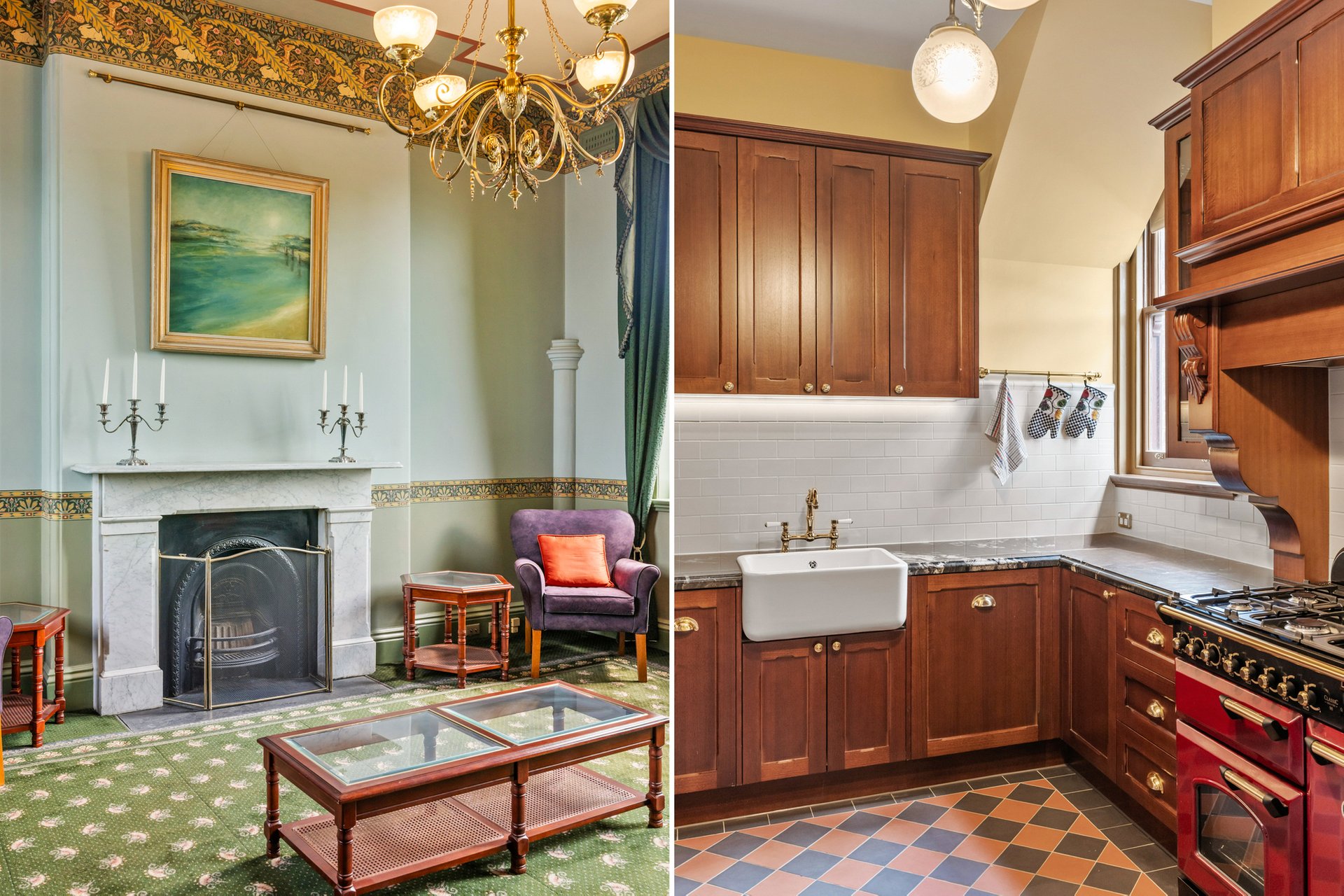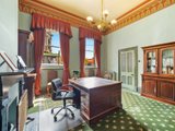 The grand formal lounge and dining rooms feature soaring ceilings, ornate plasterwork, and magnificent bay windows that flood the space with natural light. Original marble open fireplaces with intricate mantels add a timeless elegance, complemented by decorative cornices, ceiling roses, friezes and heritage detailing throughout the home. The flexible layout allows for multiple living, meeting, or entertaining zones, with the secondary dining or sitting room connected by an arched heritage opening, ideal for formal gatherings or professional use.