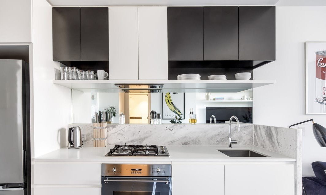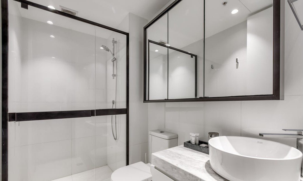The kitchen is finished with stone benchtops, modern appliances and excellent storage, combining clean contemporary design with everyday practicality. Stone surfaces continue into the bathroom, reinforcing the home’s cohesive and modern aesthetic.