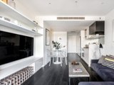 Timber flooring sets the tone through the open-plan living and dining area, creating warmth and a relaxed sophistication from the moment you enter. Large sliding doors open to an impressive outdoor terrace — generously proportioned and partially undercover — allowing for year-round entertaining, morning coffee in the sun or relaxed evenings with friends. It’s an outdoor space that genuinely feels like another living zone rather than a typical apartment balcony.