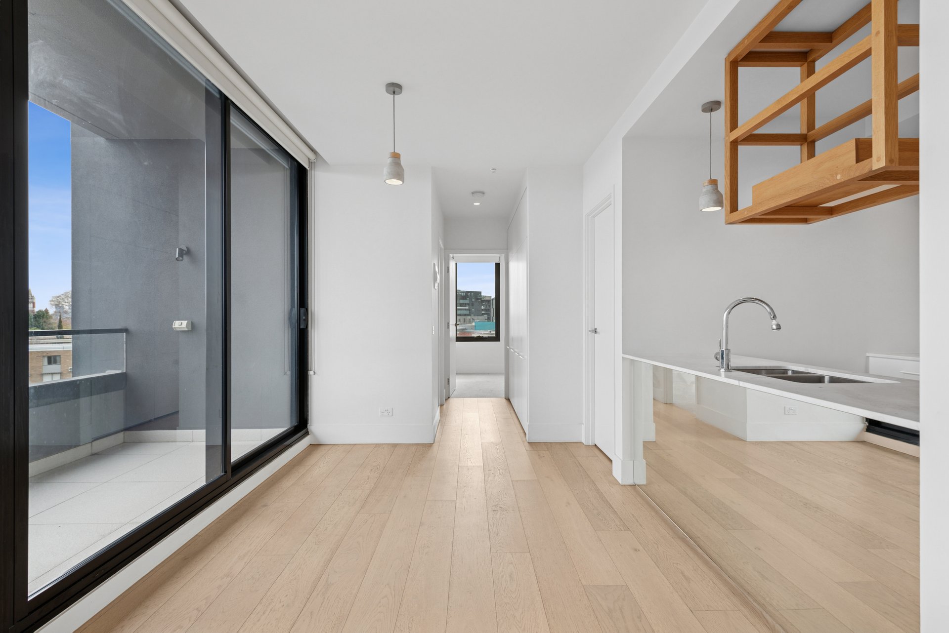 The striking low-rise complex makes an immediate impression with its glamorous foyer and bold architectural lines. Inside, the open-plan living and dining room offers a luxurious sense of space, flowing out to a covered northwest-facing balcony. Here morning coffee accompanies panoramic views stretching toward the CBD skyline. The sleek kitchen is appointed with stone benchtops, Miele cooking appliances, a Fisher & Paykel drawer dishwasher, and suspended timber shelving that adds warmth and visual interest.