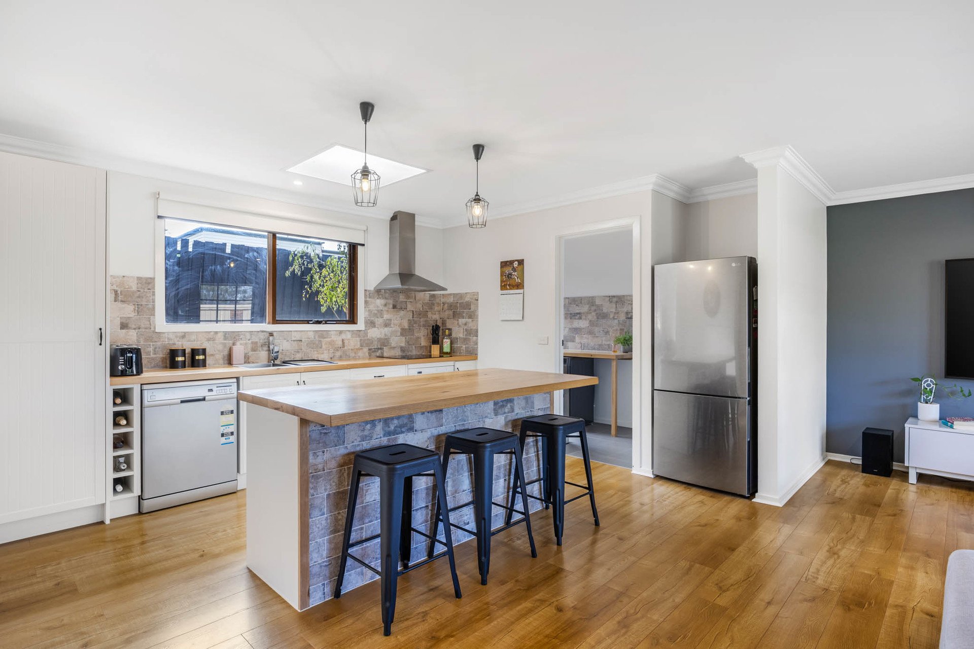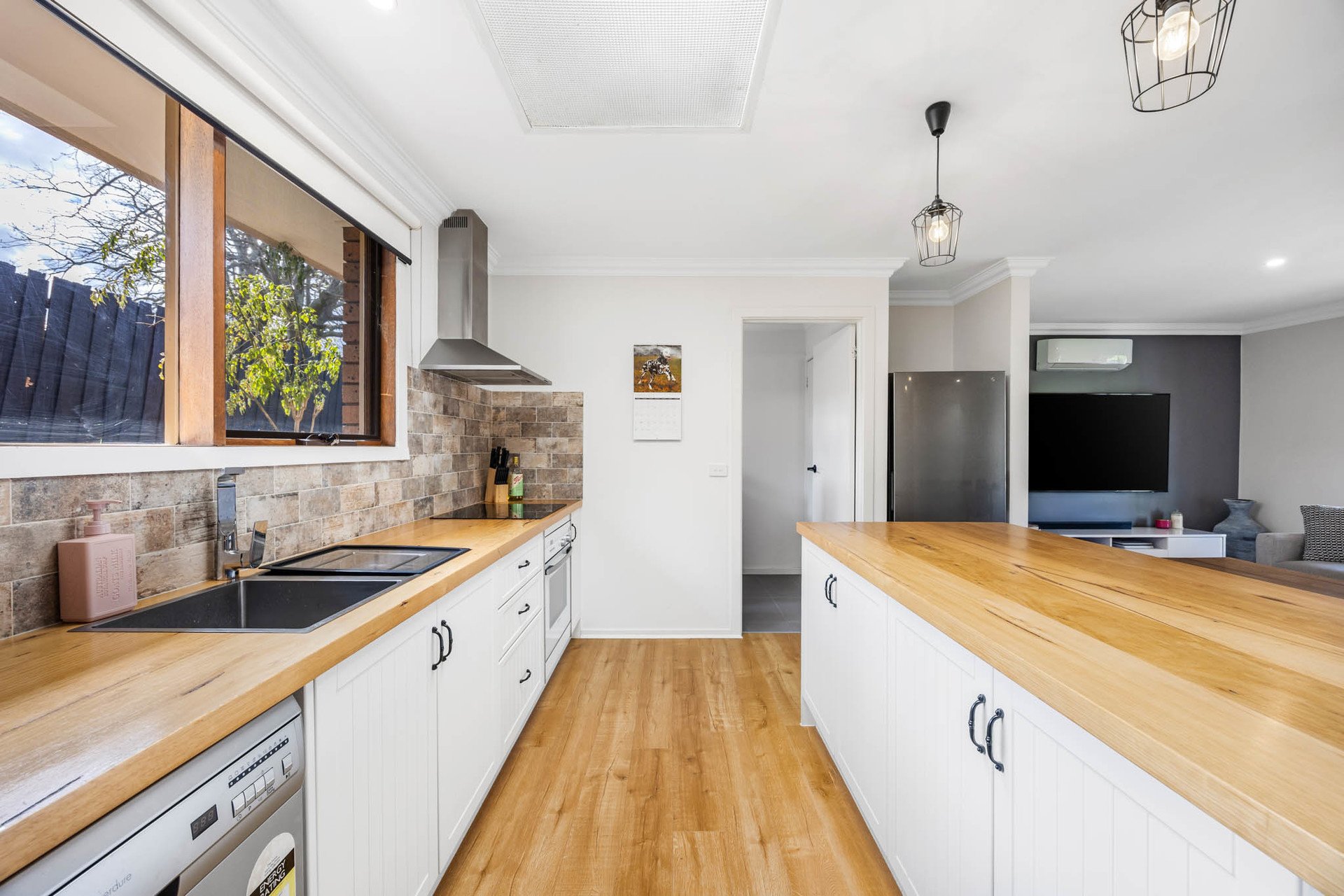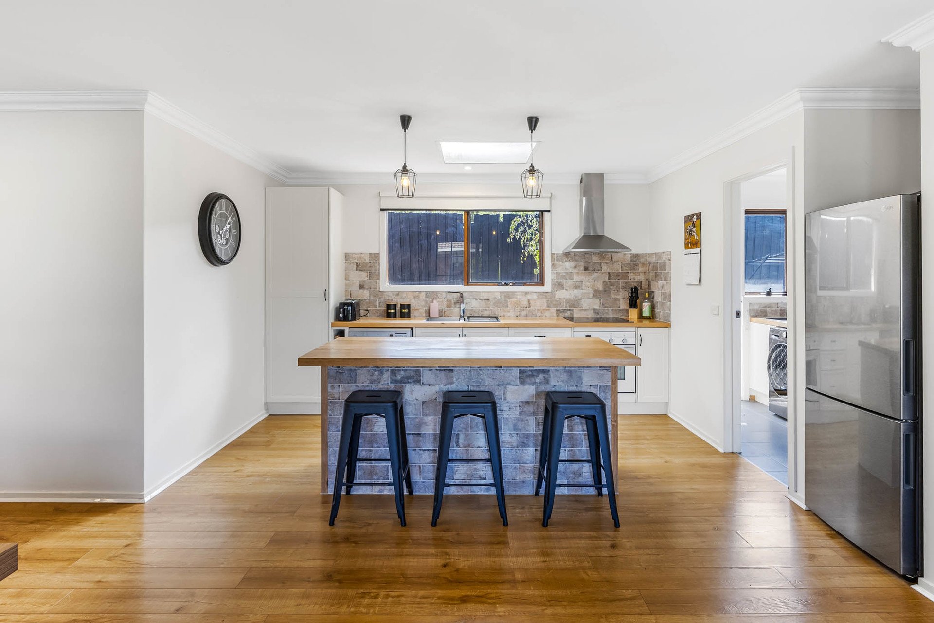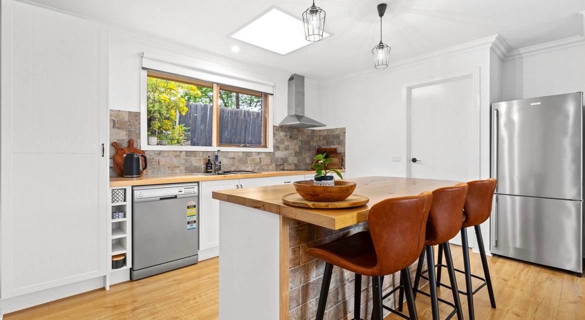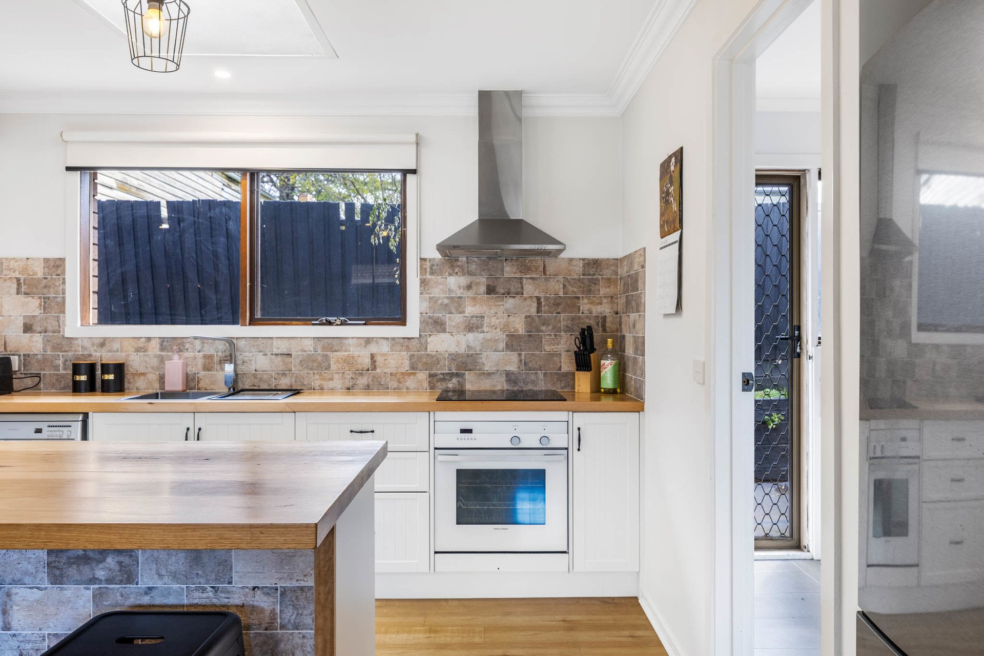 French windows usher in abundant natural light throughout, with chic country elegance evident in the open living and meals areas and generous kitchen-featuring a dedicated island with a timber surface and bar seating, rustic brick-style backsplash, double basin, inbuilt wine rack, an F&P oven, electric cooktop, and stainless-steel dishwasher. Outdoors, a fully fenced private courtyard garden provides a lovely setting for tranquil repose.