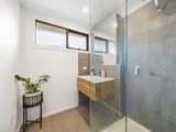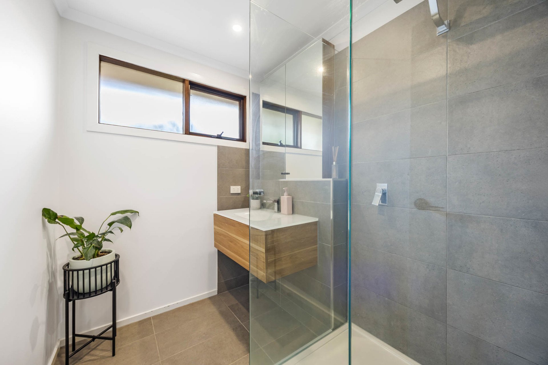 Accommodation comprises two carpeted bedrooms, with the main bedroom fitted with a built-in robe. The bathroom is appointed with stylish soft-grey tiling, a floating vanity, frameless glass shower with waterfall showerhead, and a separate toilet.
