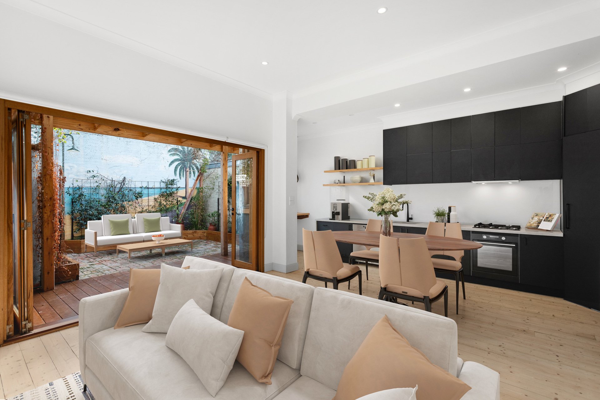 -Open plan lounge, dining and kitchen opening to a large sunny courtyard, the perfect spot to entertain with friends