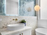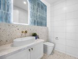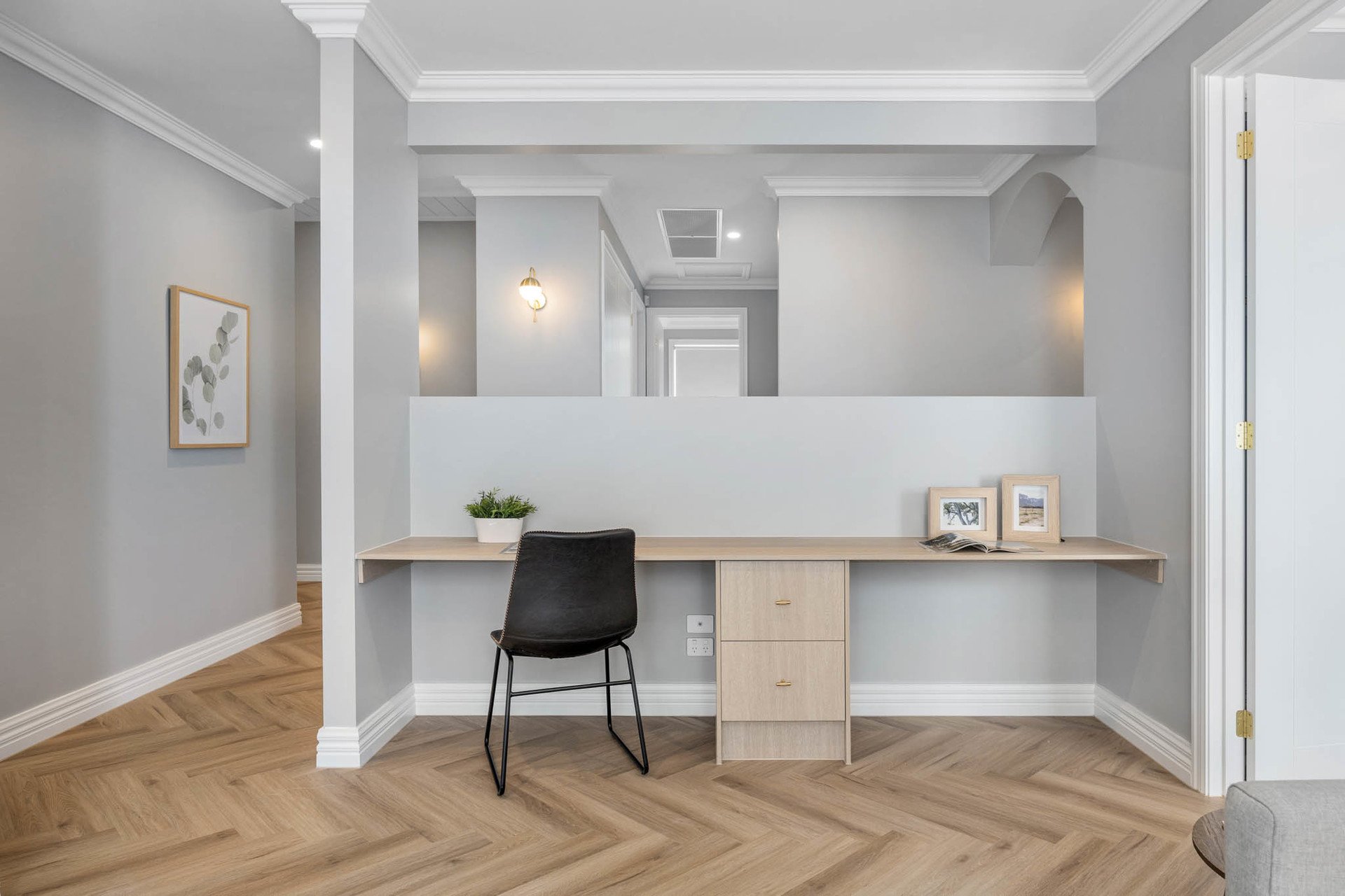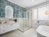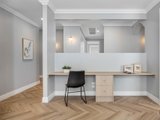 Accommodation comprises four robed bedrooms, highlighted by a decadent main suite with twin dressing rooms and a sumptuous ensuite with double shower, stone vanity, backlit mirror and bath. A fully tiled central bathroom of opulent design is graced by a floating fluted stone vanity, bath, and shower, while a powder room heightens amenity. A study with twin inbuilt desks offers a superb work-from-home setting.
