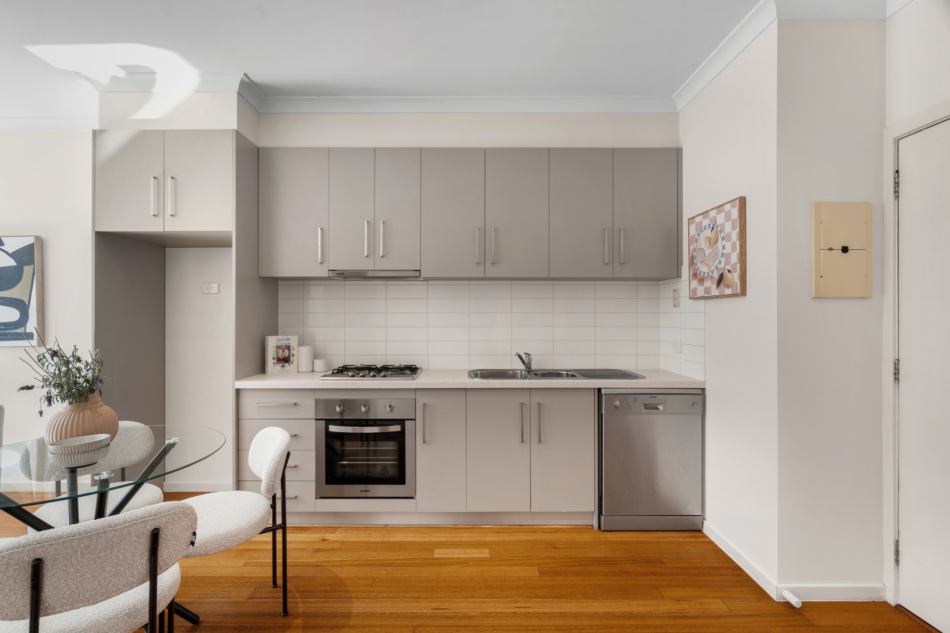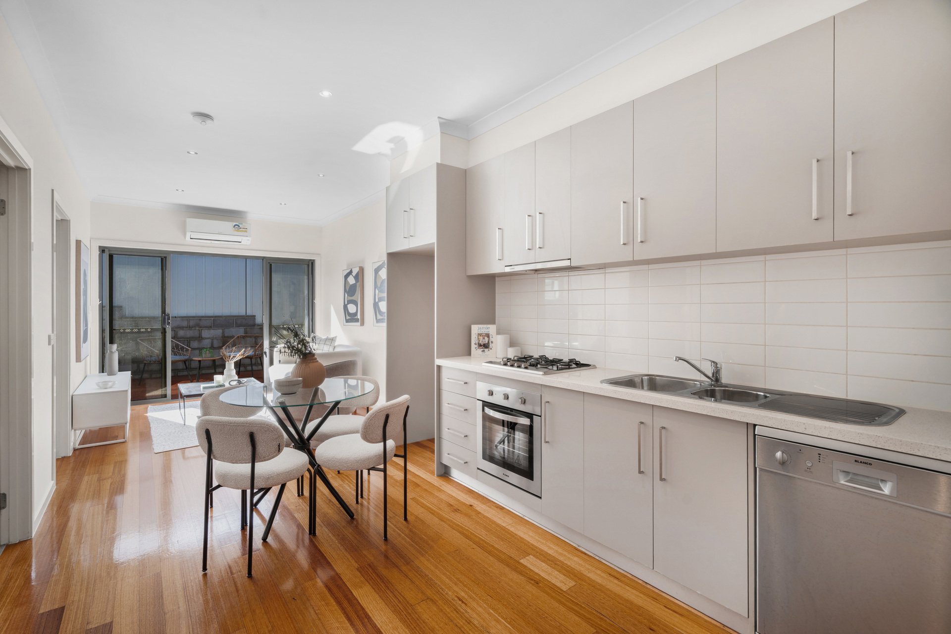 Polished floorboards, Blanco kitchen appliances and sleek stone benches illustrate the quality and care at the core, with open plan design progressing from a kitchen and meals area to a sunny living zone.
