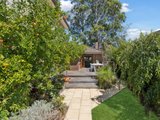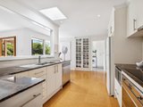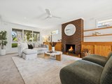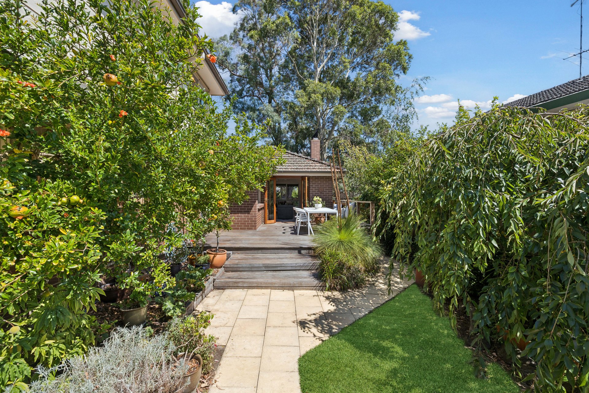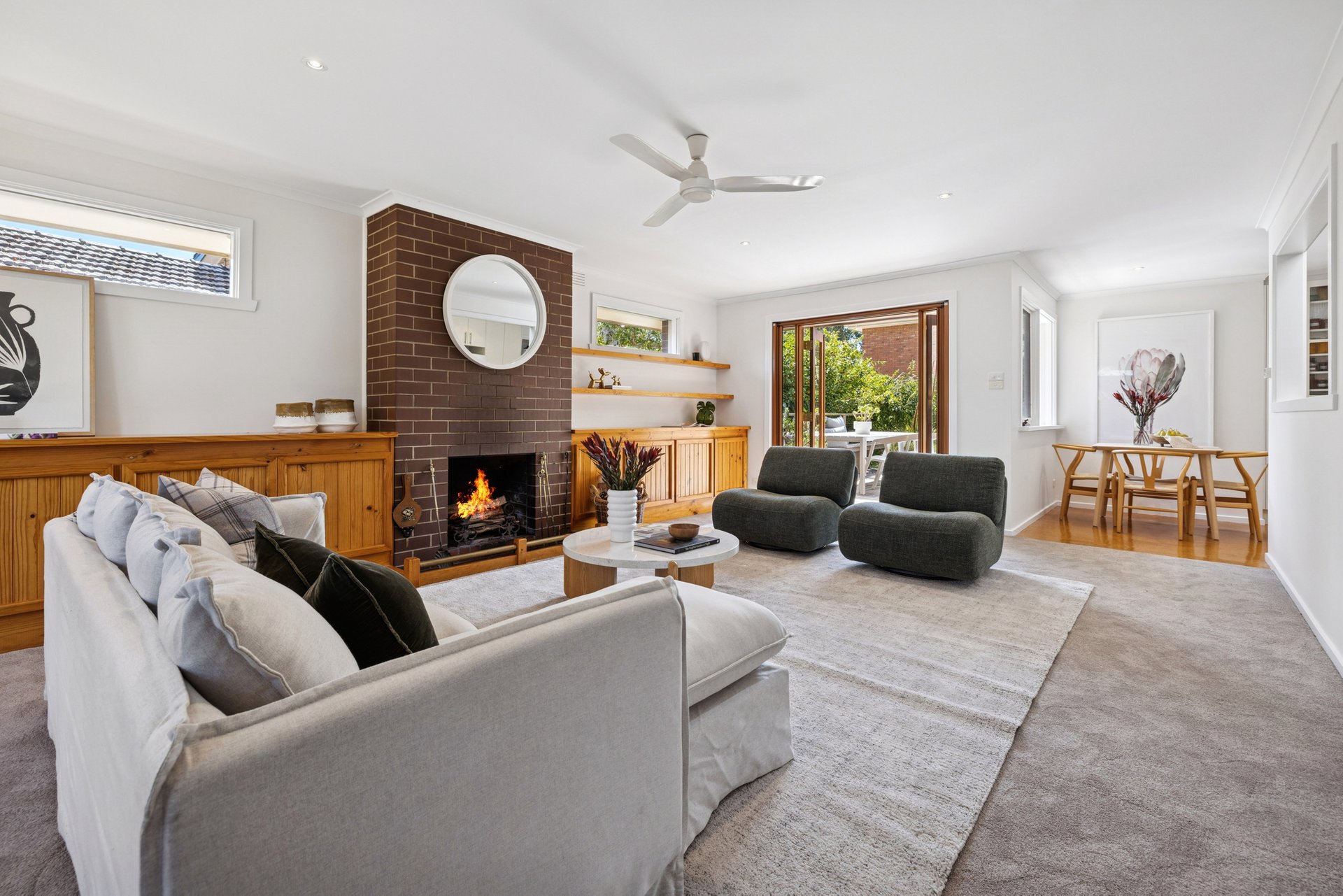 The entry leads into a generous living and dining room before connecting to a stone-topped kitchen with induction cooktop and dishwasher. Beyond, a separate meals area and family room with open fireplace and split-system air conditioning extend through double French doors to a sunny deck framed by established greenery. The north-facing rear garden captures long afternoon light, includes a water tank, vegetable garden, fruit trees and offers ample lawn for hours of outdoor play.