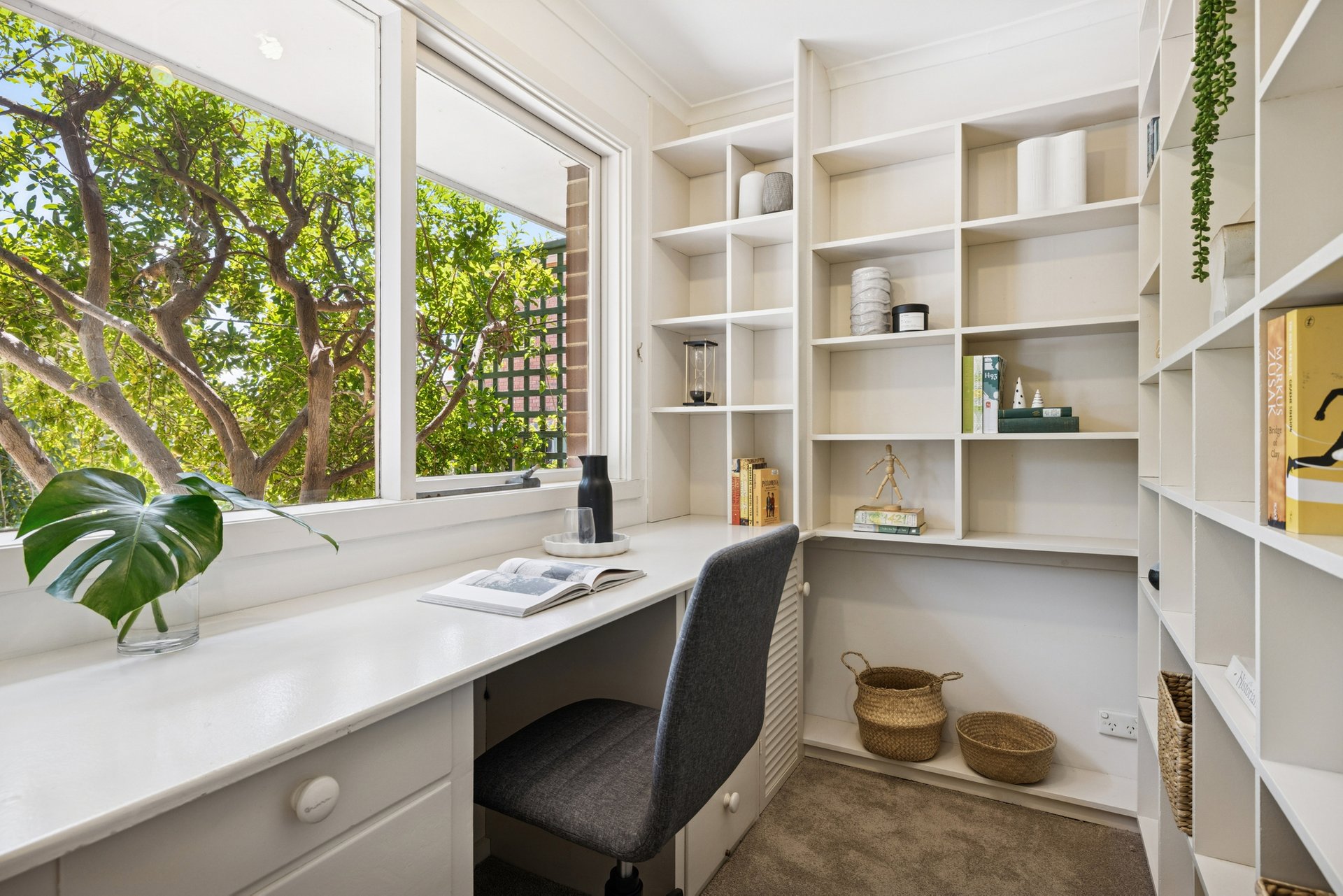 Downstairs, two bedrooms both with built-in robes are serviced by a bathroom with bath, shower and separate toilet. A fitted home office with desk, shelving and peaceful green outlooks is tucked well away from the main living areas, under stairs storage and a laundry completes the lower level.