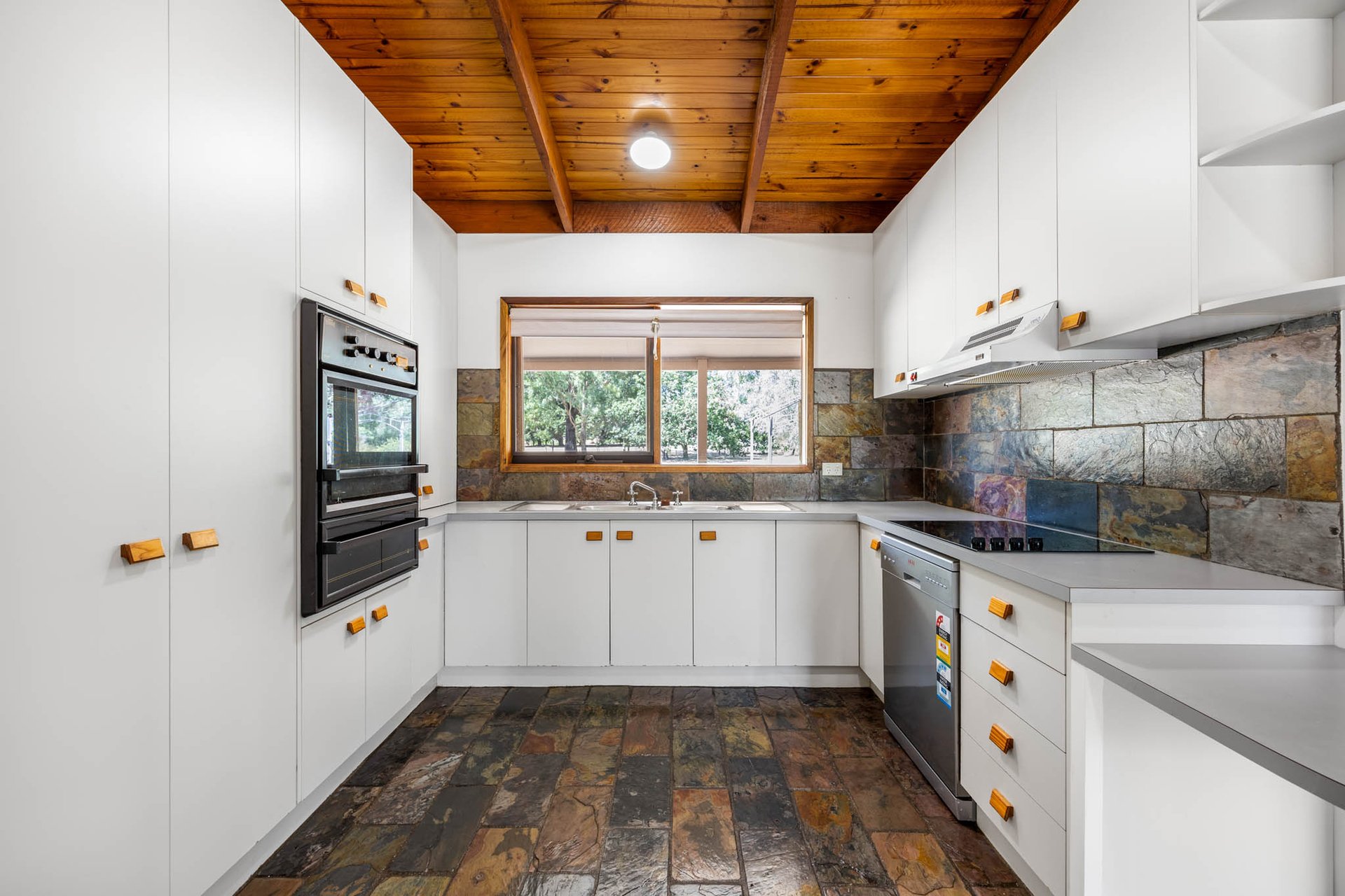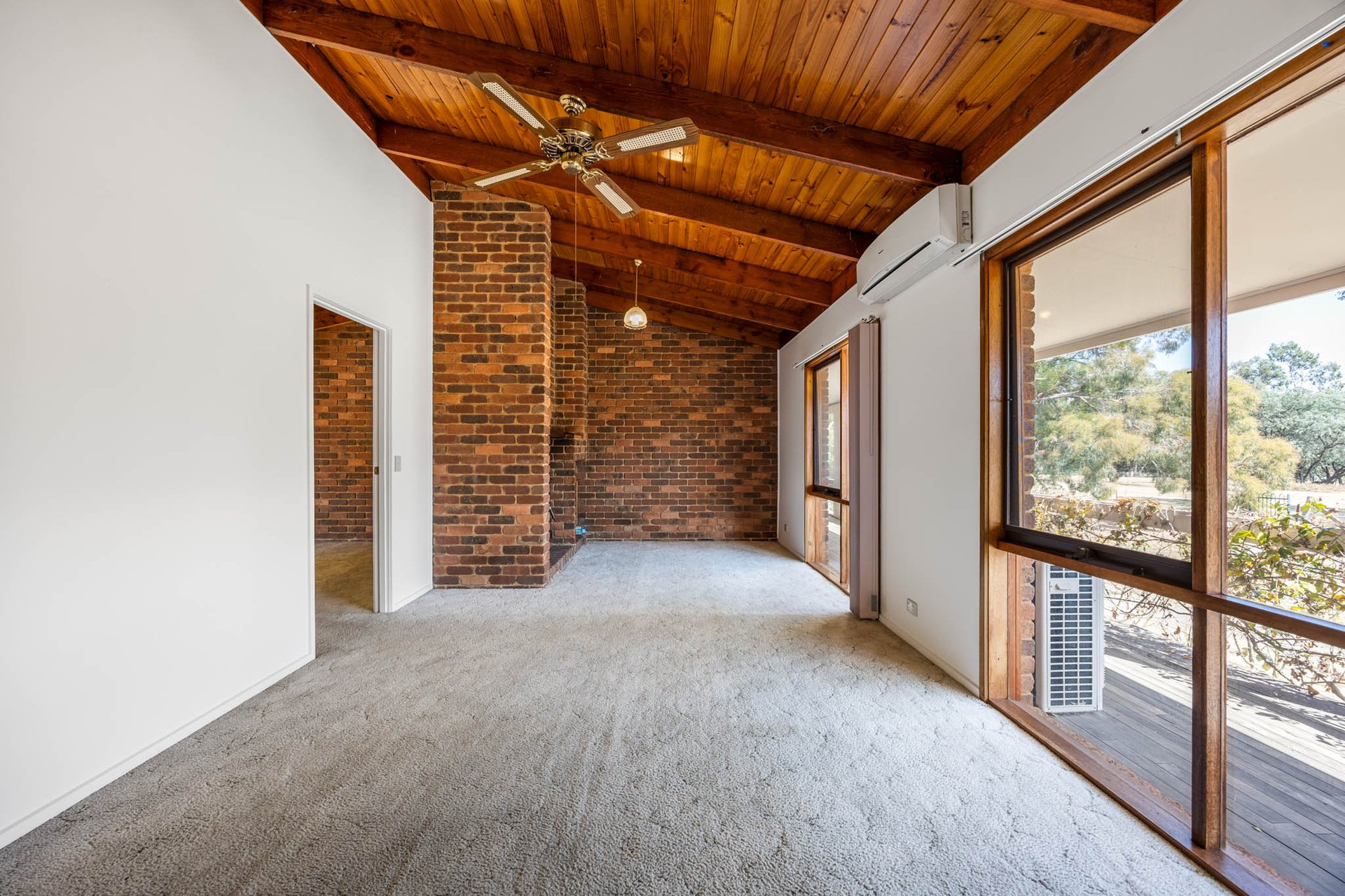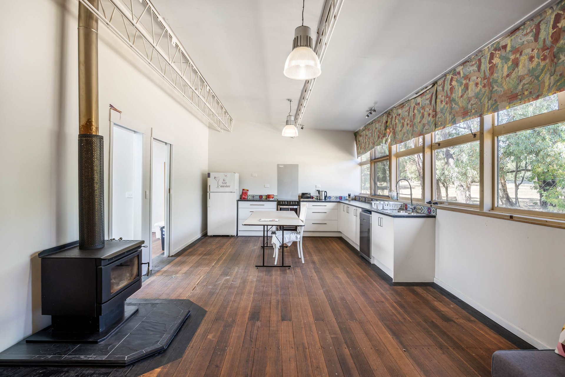 Extravagant residence-width verandas span the front and rear, purposefully oriented to capture north-facing Mount Macedon views and allowing the stunning landscape to become part of daily life. The kitchen is well appointed with a Vulcan wall oven/grill, electric cooktop, and a dishwasher. A lounge highlighted by an exposed brick feature wall and a wood-fuelled fireplace delivers inviting warmth.