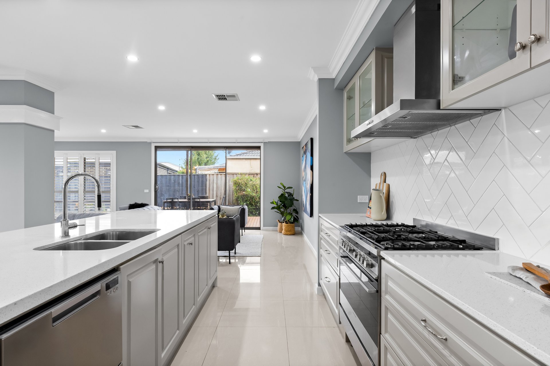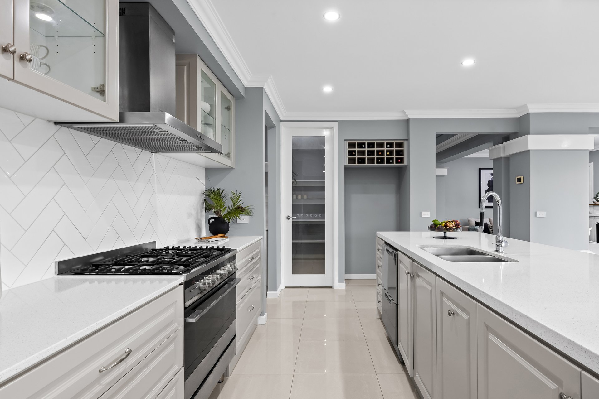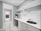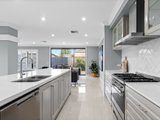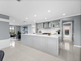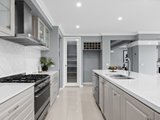 The kitchen is a chef’s dream, featuring high-end Fisher & Paykel appliances, a five-burner gas cooktop, and beautiful speckled white stone benchtops. It also boasts a Butler's Pantry with a sink, and a walk-in pantry for added storage. The kitchen overlooks a large dining and family room, which seamlessly connects to the generous alfresco area – perfect for entertaining.