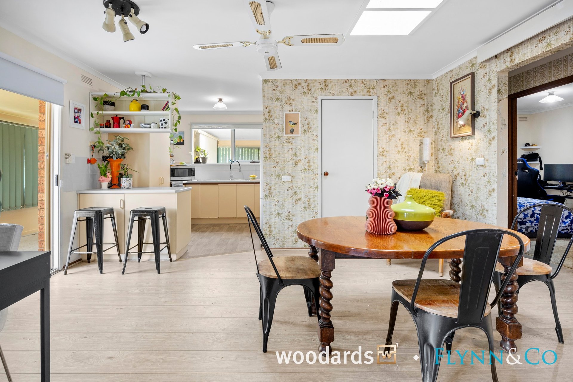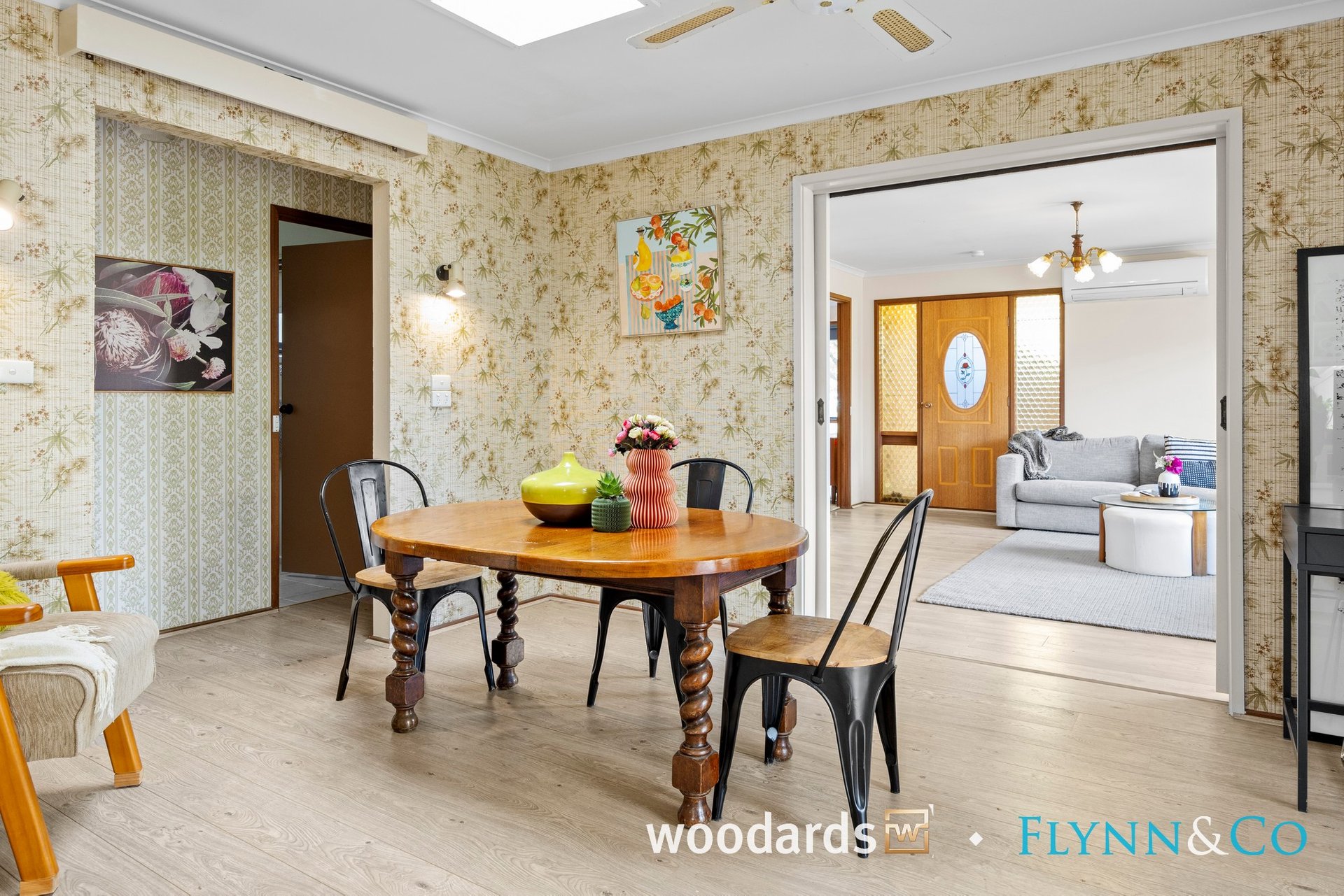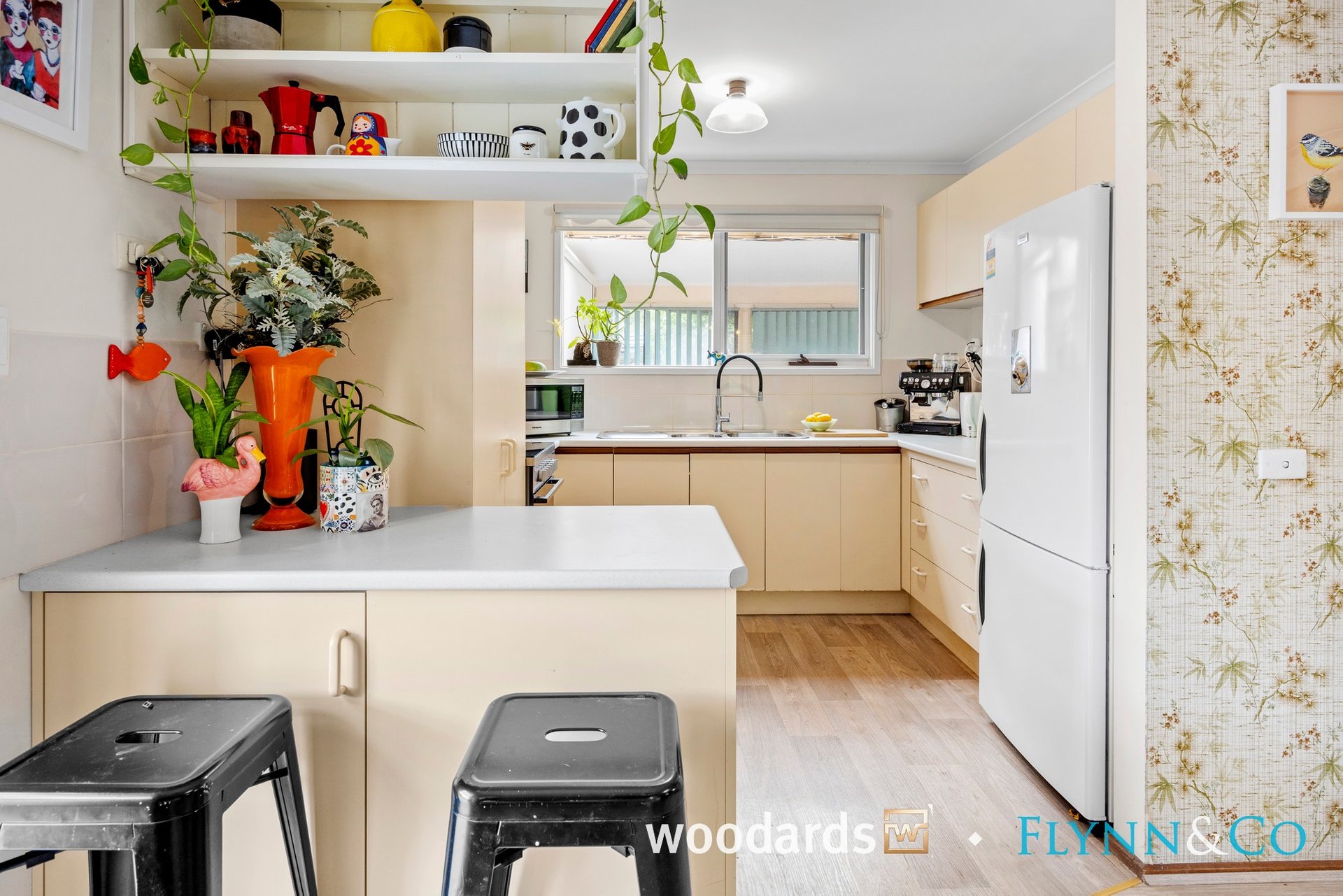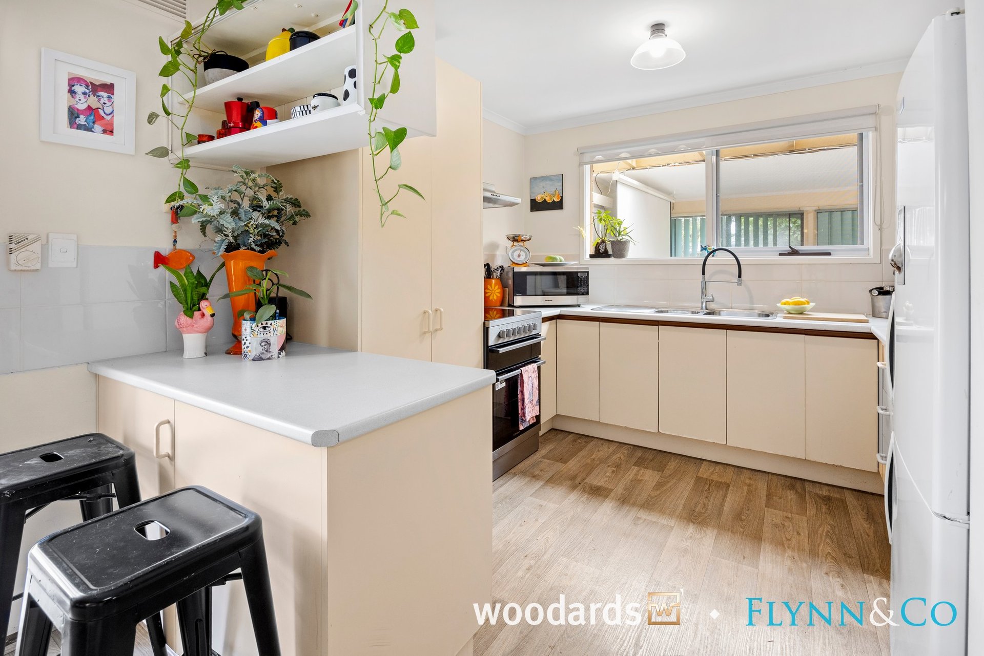 Step inside to discover a spacious living room bathed in natural light, where large windows frame private, leafy garden outlooks and timber-look flooring adds warmth and continuity throughout the main living spaces. This is a home that immediately feels comfortable, calm and welcoming.