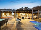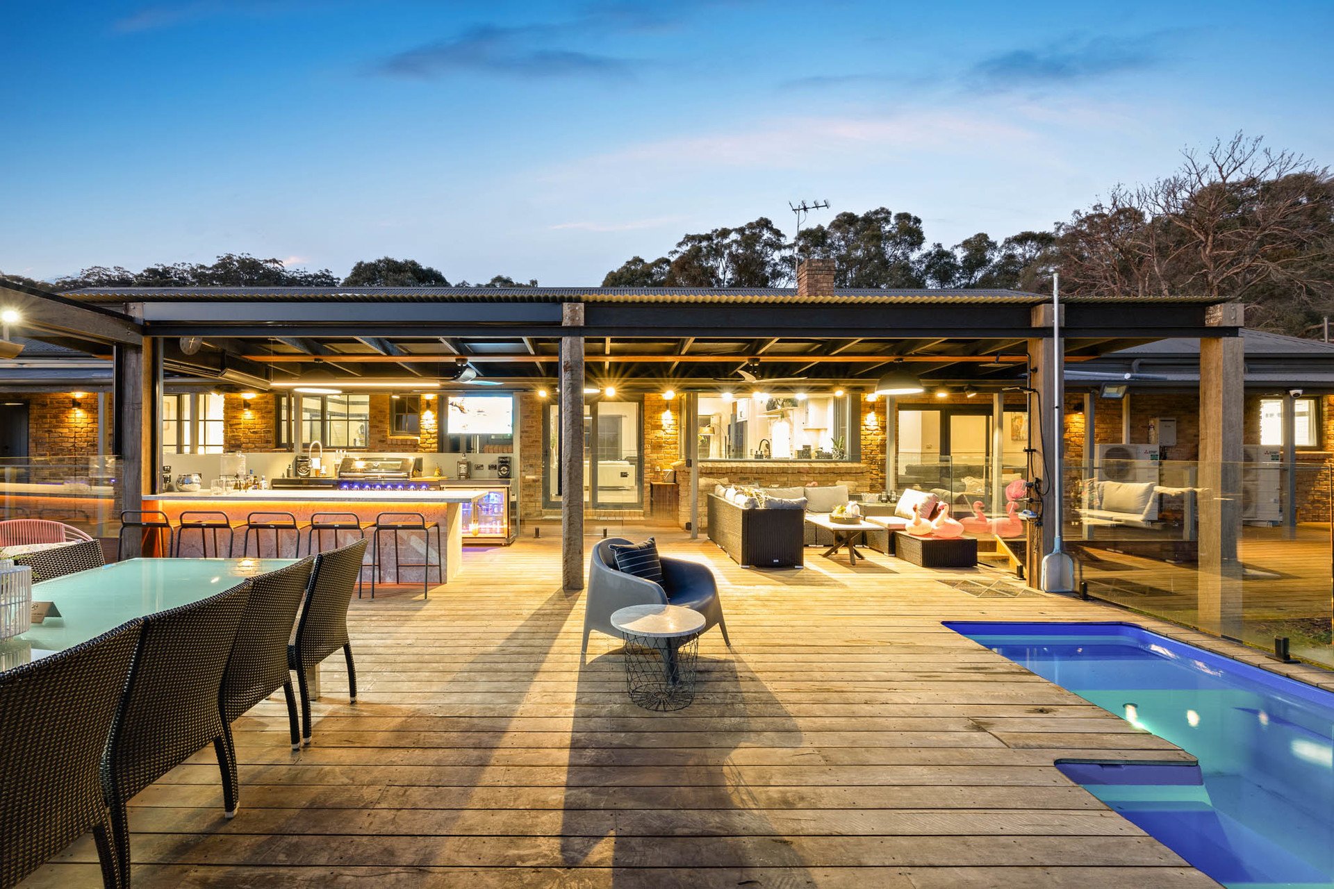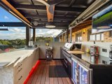 The residence is enveloped by outdoor entertaining areas of scale and quality. The back deck is enclosed by frameless glass fencing and overlooks the stunning mineral water pool which includes LED lights and heat pumps. Featuring a full outdoor kitchen with, double size sink, 6-burner BBQ with wok burner, ceramic heaters, power, lighting, and bistro blinds, it's the ultimate outdoor entertaining domain. Complimented by the adjoining bar with stone top and surrounds, LED lighting, bin drawers, integrated dishwasher and drop down T.V. this is an entertainers delight. The verdant grounds also include a firepit zone with extra features including commercial-grade ducted reverse cycle air conditioning operated via phone, a concealed pool roller cover, and underdeck storage.