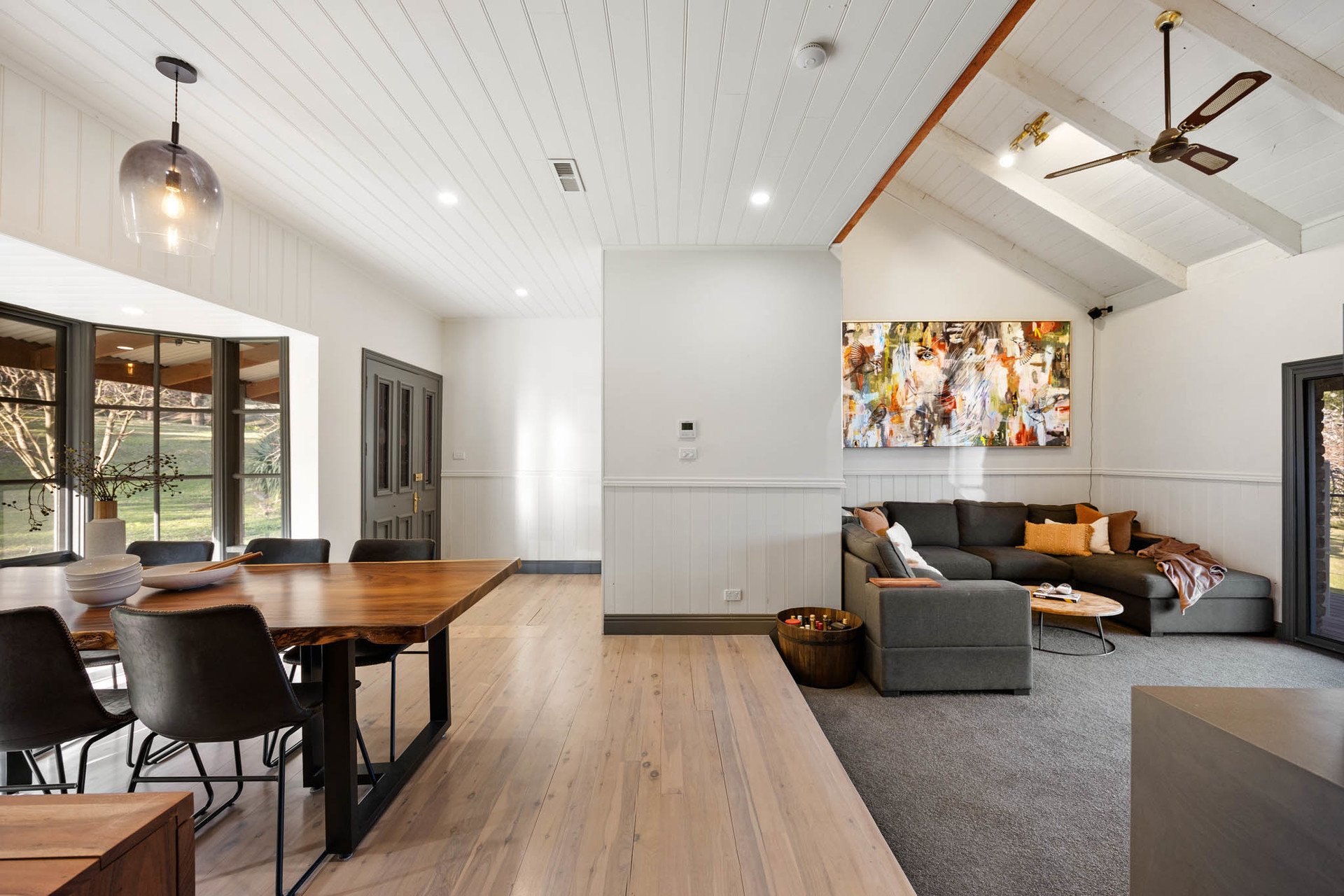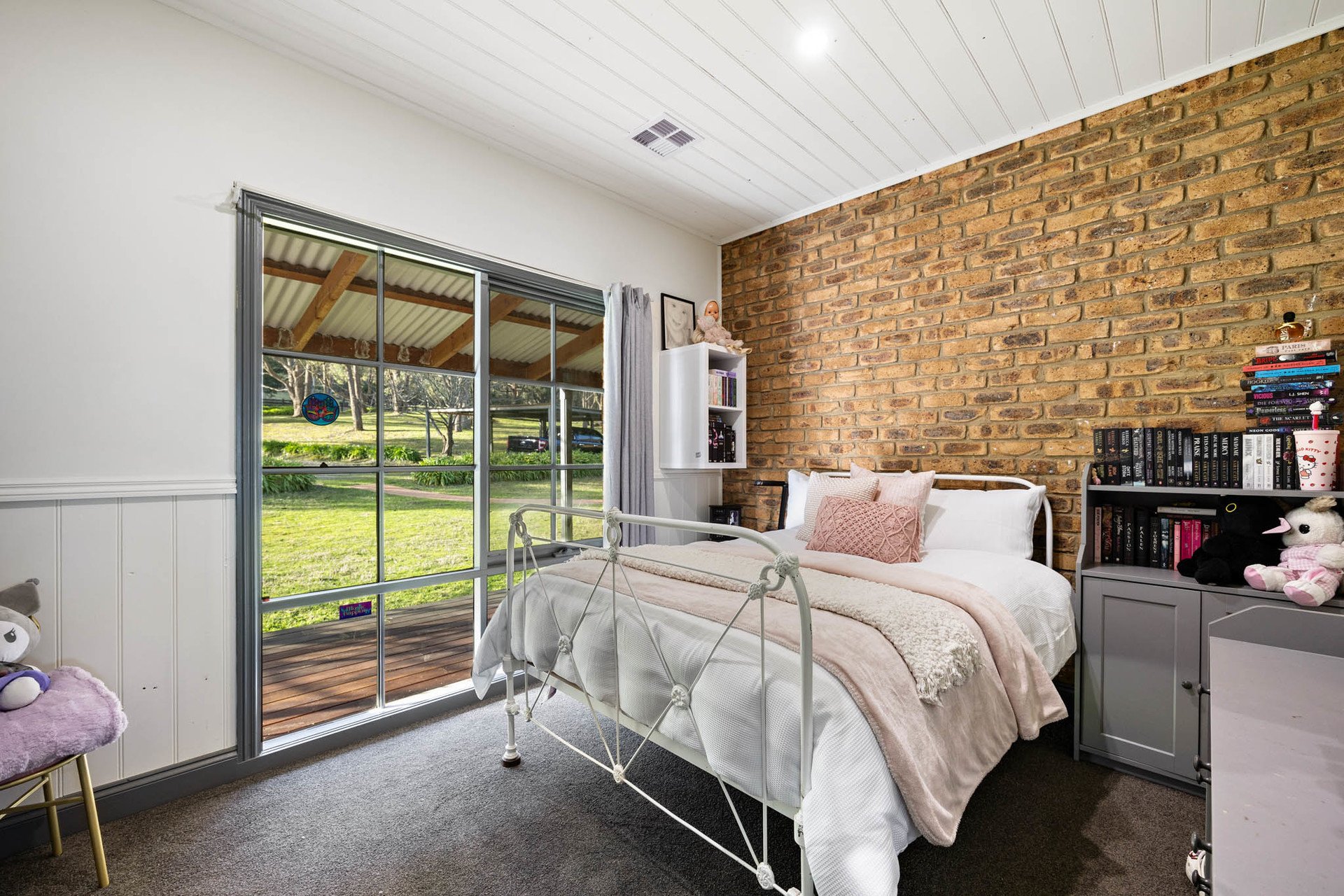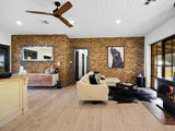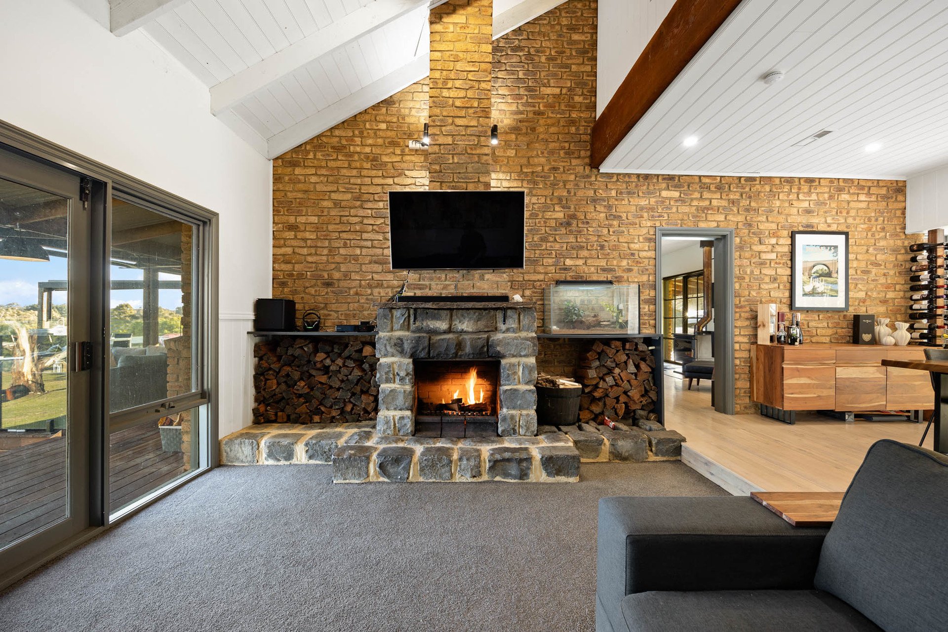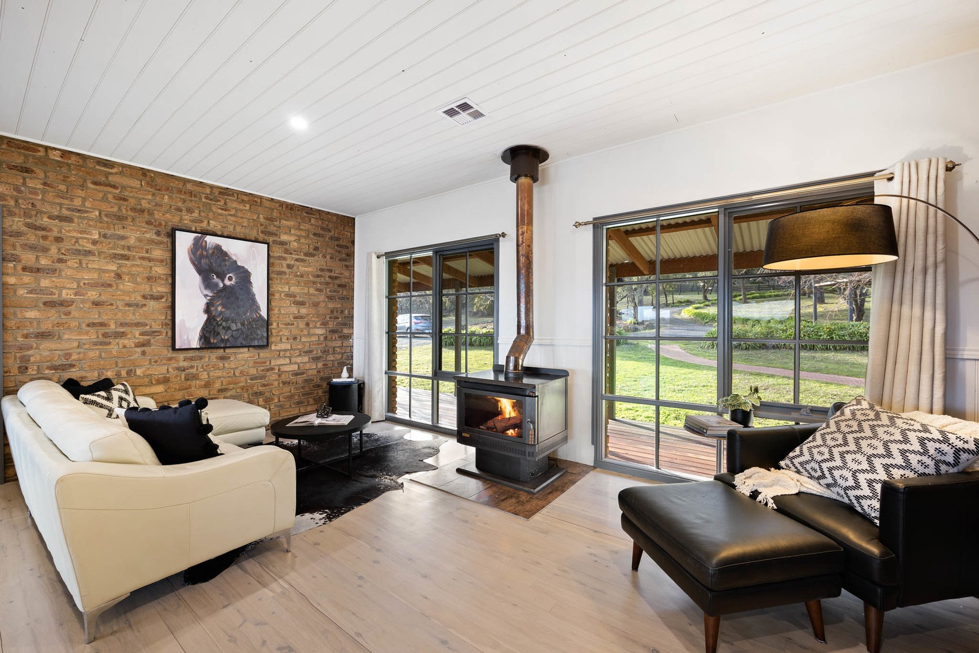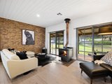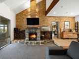 A wide spotted gum wraparound deck embraces the home, framing a design that is both grounded and elevated in its material palette. Entry is via a leadlight door, opening to distressed timber floors and exposed brick interiors that evoke warmth and substance. The main lounge and formal dining areas centre around a gorgeous bluestone fireplace and open directly to the back deck, while a 2nd living area with a Coonara and meals area adjoin the kitchen.
