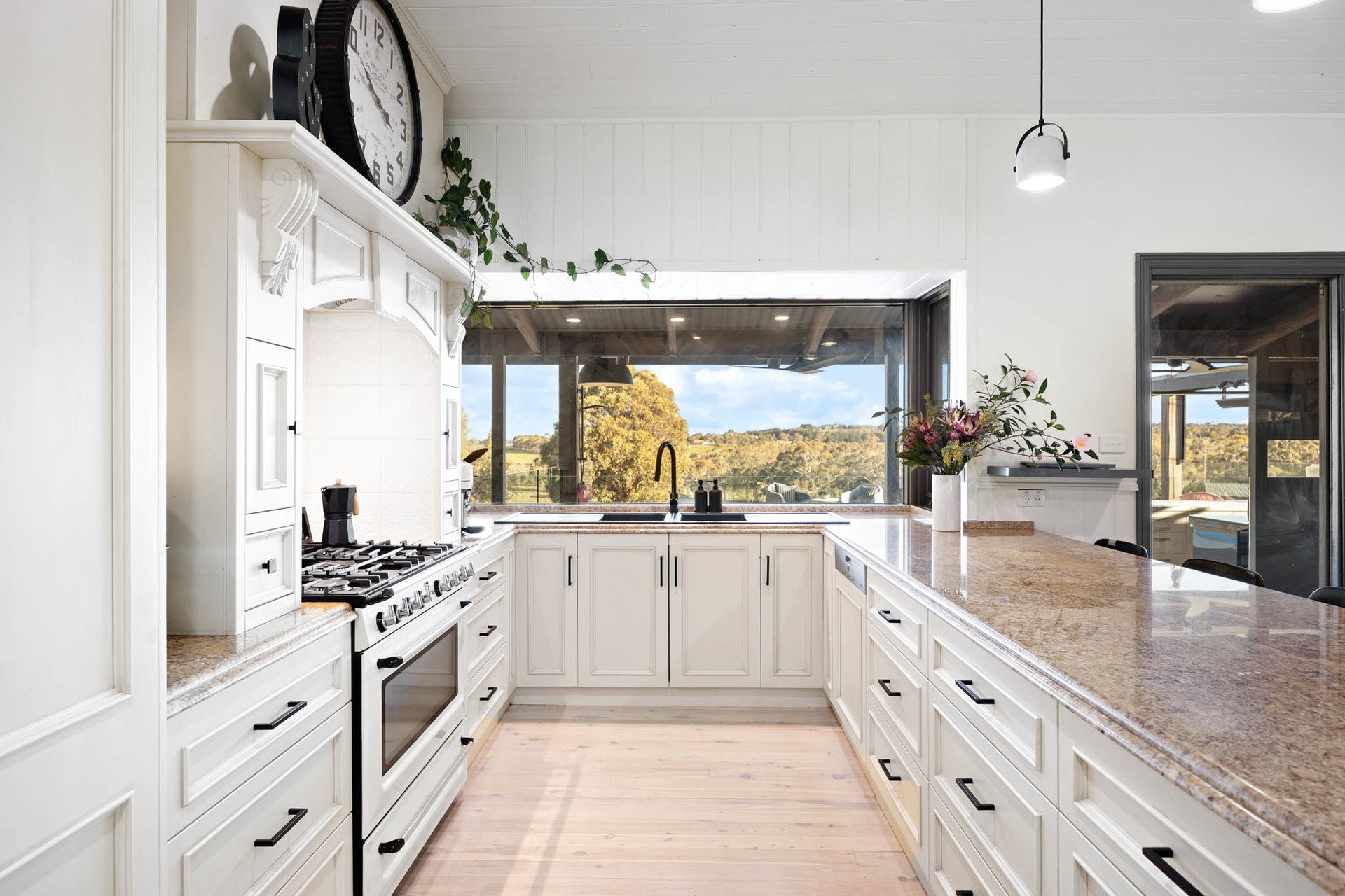 Expressing sheer elegance, the French Provincial kitchen showcases swathes of granite accompanied by soft-close drawers, a 900 mm Smeg upright oven, and Miele dishwasher, complemented by panoramic windows overlooking the pool and valley beyond. Meanwhile, a large family/rumpus room off the primary accommodation wing includes a custom built-in desk for home office use, handy 3rd bathroom, and separate deck access.