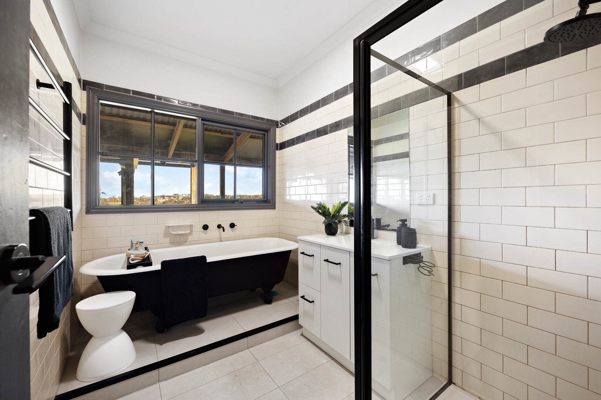 Accommodation includes five generous bedrooms, each carpeted and robed, and capturing garden or district views. The master retreat includes a walk-in robe and a luxe ensuite in a classic monochromatic scheme with a twin vanity and a double shower. The central bathroom expresses the same classic theme and includes a clawfoot bath.