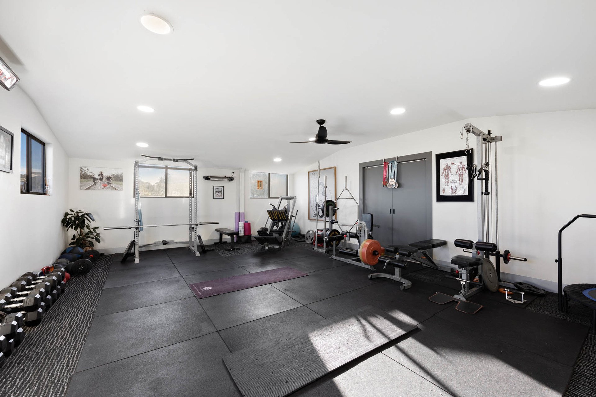 A separate double garage with a fully insulated and fan-ventilated rear studio space and space heaters offers gym potential all year round