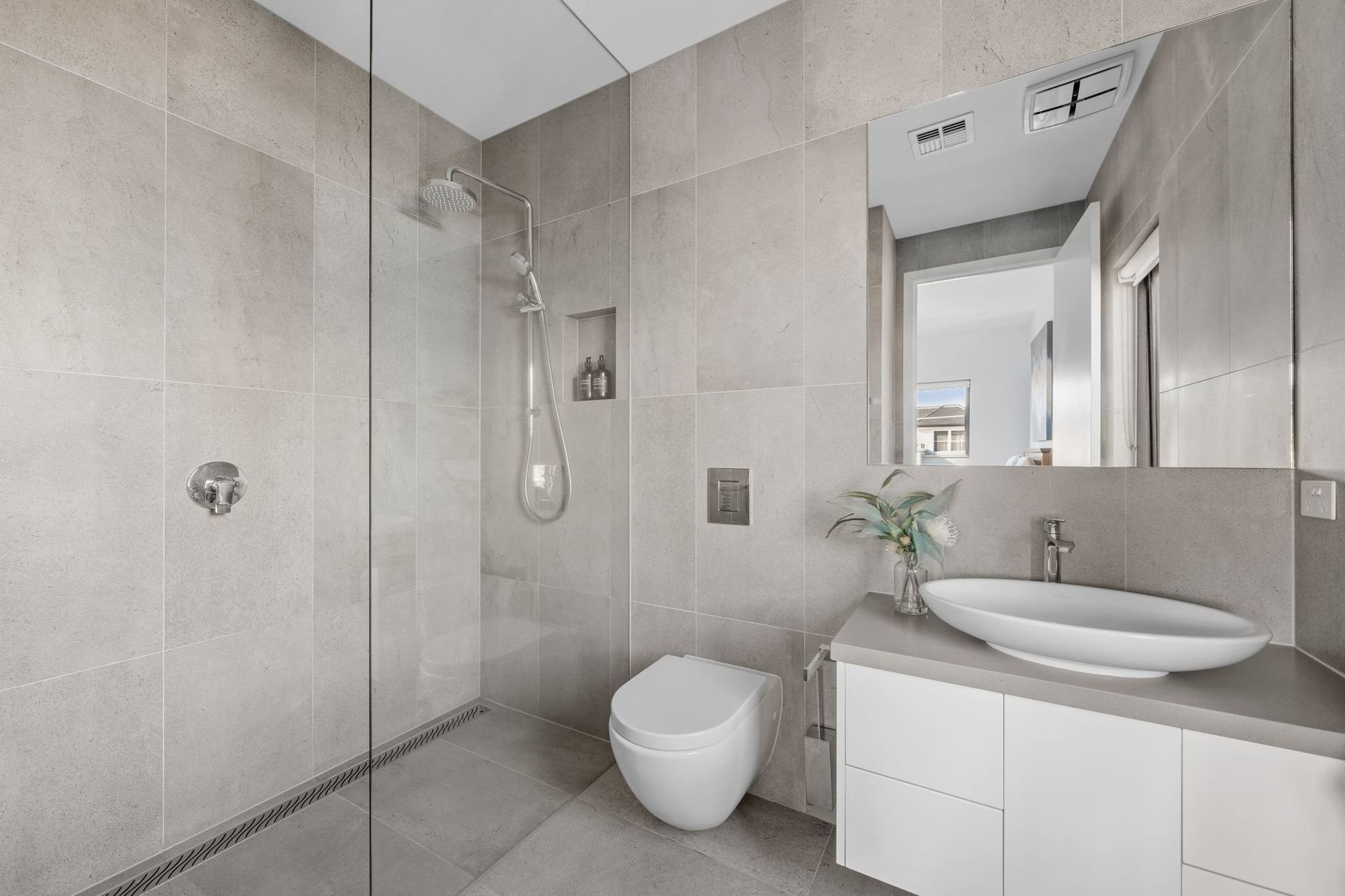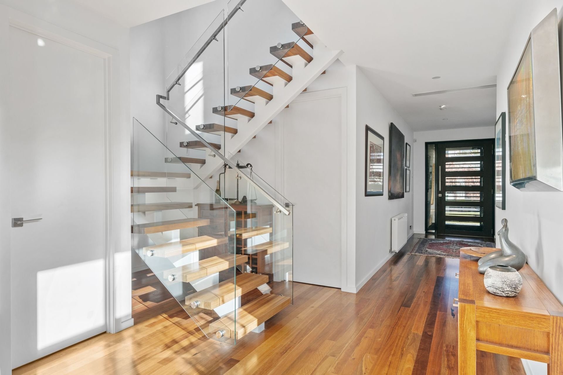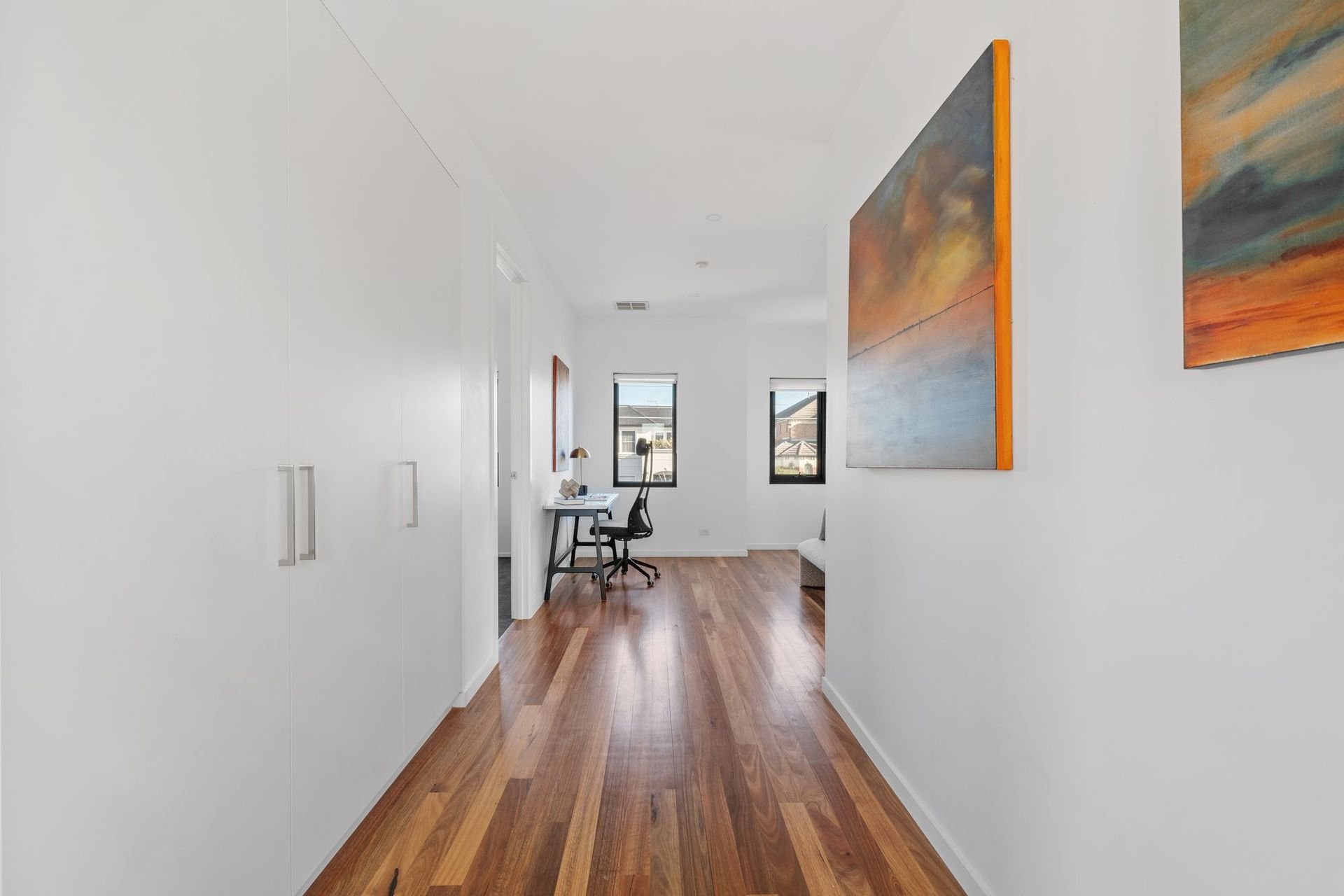 Premium features include 19mm solid Queensland Spotted Gum floorboards, hydronic heating, zoned refrigerated cooling and reverse cycle heating (Daikin), a full-size laundry, three designer bathrooms plus a guest powder room, solar panels, and a remote double garage with internal access.
