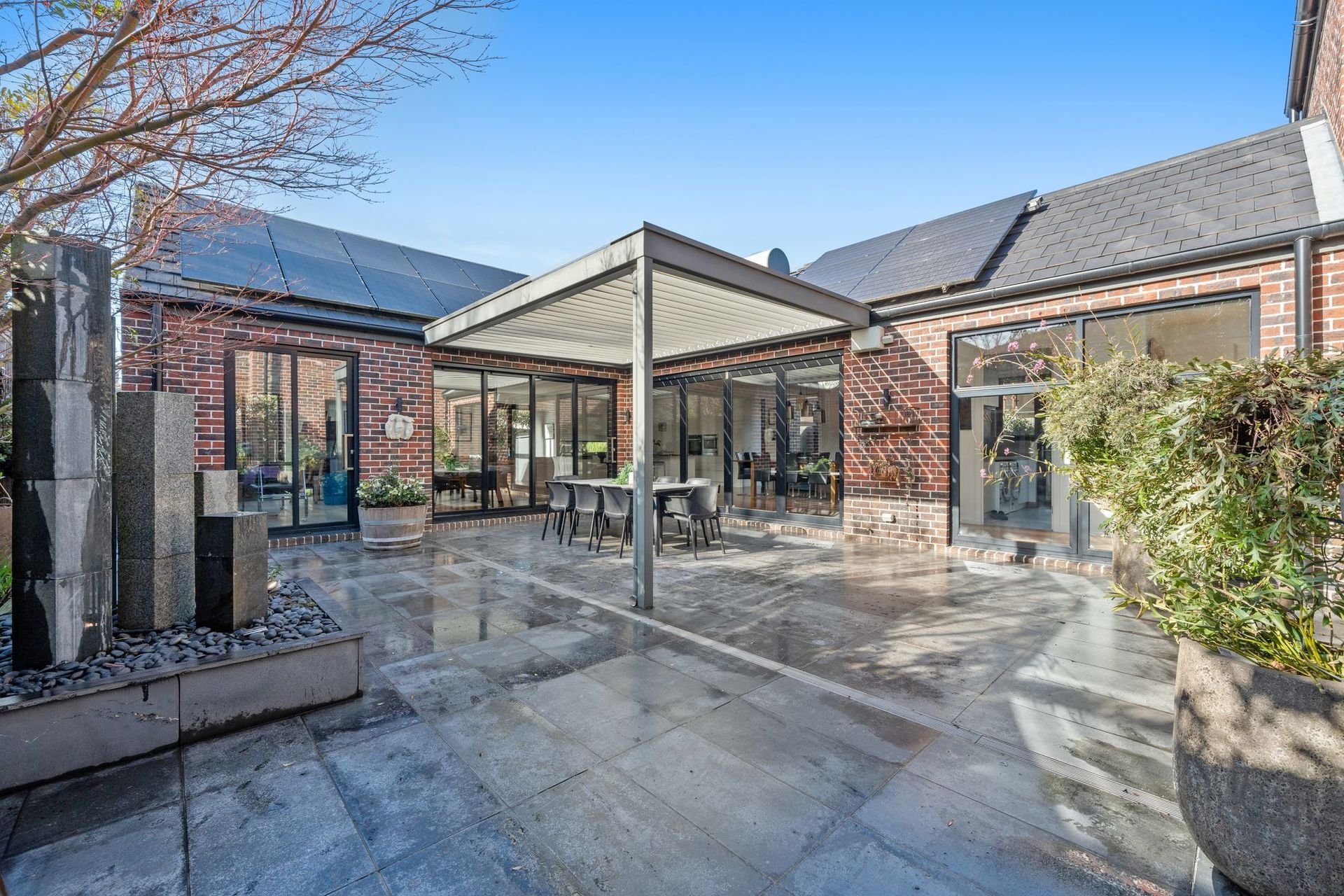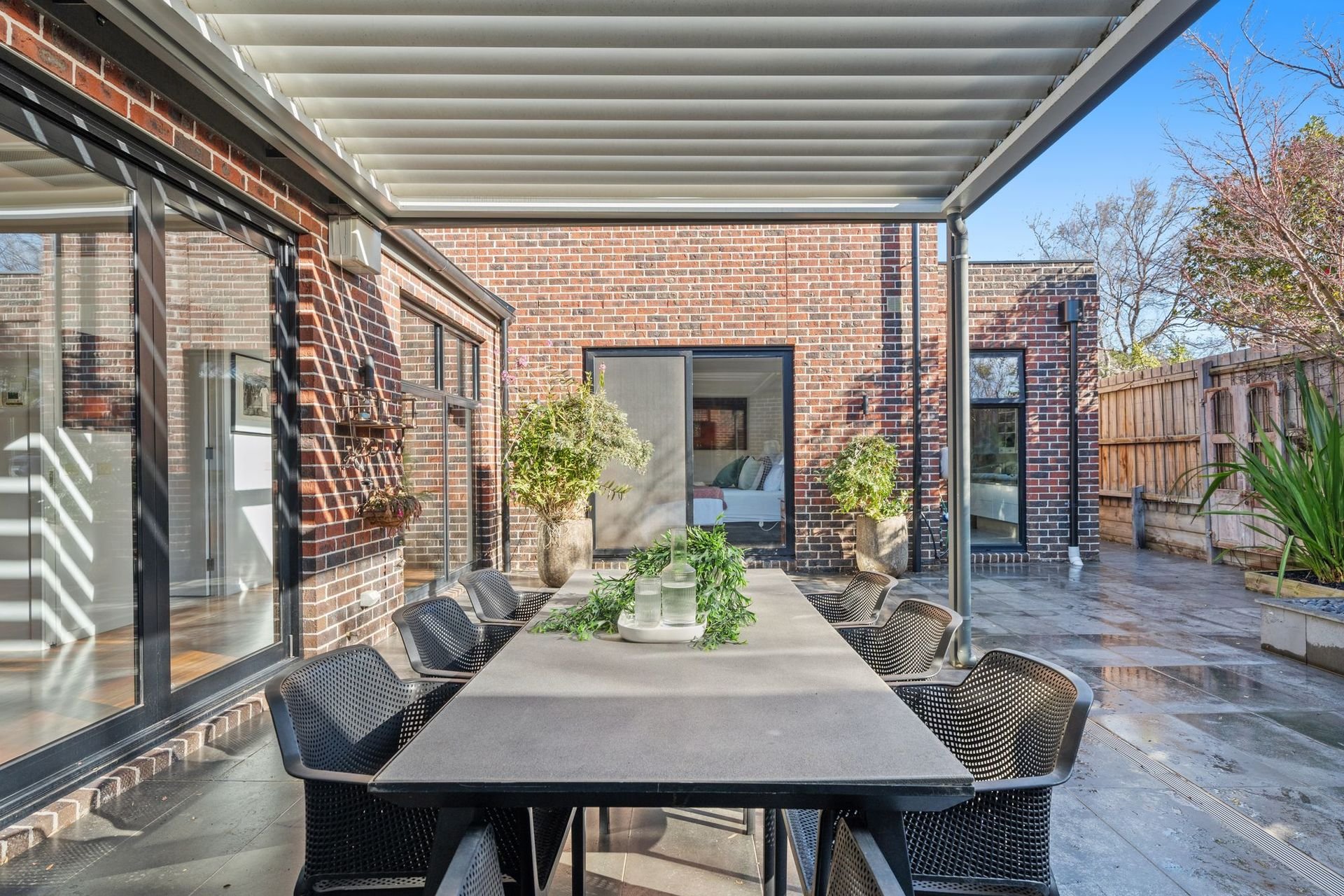 Glass doors open to a north-facing outdoor zone with a Vergola-covered alfresco, tranquil water feature, and landscaped gardens, ideal for entertaining year-round.