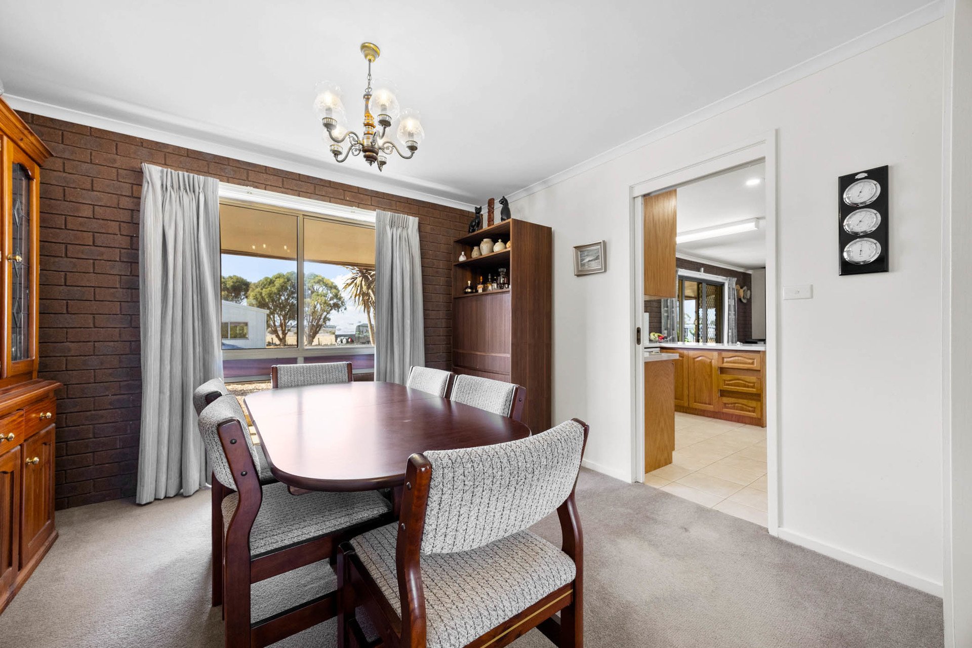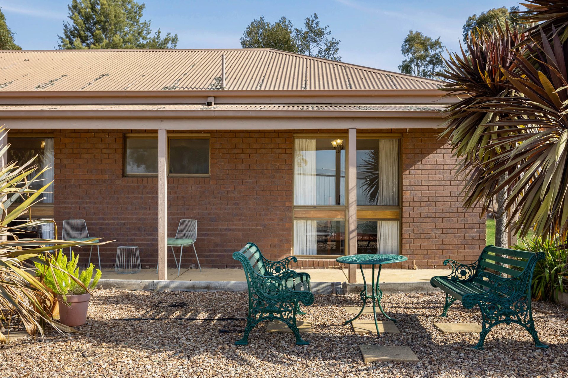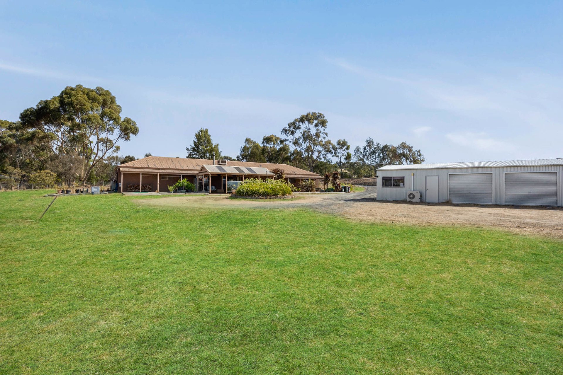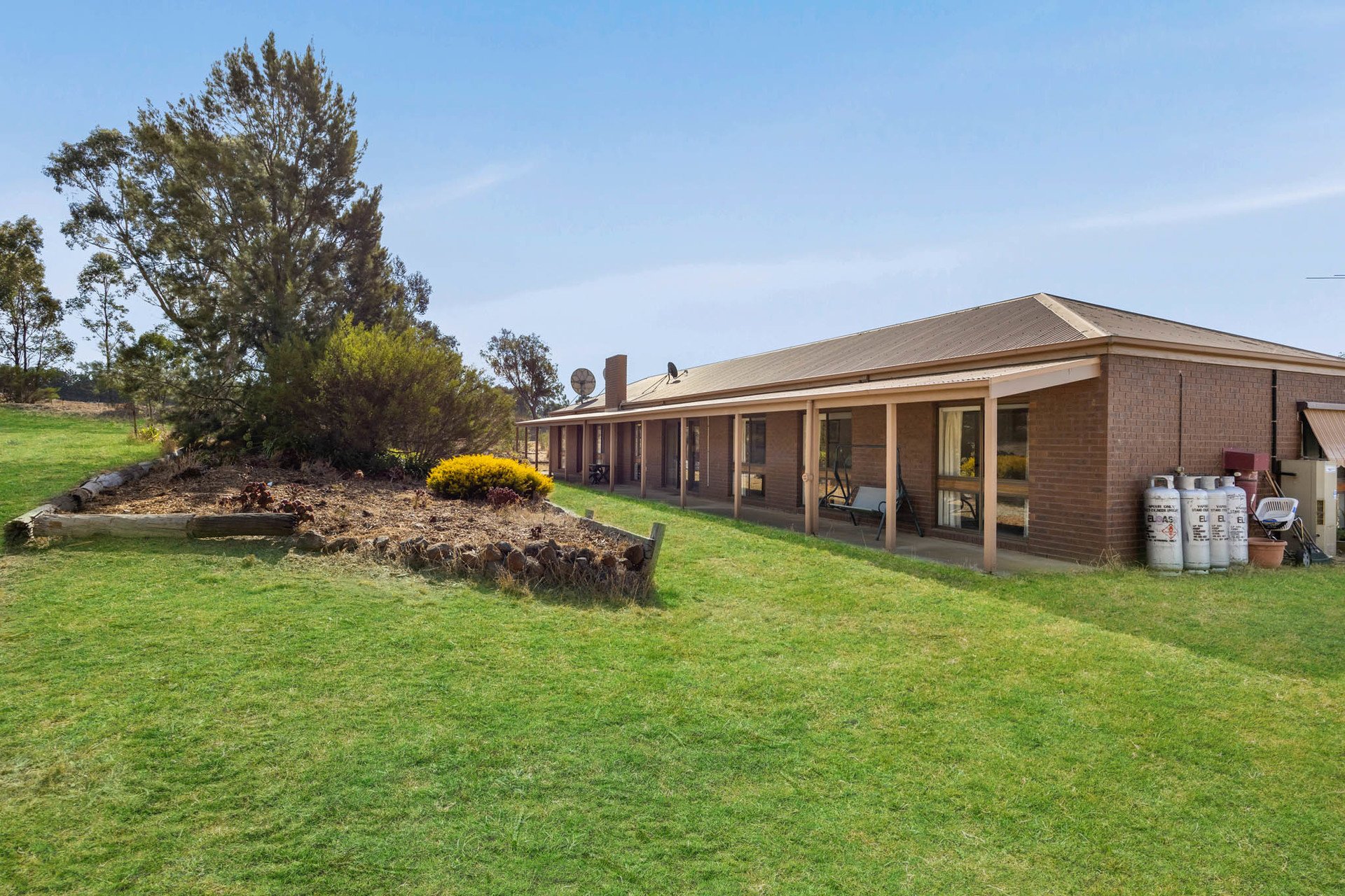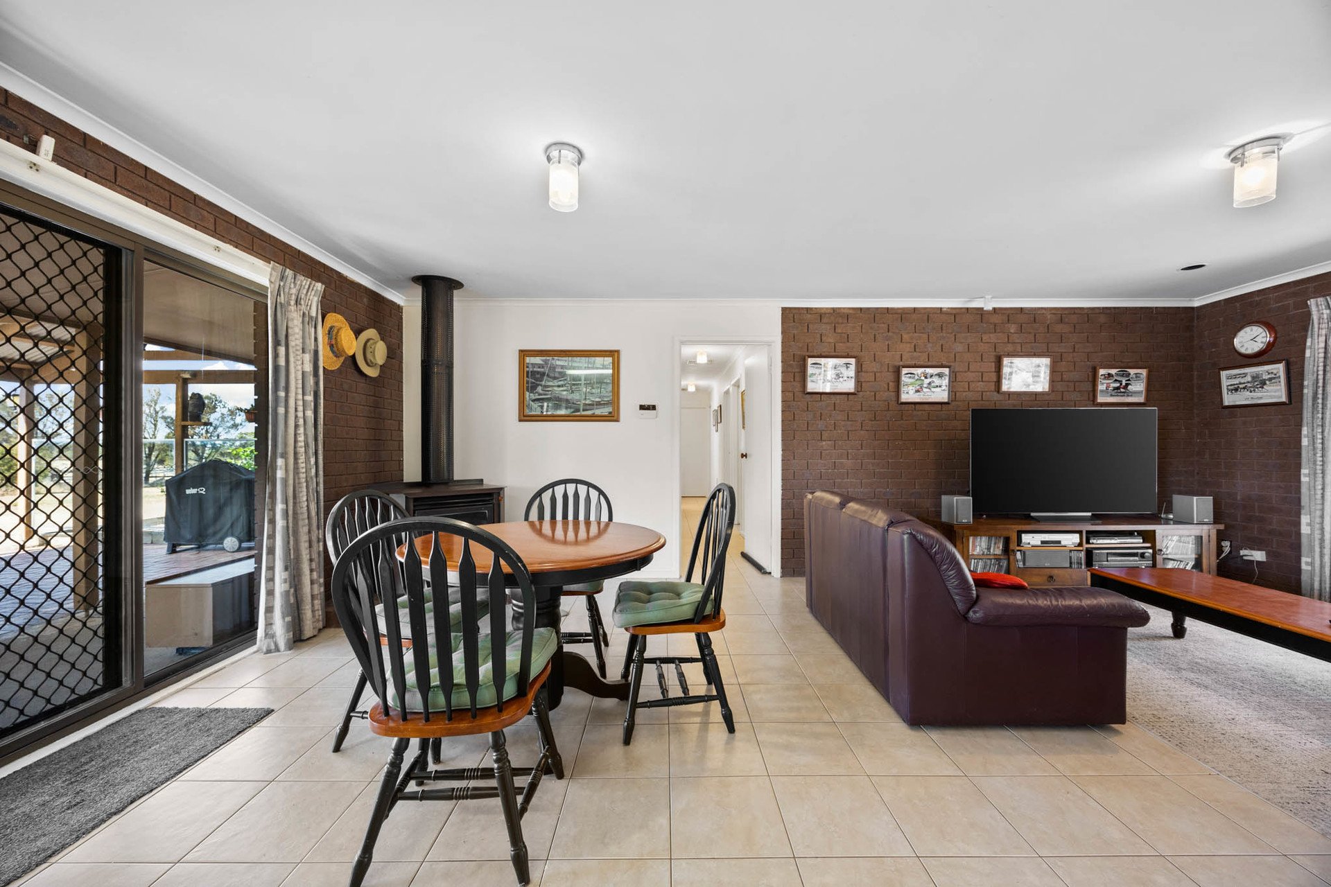 An inviting family home forms the heart of the estate, where open-plan living spaces embrace warmth and character. A lounge with an open fireplace, a dining area, and a breakfast room with a wood-fuelled heater provide relaxed living, while the recently renovated country-style kitchen is finished with stone surfaces, timber cabinetry, an electric wall oven/grill, a gas cooktop, and a dishwasher.