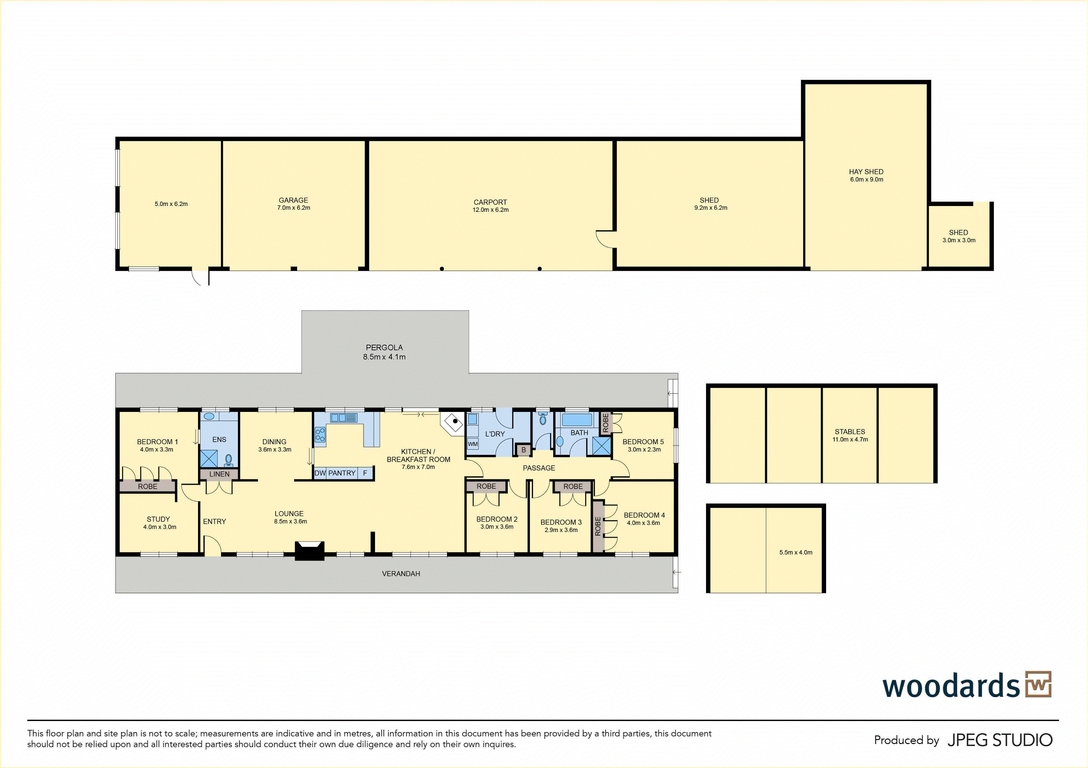 Expansive verandas to both sides of the residence and a large pergola seamlessly connect the home to its picturesque natural surroundings. Accommodation comprises five robed bedrooms, including a master retreat with an ensuite, while a central bathroom with a bath, shower, and separate toilet serves the remaining bedrooms. A large study offers a private space to work-from-home, and a separate retreat/studio with an air conditioner enhances versatility. Additional modern comforts include evaporative cooling and split system heating/cooling.