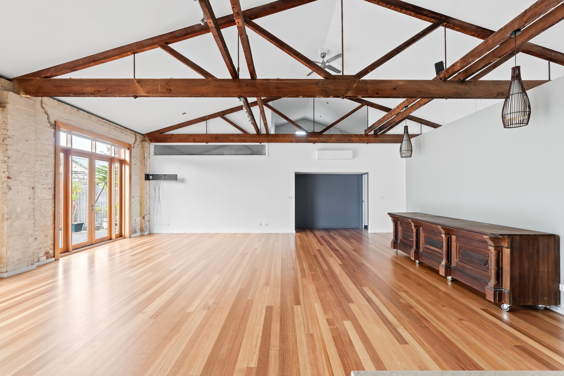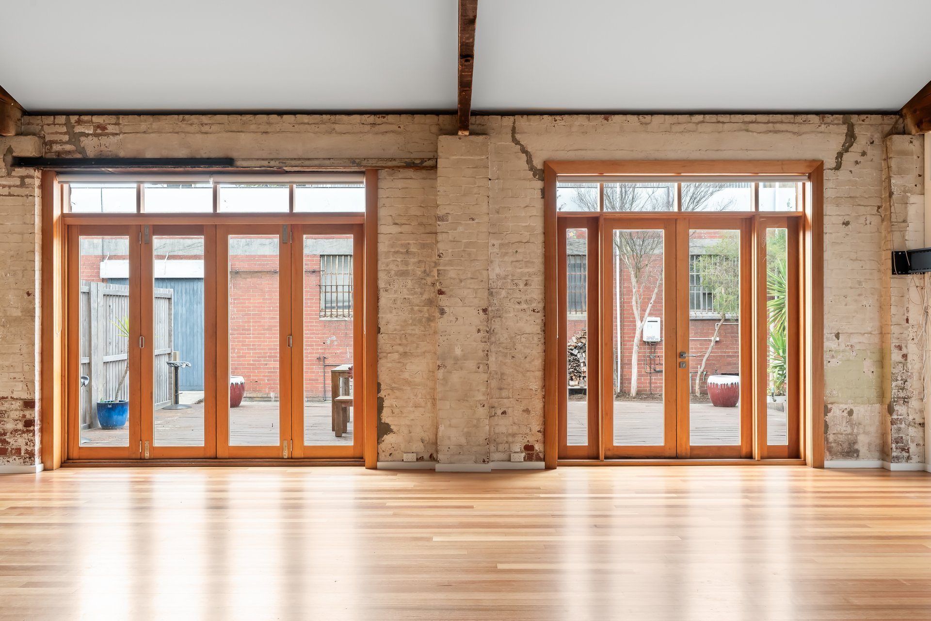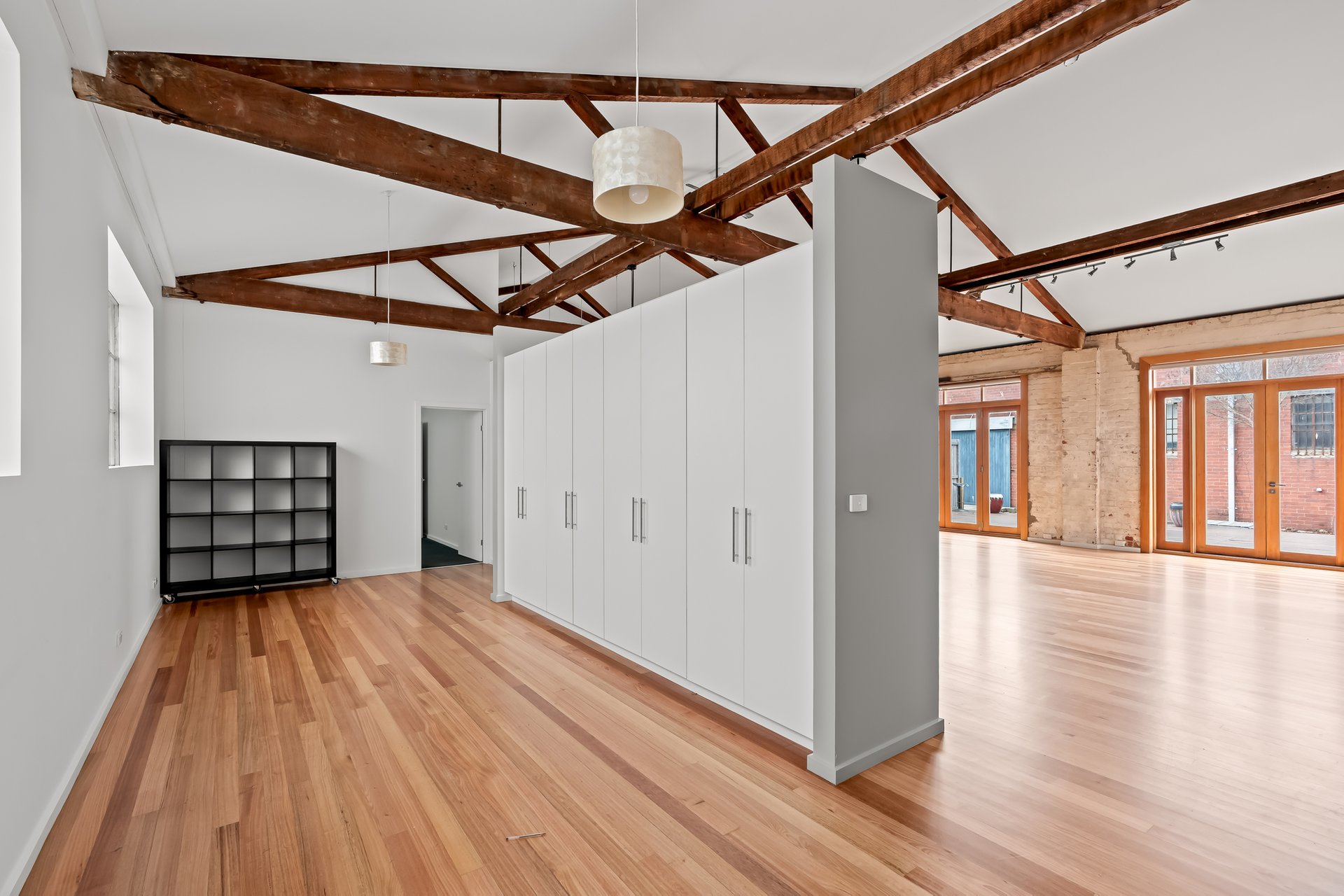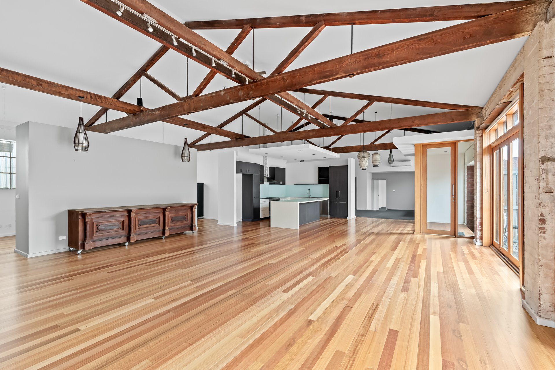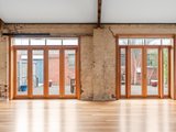 • Original industrial windows and exposed trusses.