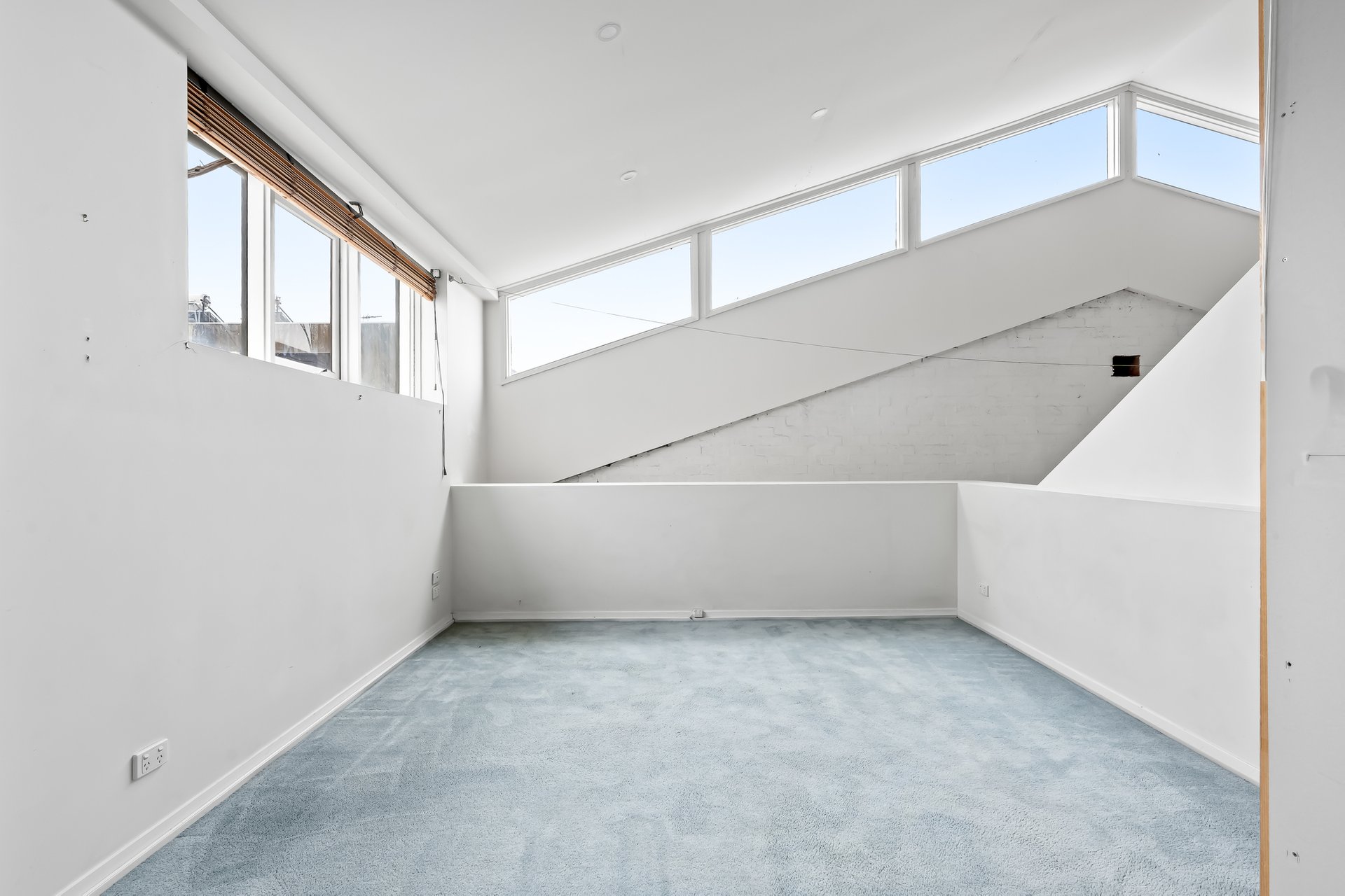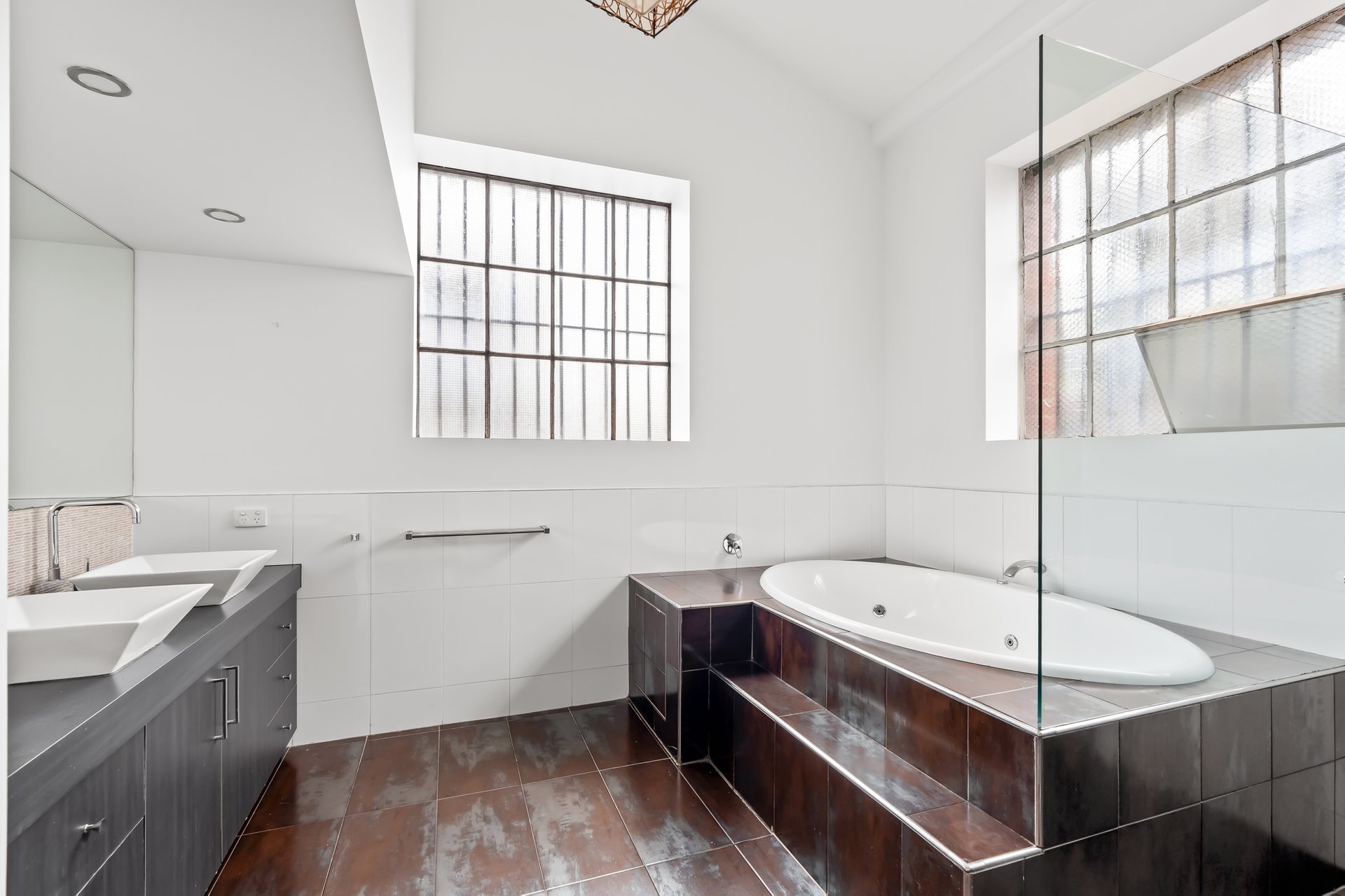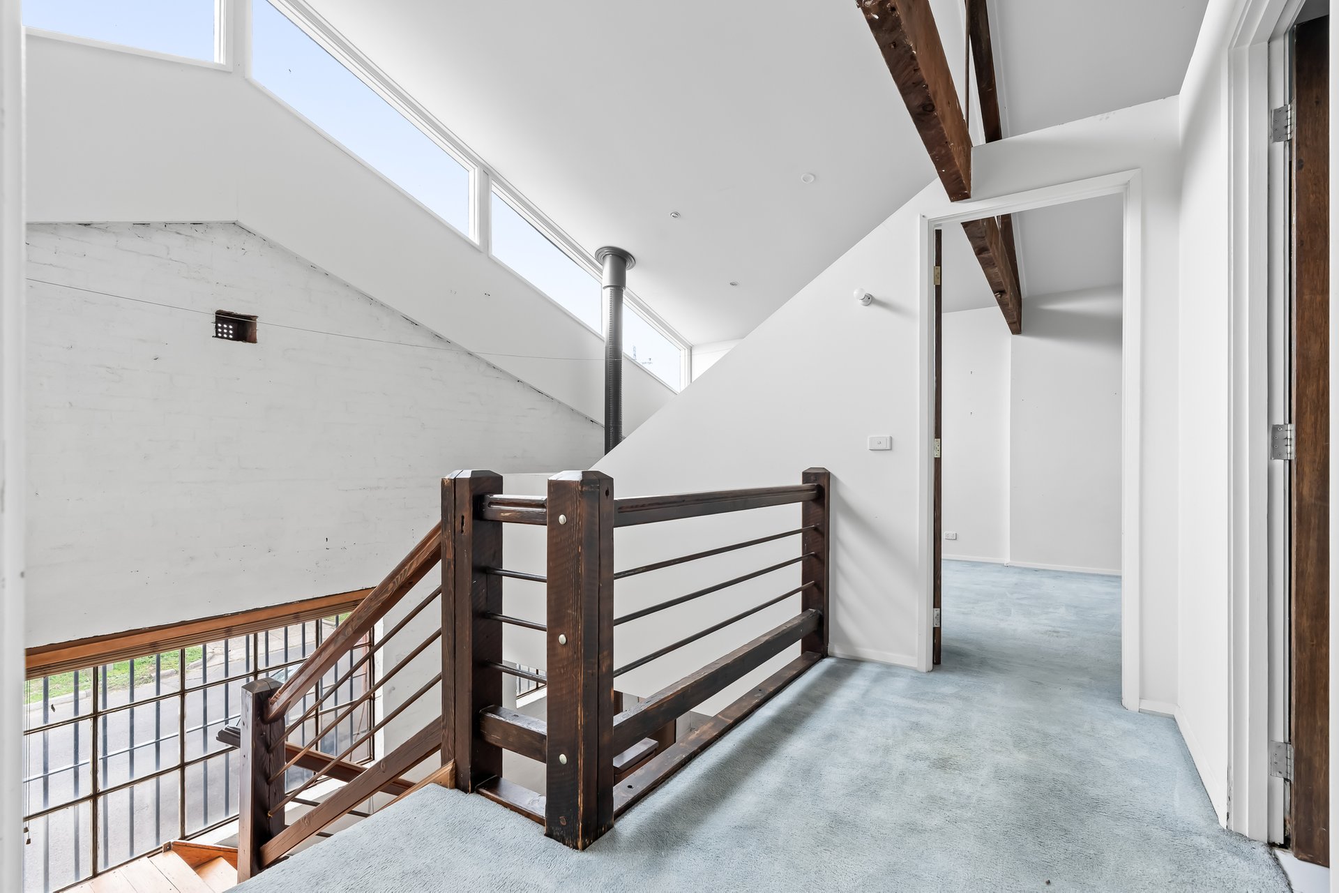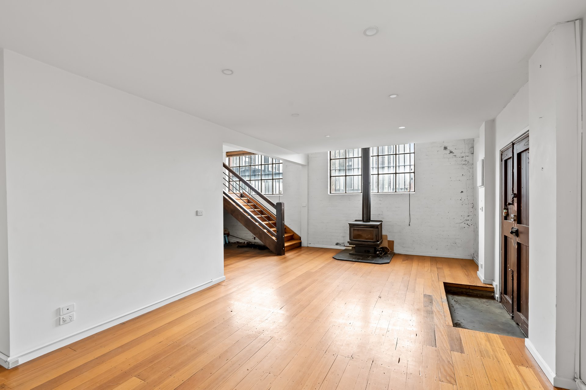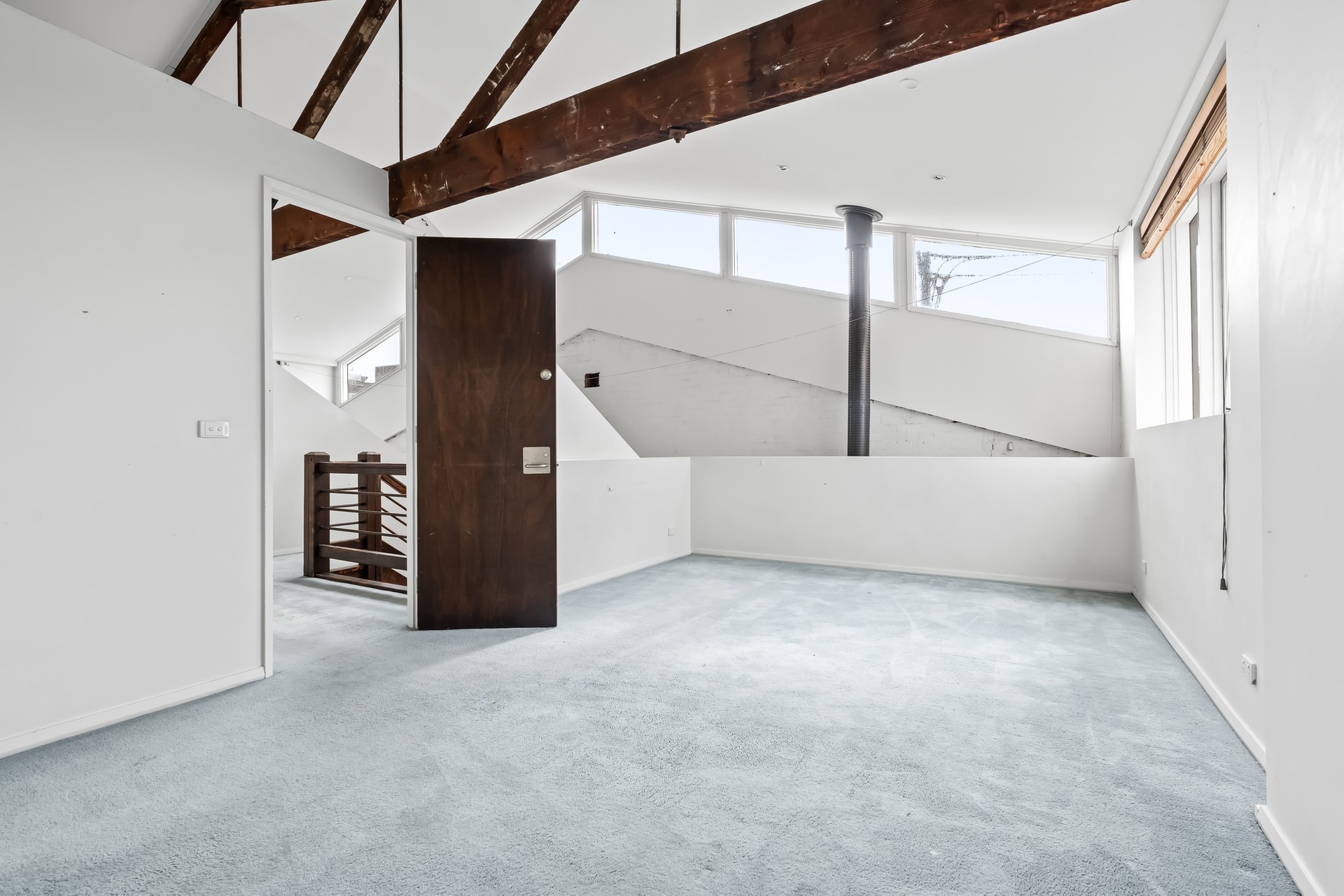 • Original industrial windows and exposed trusses.