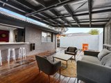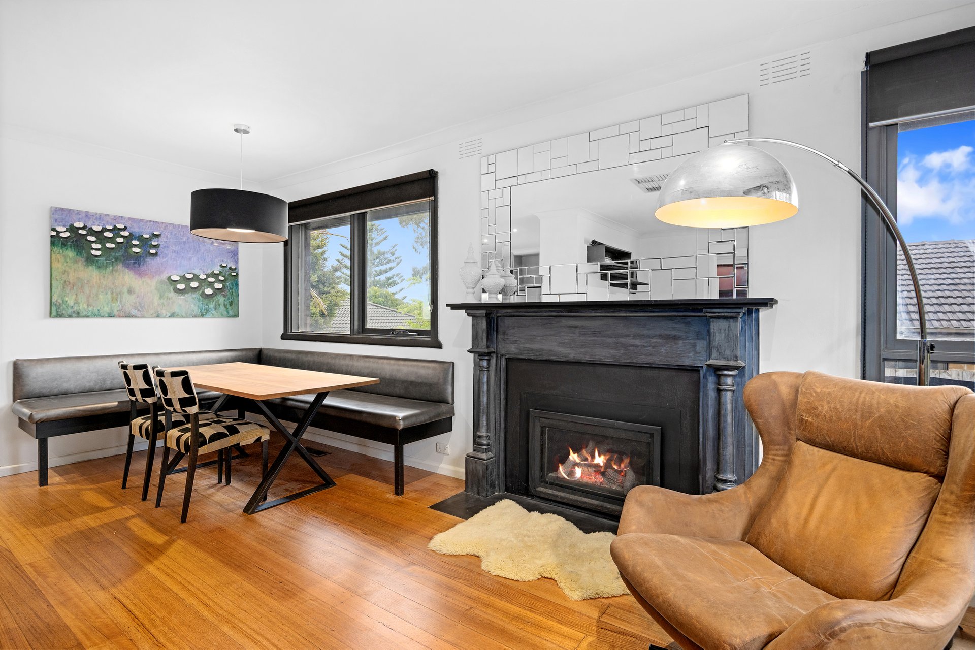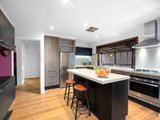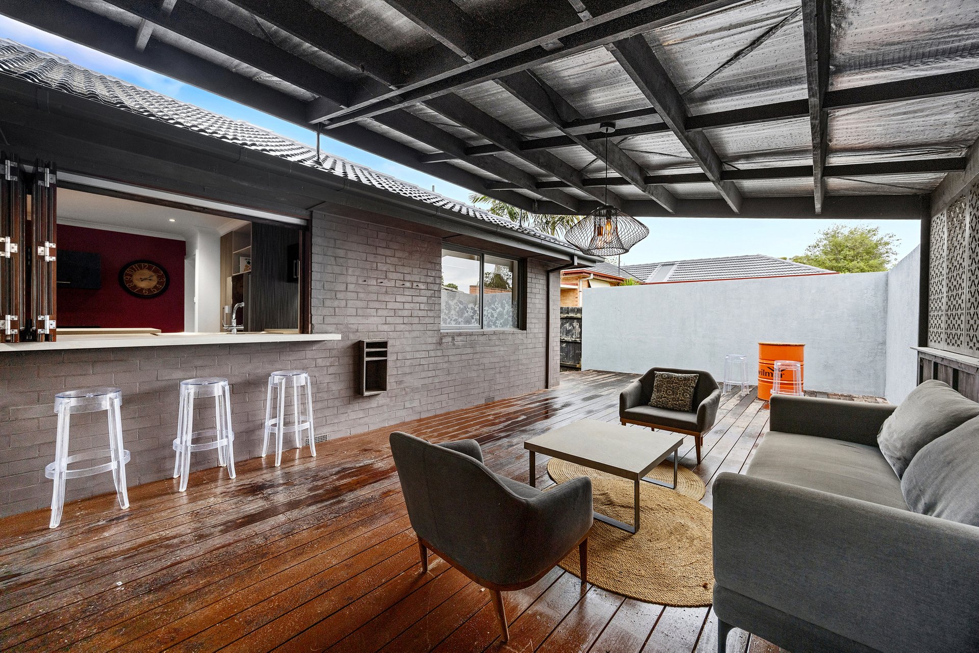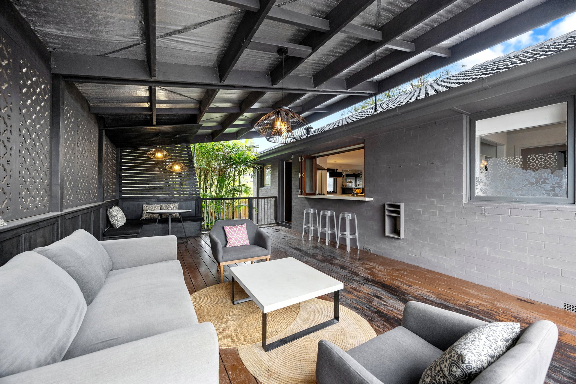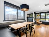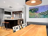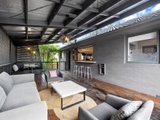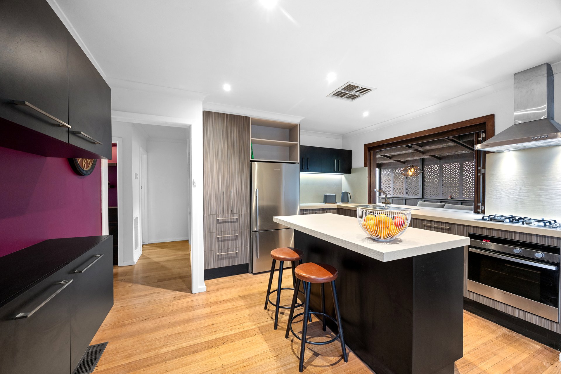 Maximising every inch of indoor and outdoor space, the home’s appeal begins with tranquil gardens that harmonise beautifully with its earthy-toned facade. Adorned with hardwood floorboards, fitted with custom cabinetry and brimming with natural light, you’ll be impressed from the moment you step inside. The communal areas provide inviting spaces to relax, cook and connect, comprising an L-shaped living and dining room with a gas log fireplace, and a statement kitchen with stainless steel cooking appliances, a dish drawer dishwasher and a breakfast island. A bi-fold servery window links the kitchen to a bar ledge outside, enhancing the flow for entertaining. Covered, lit and boasting built-in seating, the expansive outdoor deck effortlessly caters to large gatherings.