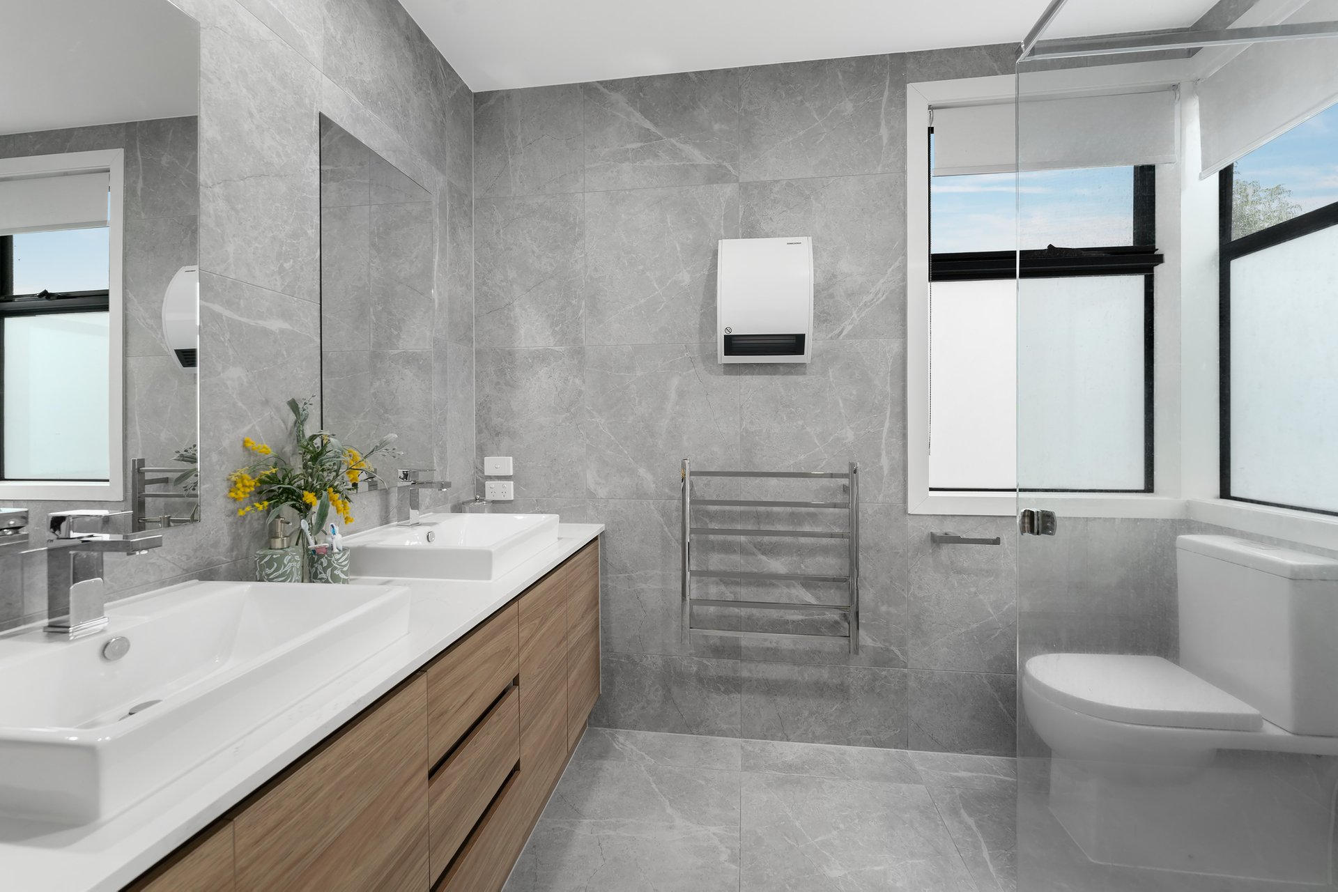 Outdoors, a fully landscaped courtyard provides a private and low-maintenance setting ideal for relaxing or entertaining, complementing the expansive alfresco terrace that captures the home’s stunning views. High ceilings and taller doorways further enhance the sense of space and light, creating an airy, open feel across all levels, while ducted vacuuming adds an extra layer of convenience to daily living.