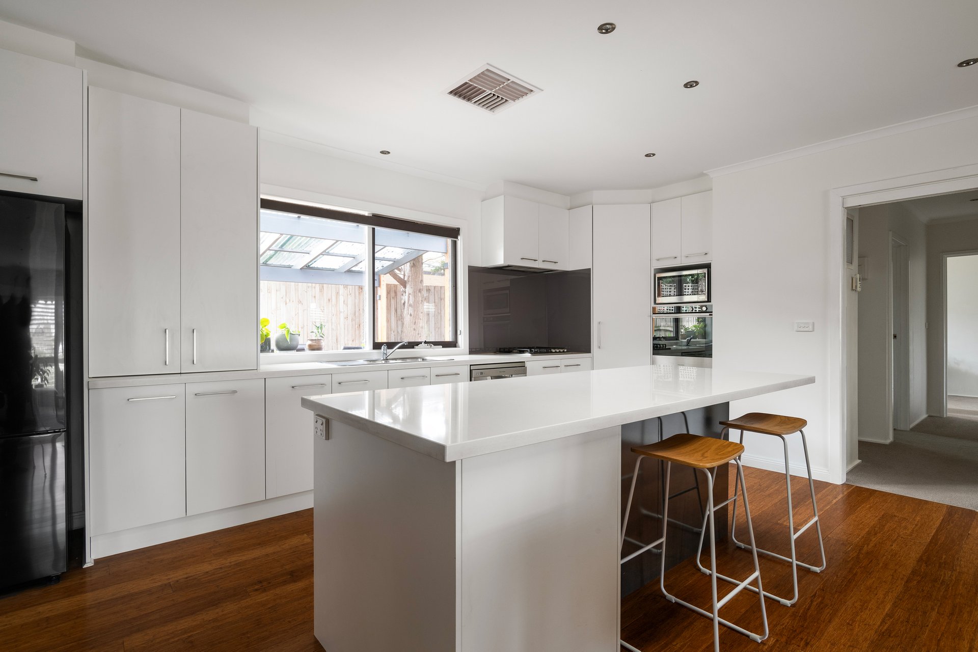 The home’s appeal begins with its idyllic placement, set directly across from Burnt Bridge Shopping Centre and tucked at the rear of the complex, beyond a magnificent established oak tree. Inside, the sprawling open plan living and dining room amazes with its spaciousness, anchored by a stunning kitchen, showcasing a full suite of stainless steel appliances, substantial storage and stone surfaces, including a large breakfast island. From here, you can see the incredible outdoor setup, accessed via the adjoining full-size laundry. Covered and open decking with lighting feature in the generous backyard, where all-seasons entertaining is effortlessly catered for. The surrounding gardens offer ample play space for children and pets, and there are raised beds to plant herbs and vegetables.