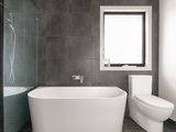 Back inside, two bedrooms with built-in wardrobes provide comfortable accommodation, the large master boasting a connecting study/nursery with a built-in desk and shelving. A sleek bathroom, complete with a luxe soaker tub and a walk-in twin-head shower with a niche, services the rooms, along with two toilets – one in the bathroom and another off the laundry.