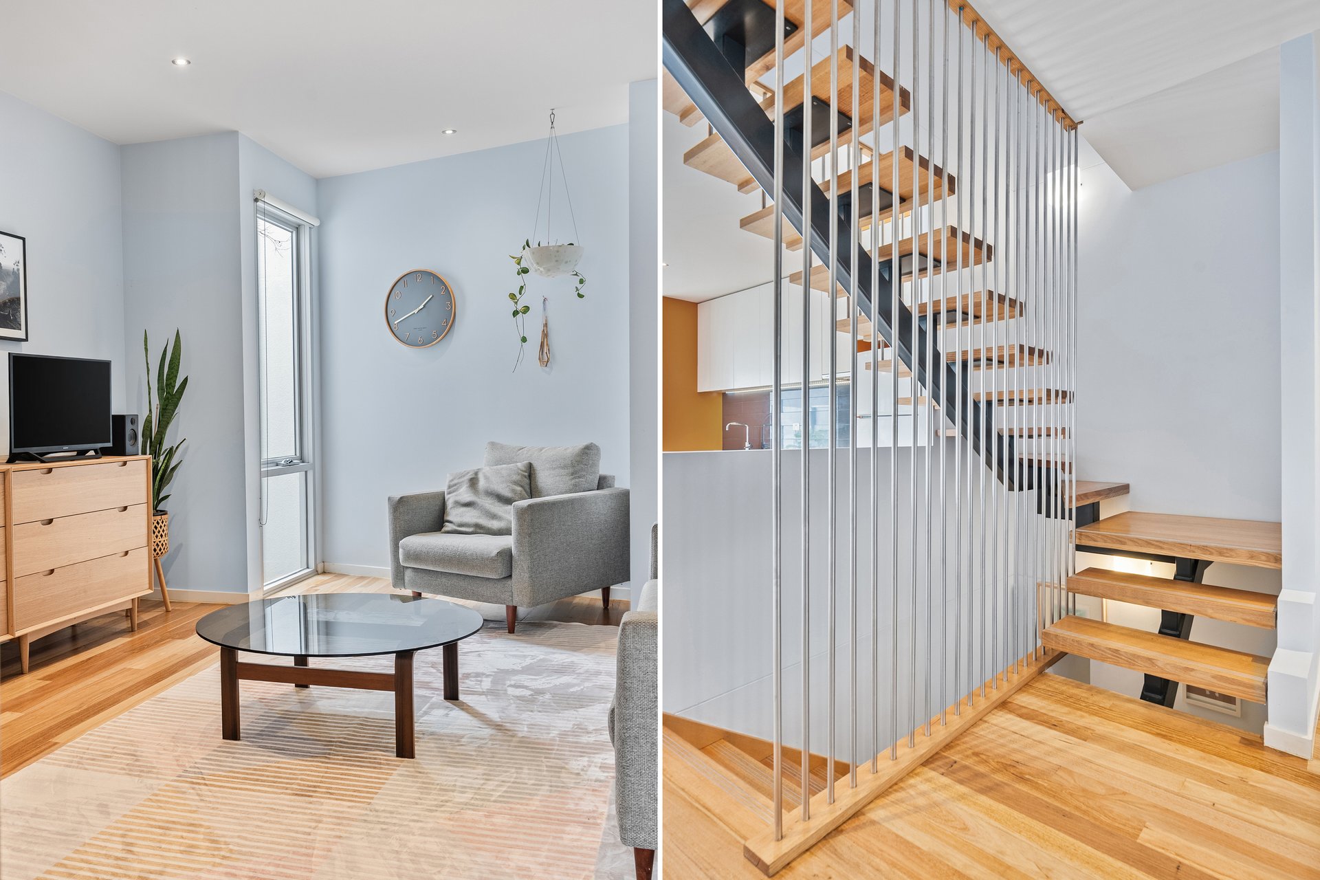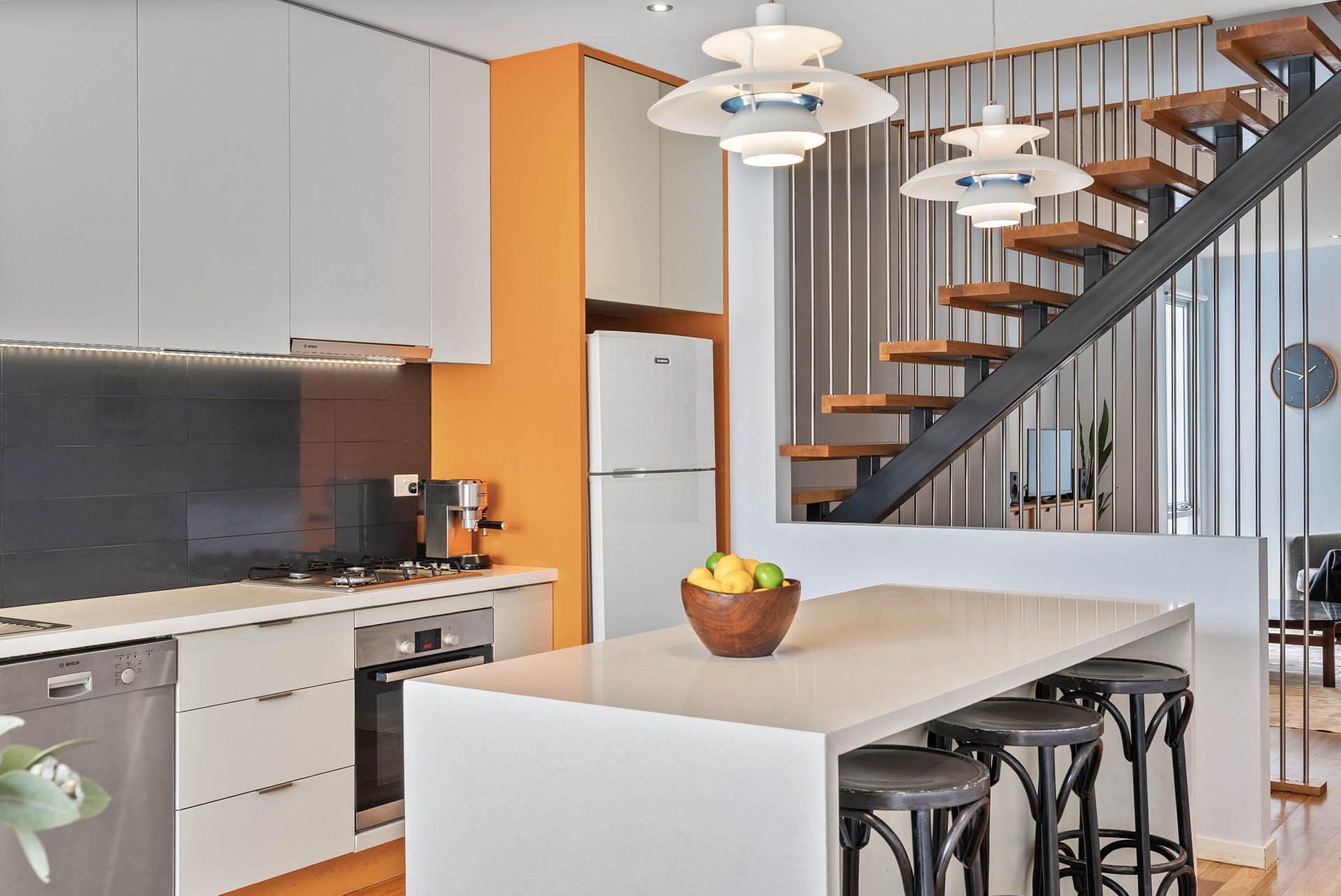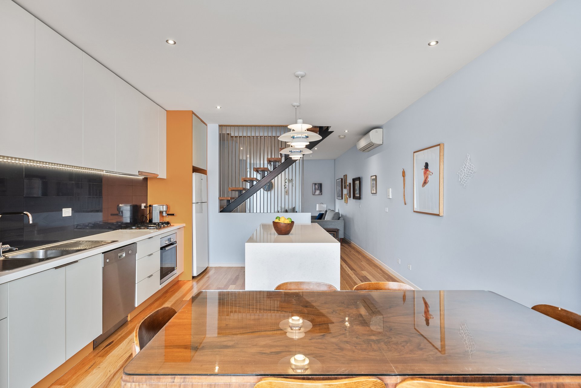 The kitchen is a true centrepiece, designed with stone benchtops, striking light features, and an abundance of natural light. Living and dining zones are smartly divided by a staircase with contemporary rod detailing, creating separation while maintaining an open, airy feel.