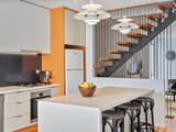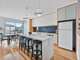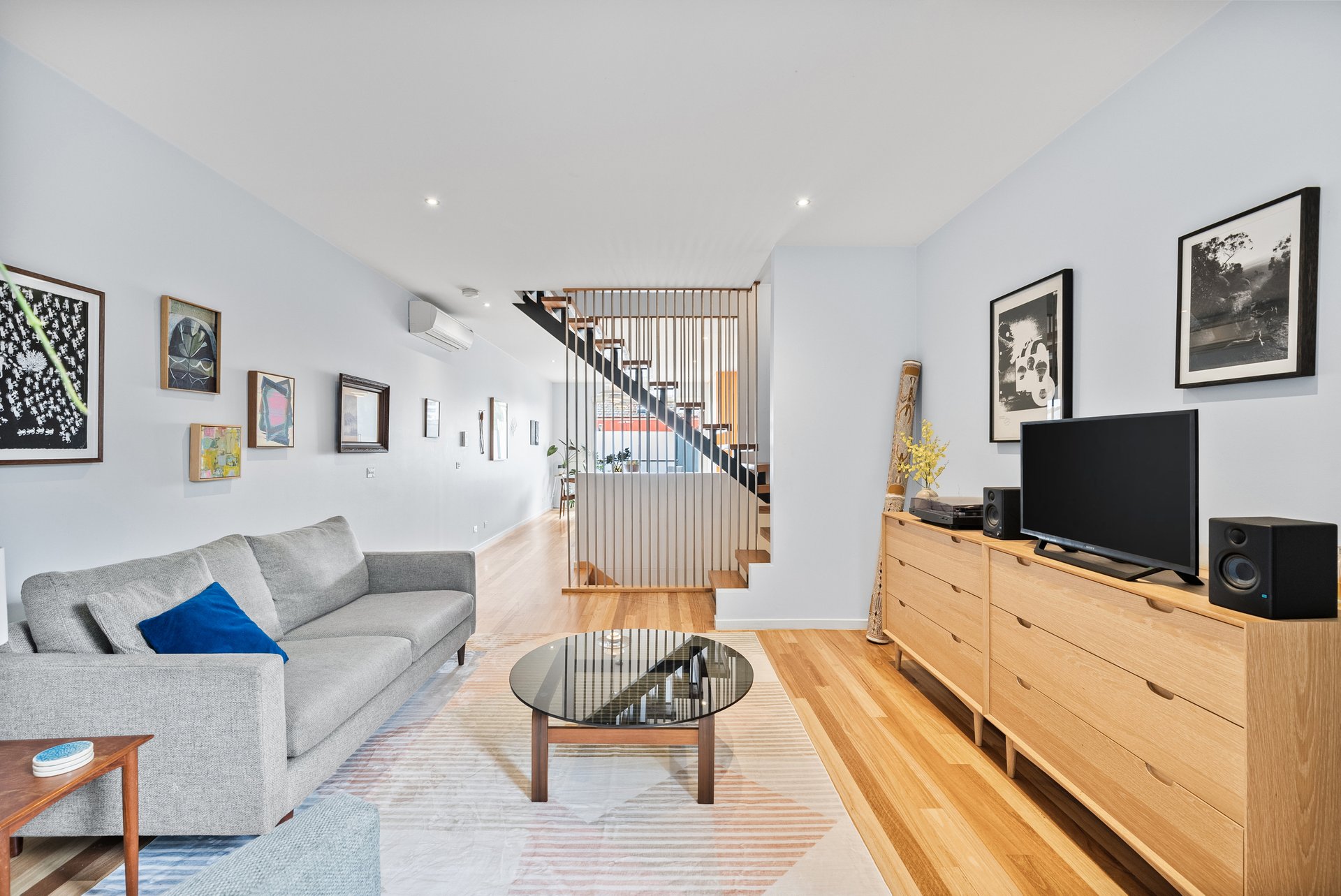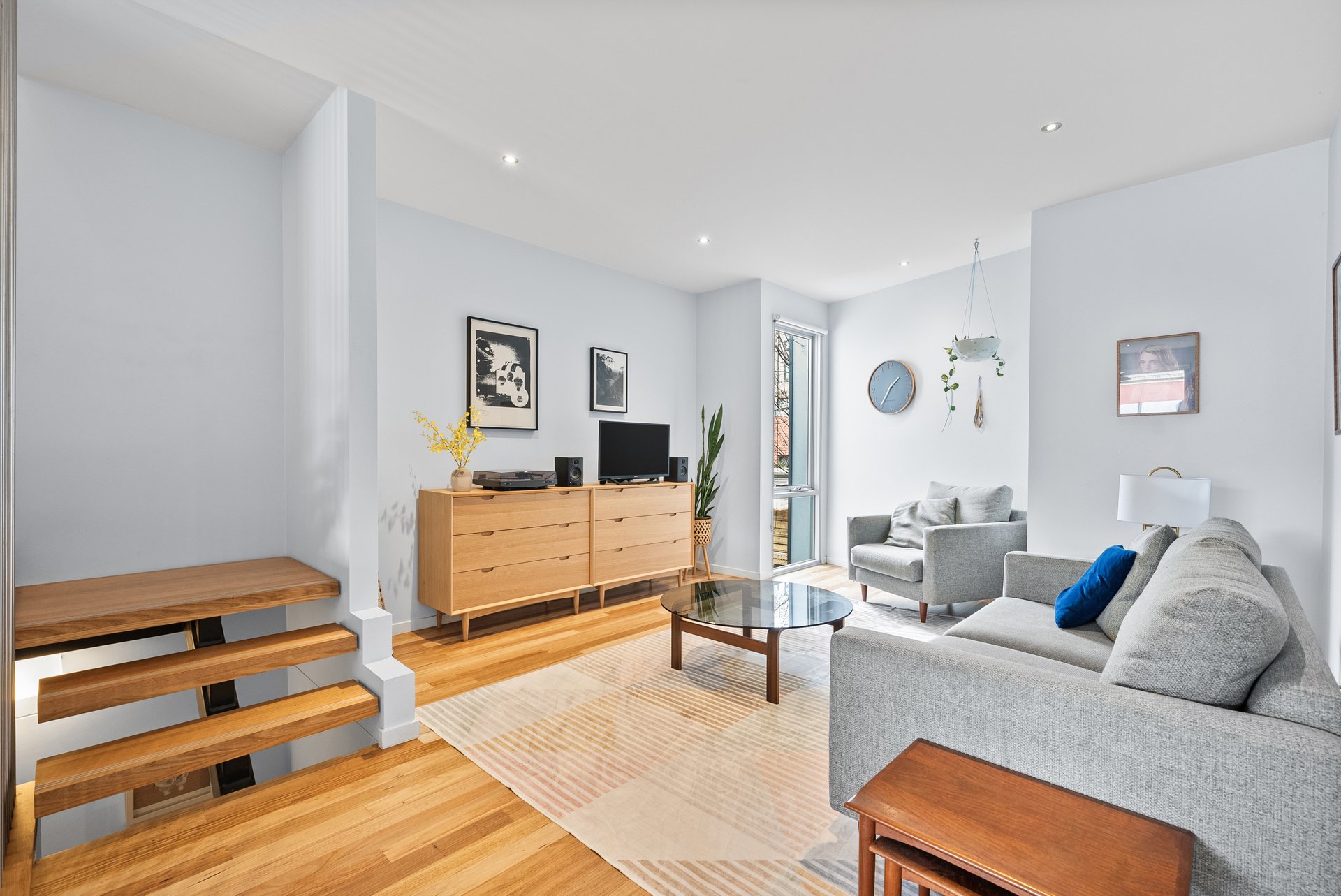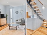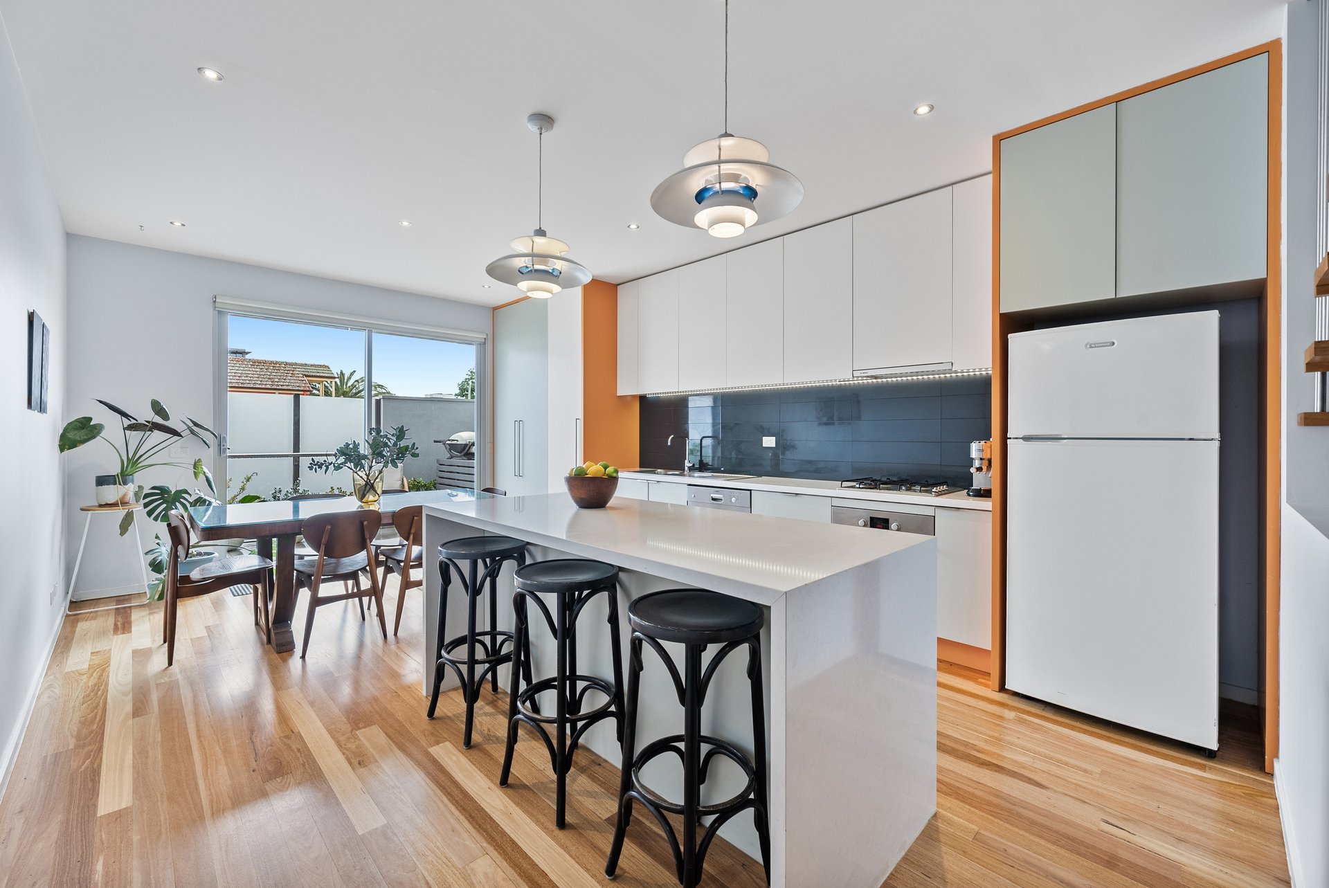 The kitchen is a true centrepiece, designed with stone benchtops, striking light features, and an abundance of natural light. Living and dining zones are smartly divided by a staircase with contemporary rod detailing, creating separation while maintaining an open, airy feel.