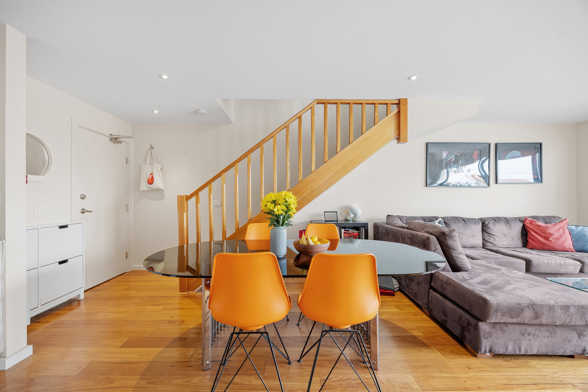 The open-plan living and dining area features hardwood timber flooring throughout, creating a seamless flow to the north-facing balcony via sliding glass doors. The space is bright and airy, offering comfort year-round with a split system and generous proportions ideal for both relaxation and entertaining.