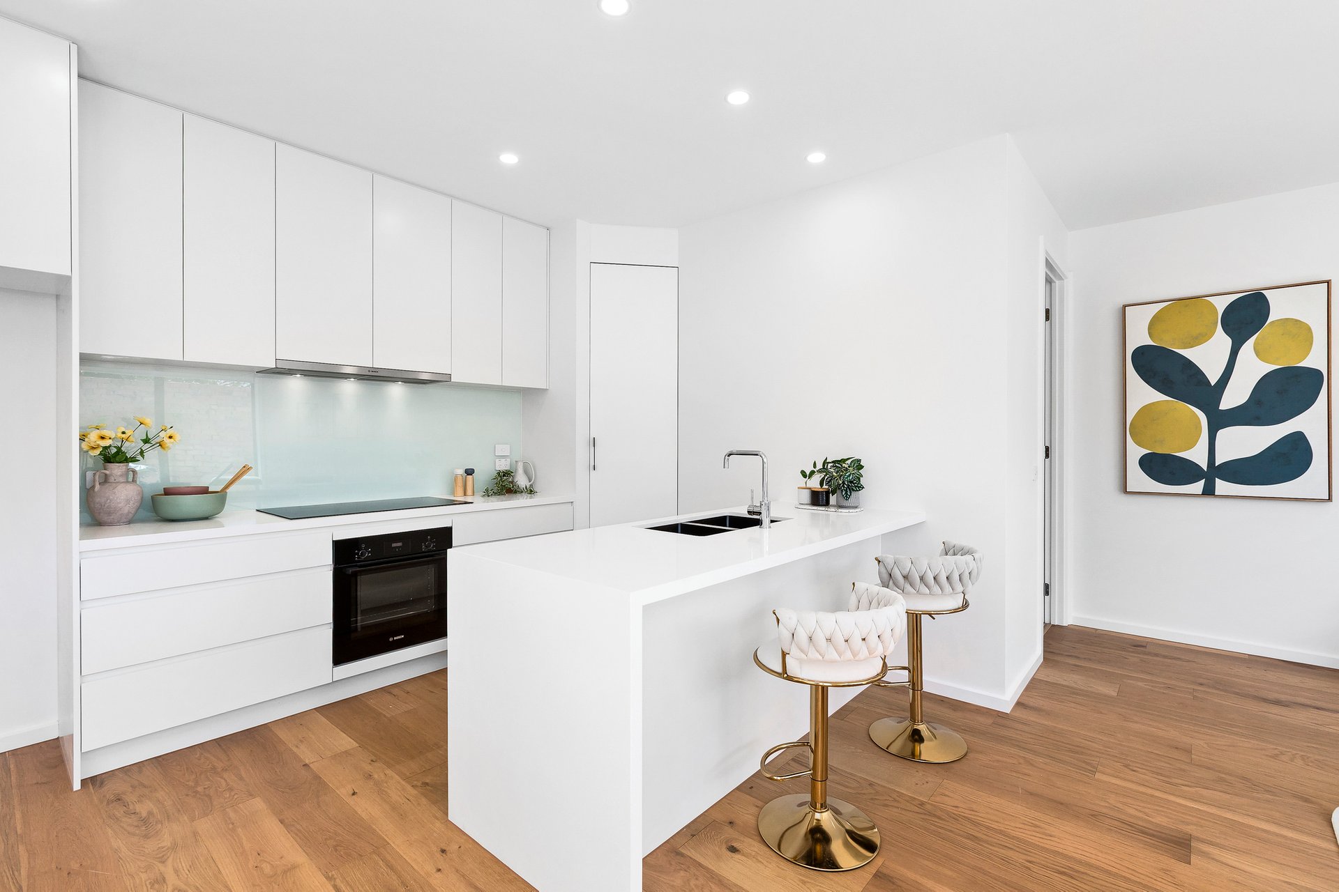 The sleek designer kitchen combines contemporary style with everyday practicality, offering generous storage, quality finishes, and ample preparation space to cater effortlessly to daily living and hosting.