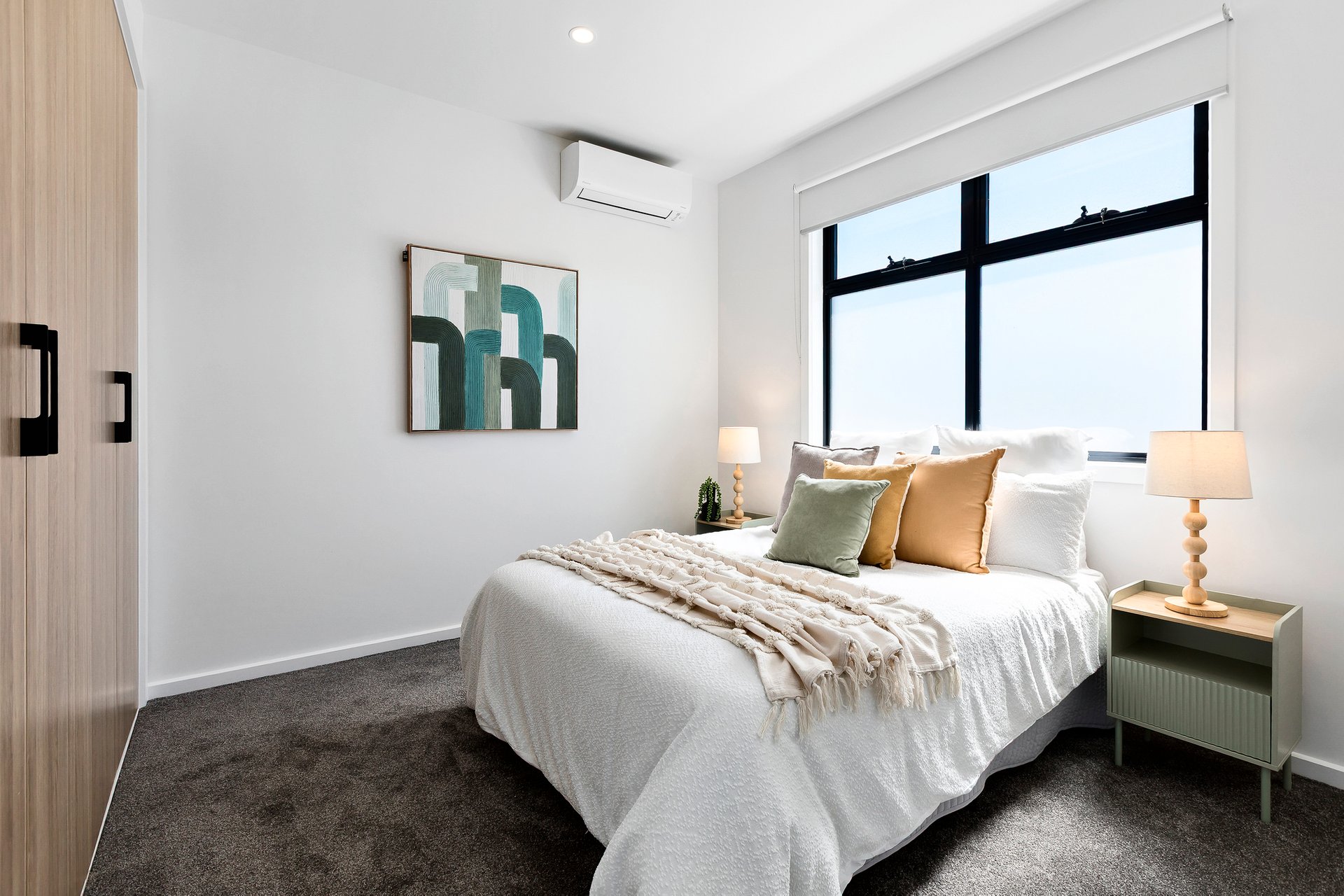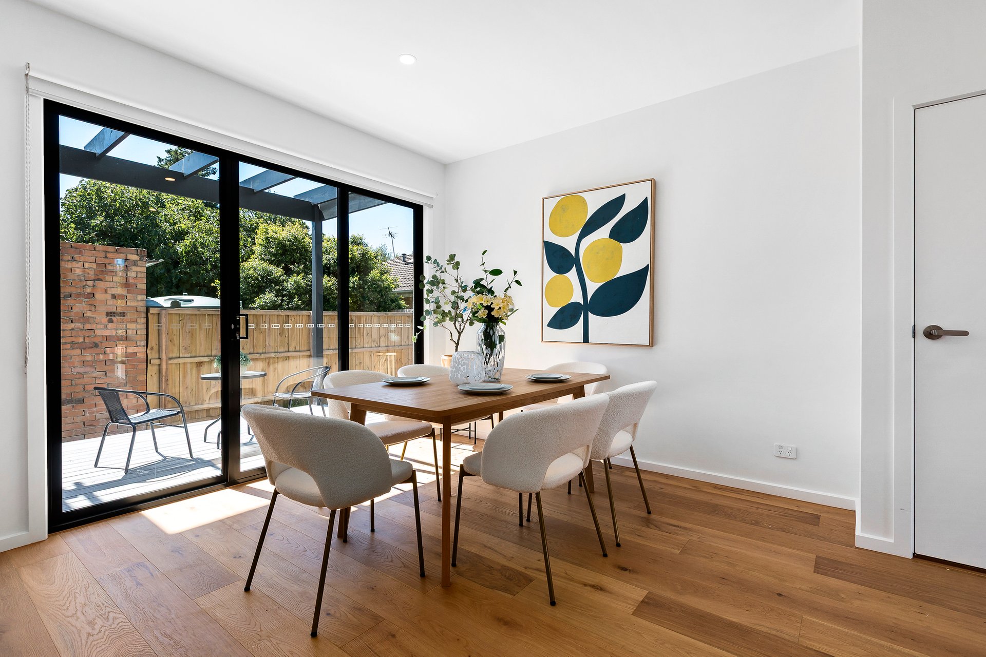 A spacious open-plan living and dining area forms the heart of the home, highlighted by timber flooring and enhanced by heating and cooling for year-round comfort. This inviting space flows seamlessly to a private decked courtyard, creating the perfect setting for relaxed entertaining or quiet outdoor enjoyment.