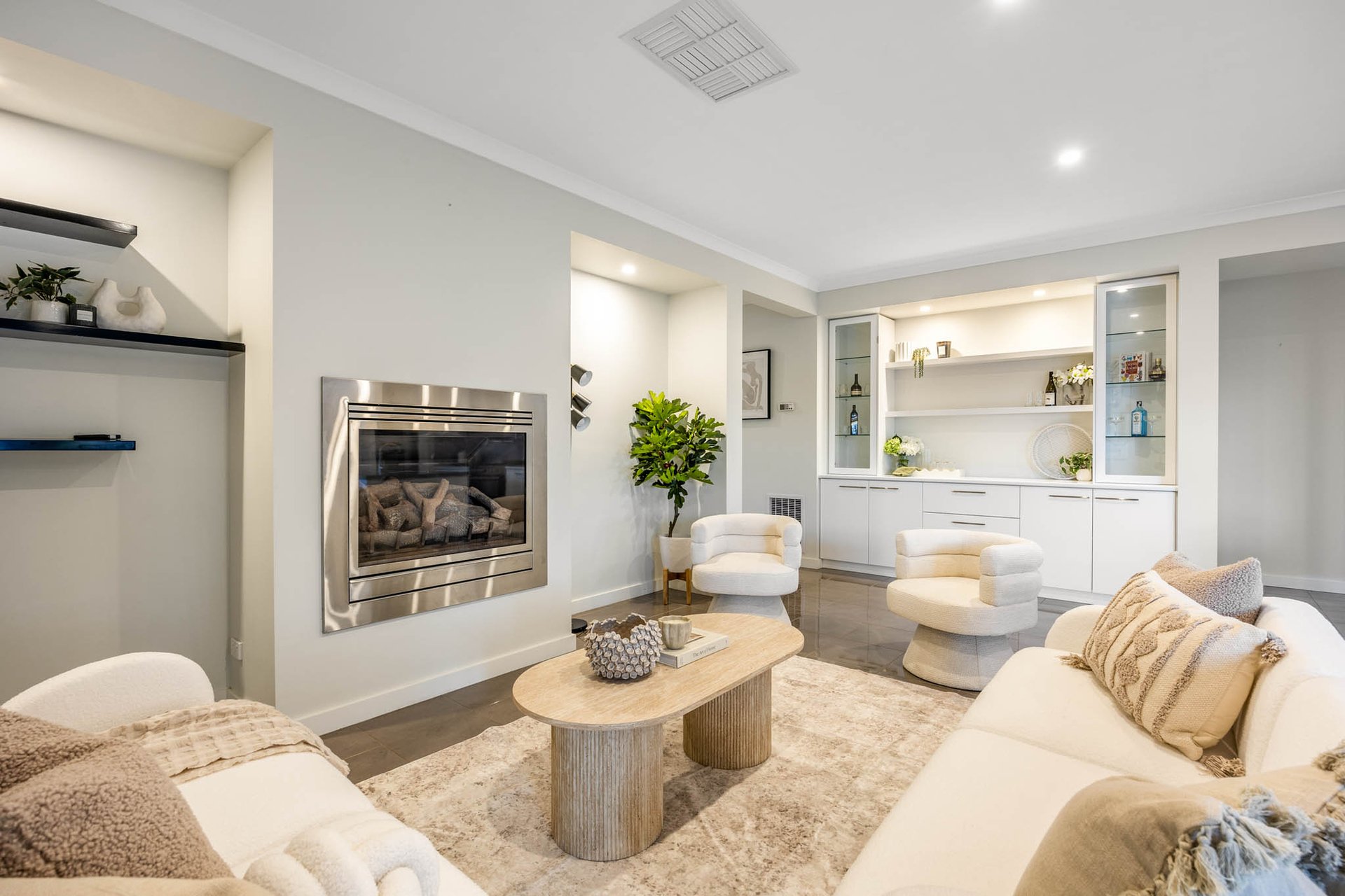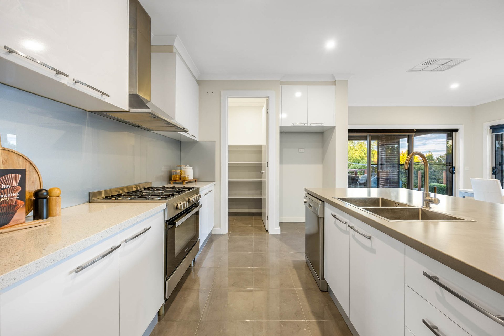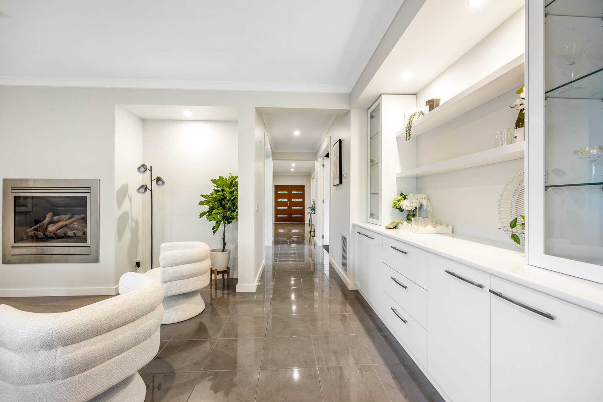 Extra-tall internal doors and generous proportions amplify the sense of effortless scale, with a tiled, ultra-wide entry hall leading past a lounge to impressive open kitchen, dining, and living domains, anchored by a striking gas log fireplace and an inbuilt wine store. The stone-finished designer kitchen excels in both form and function with a walk-in pantry, Artusi 900mm upright oven, and a dishwasher.
