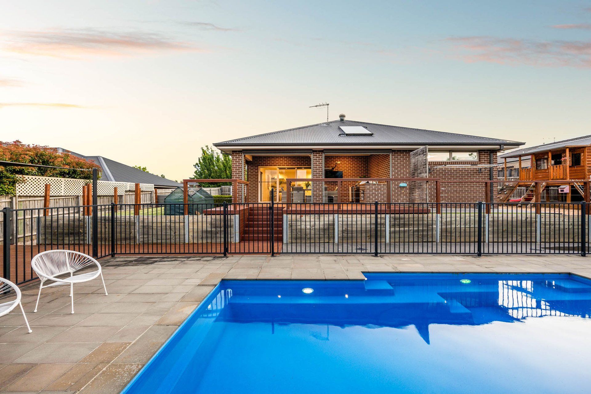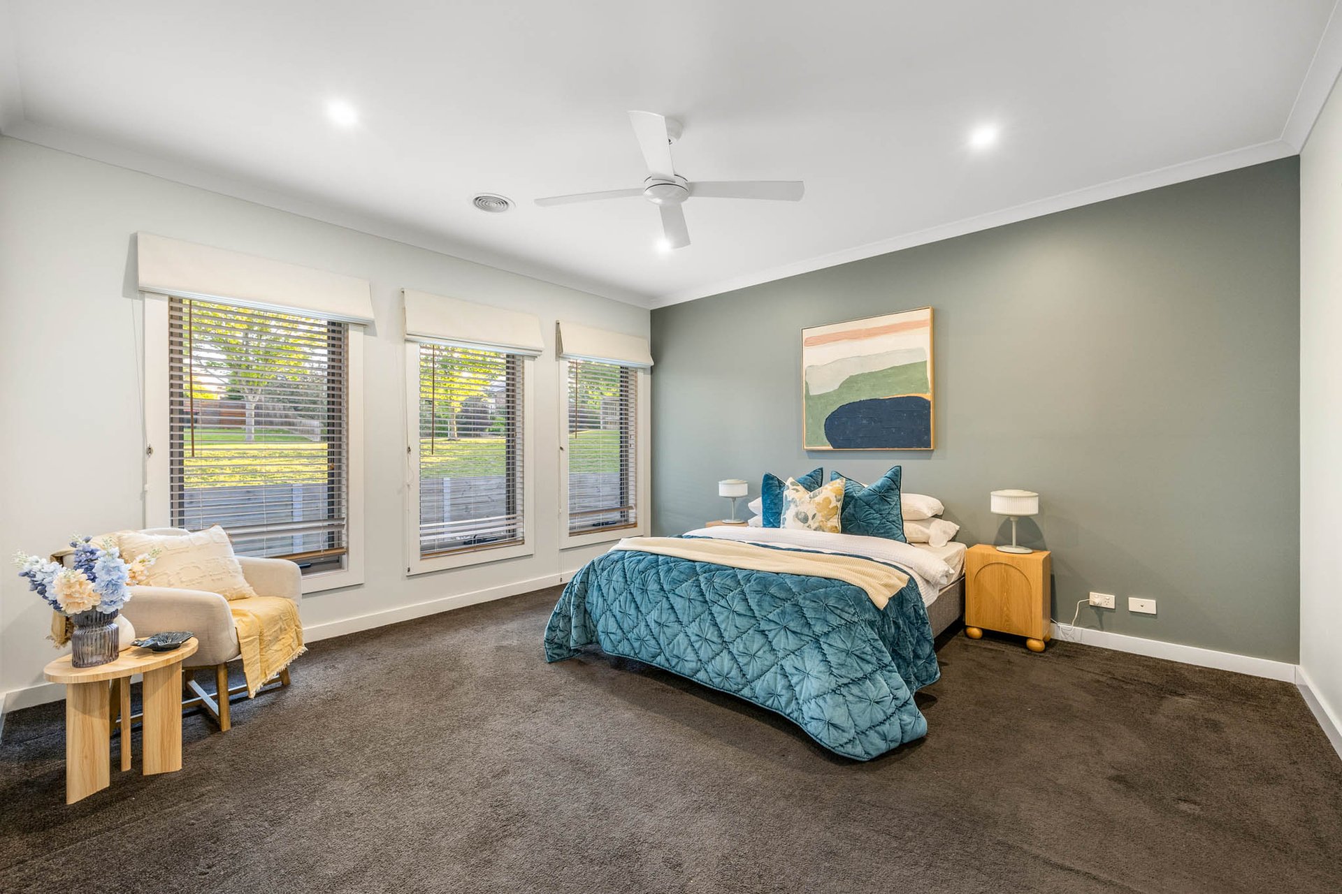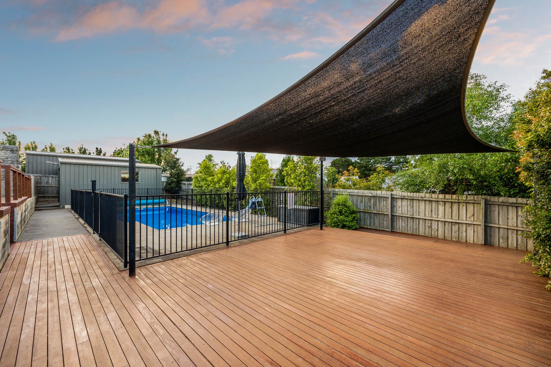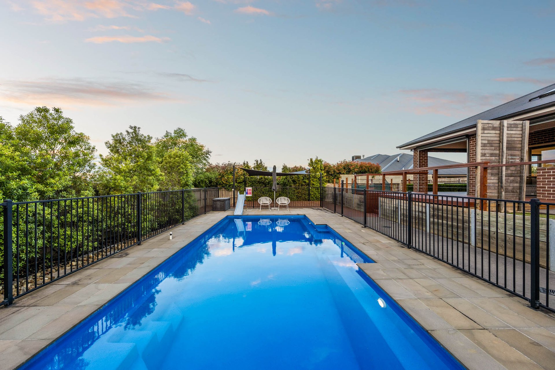 Double-glazed sliders open seamlessly to the alfresco entertaining area, sunlit from the north and appointed with a full barbecue kitchen and bistro blinds, where long views reach to Mount Macedon, setting the scene for unforgettable gatherings. A solar-heated swimming pool and poolside entertaining deck with a shade-sail complete the resort-style ambience, while meticulous, low-maintenance landscaping includes an adventure cubby house for younger imaginations.