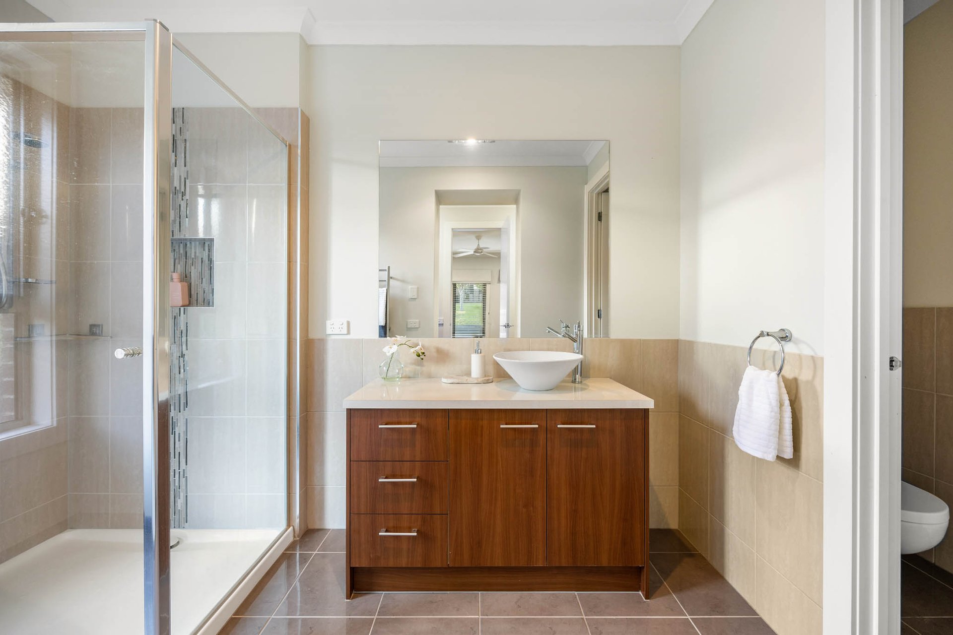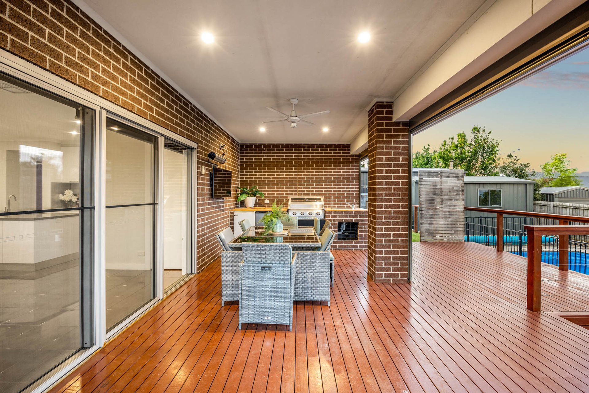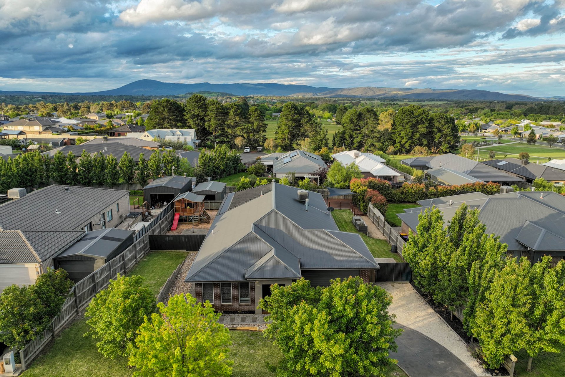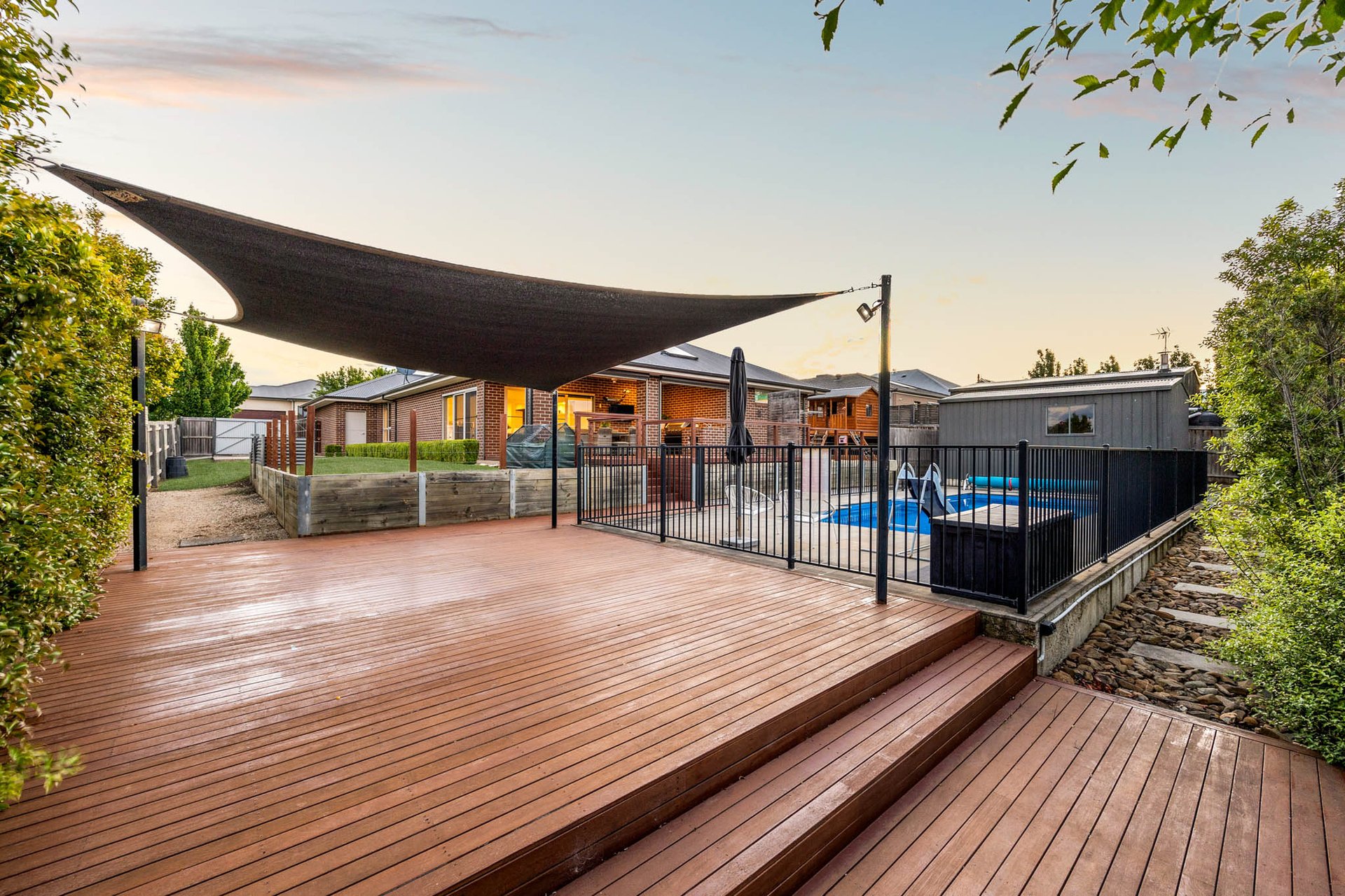 Double-glazed sliders open seamlessly to the alfresco entertaining area, sunlit from the north and appointed with a full barbecue kitchen and bistro blinds, where long views reach to Mount Macedon, setting the scene for unforgettable gatherings. A solar-heated swimming pool and poolside entertaining deck with a shade-sail complete the resort-style ambience, while meticulous, low-maintenance landscaping includes an adventure cubby house for younger imaginations.