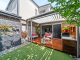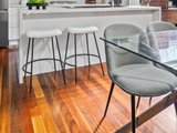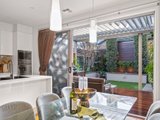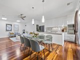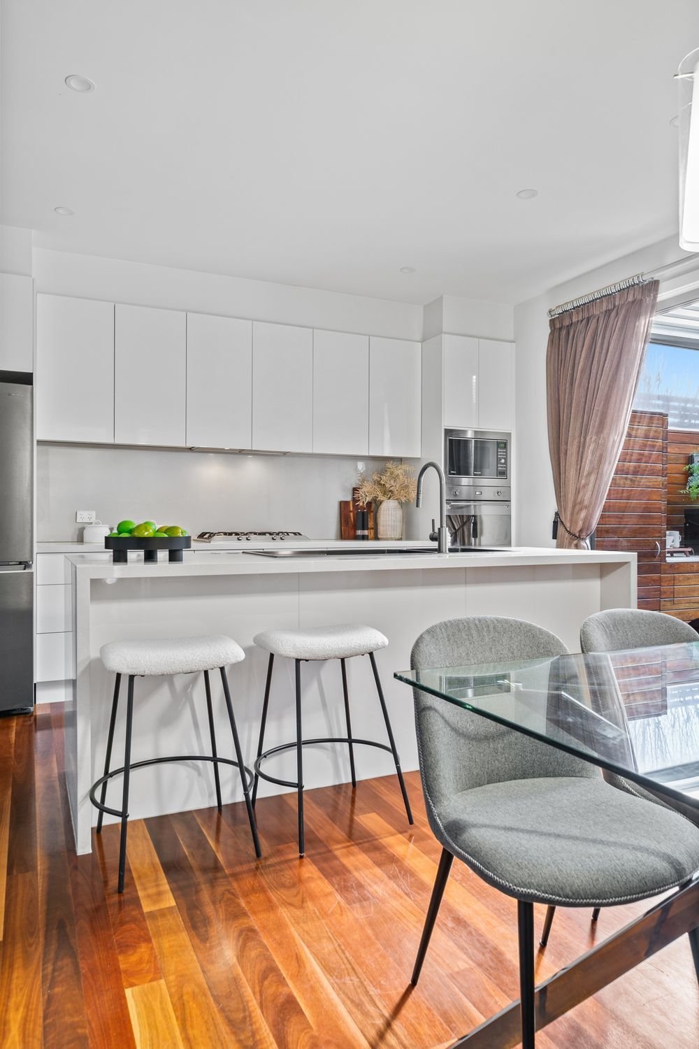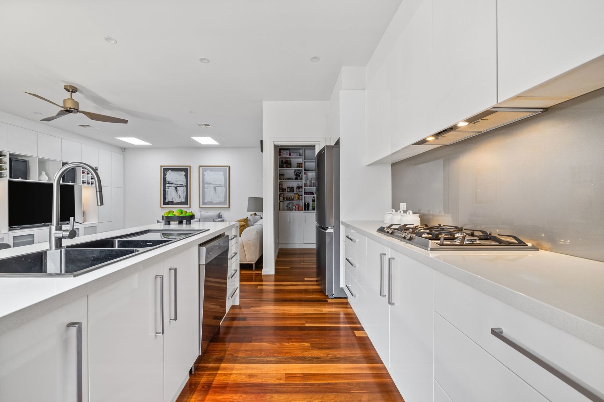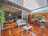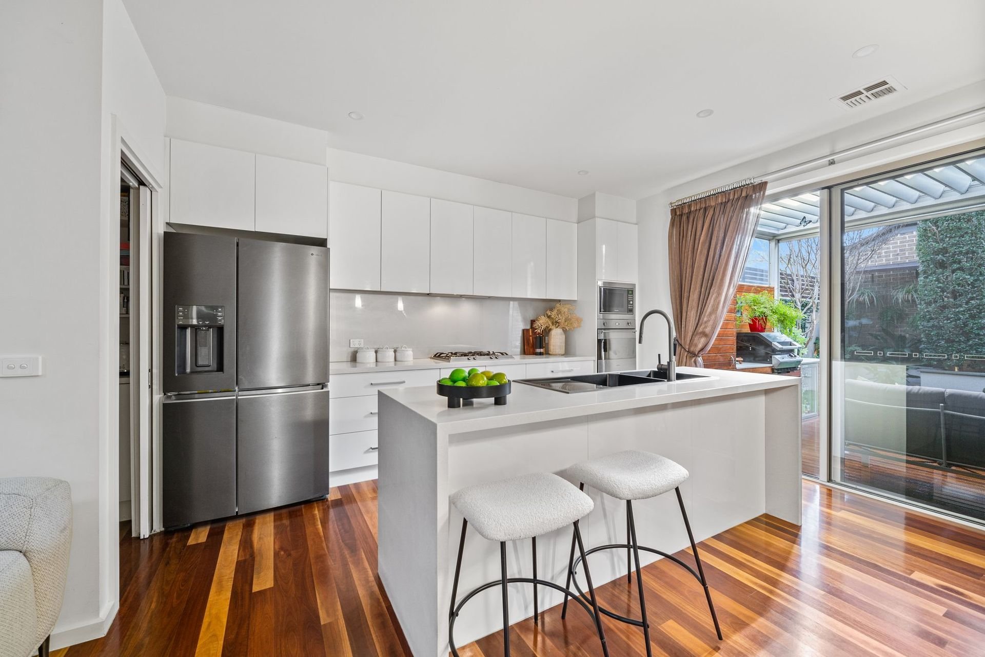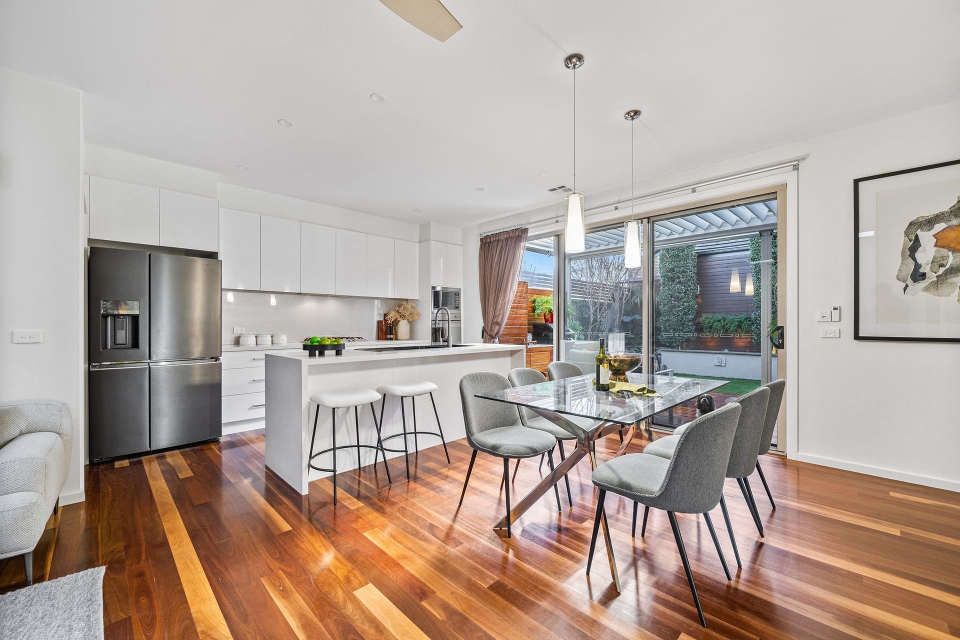 The expansive open plan living and dining area is enhanced by high, square set ceilings, custom cabinetry and premium spotted gum hardwood floors. At its heart, a stunning Smeg kitchen showcases a stone waterfall island and walk in pantry, flowing through triple sliding stacker doors to a sun drenched north facing backyard.
