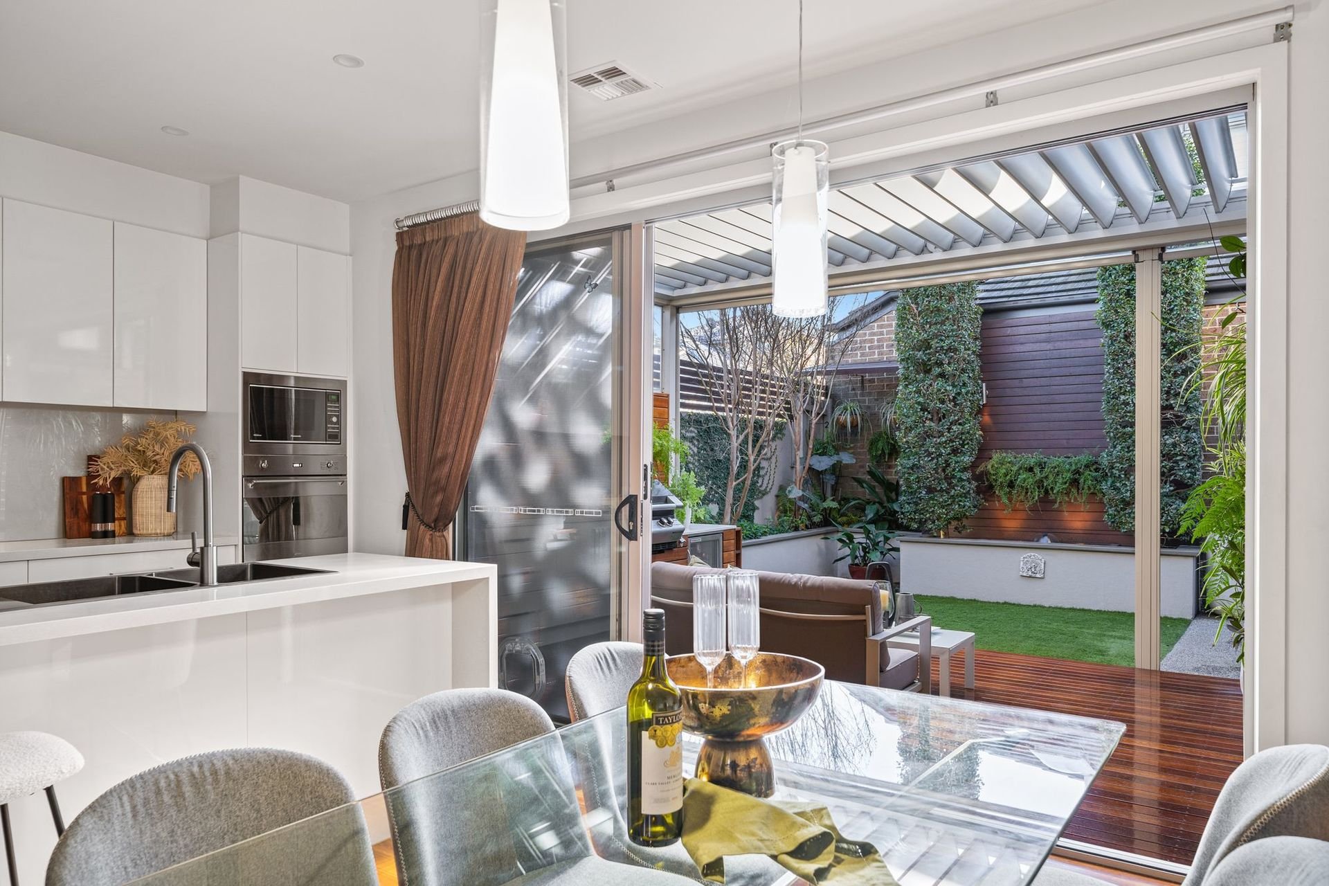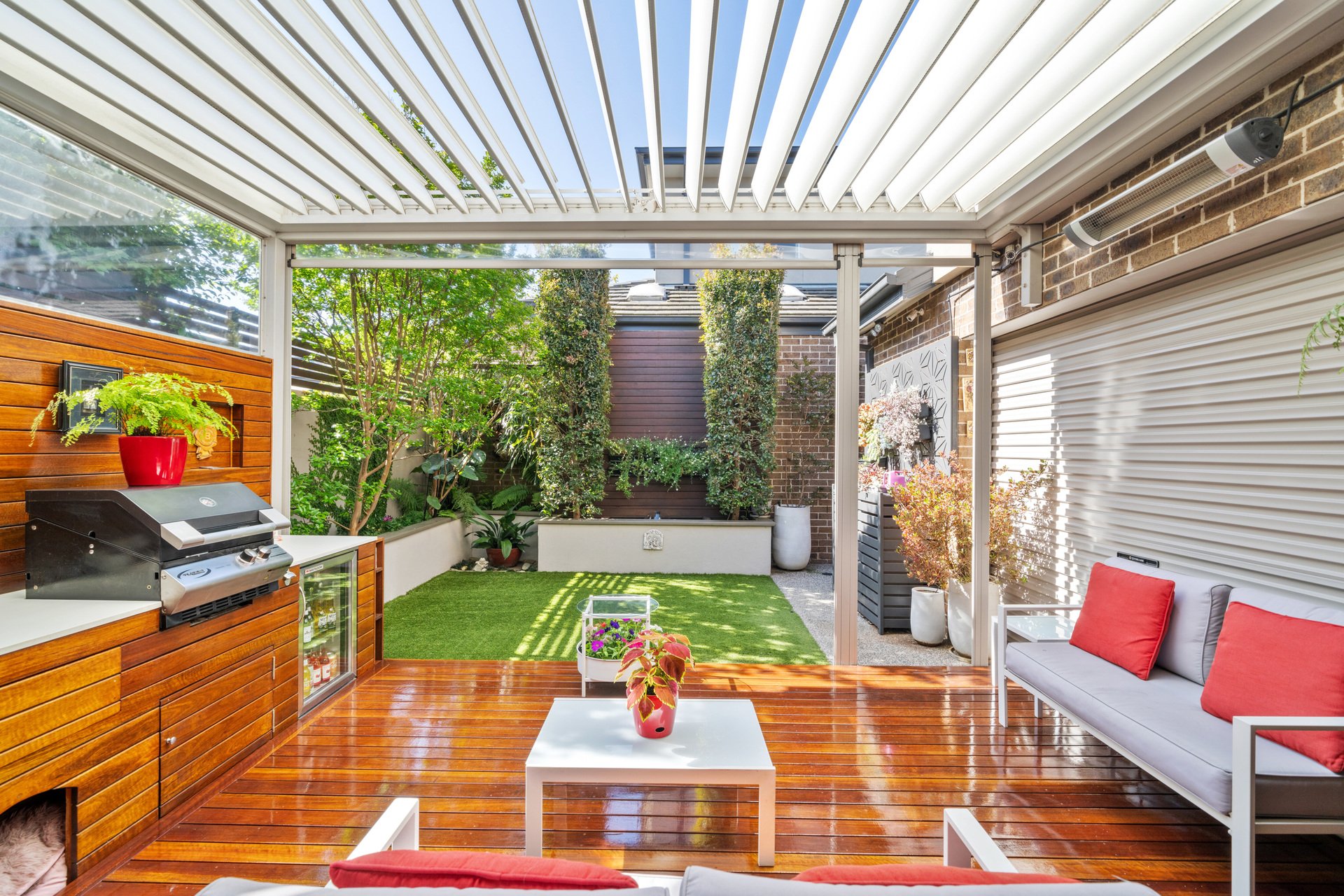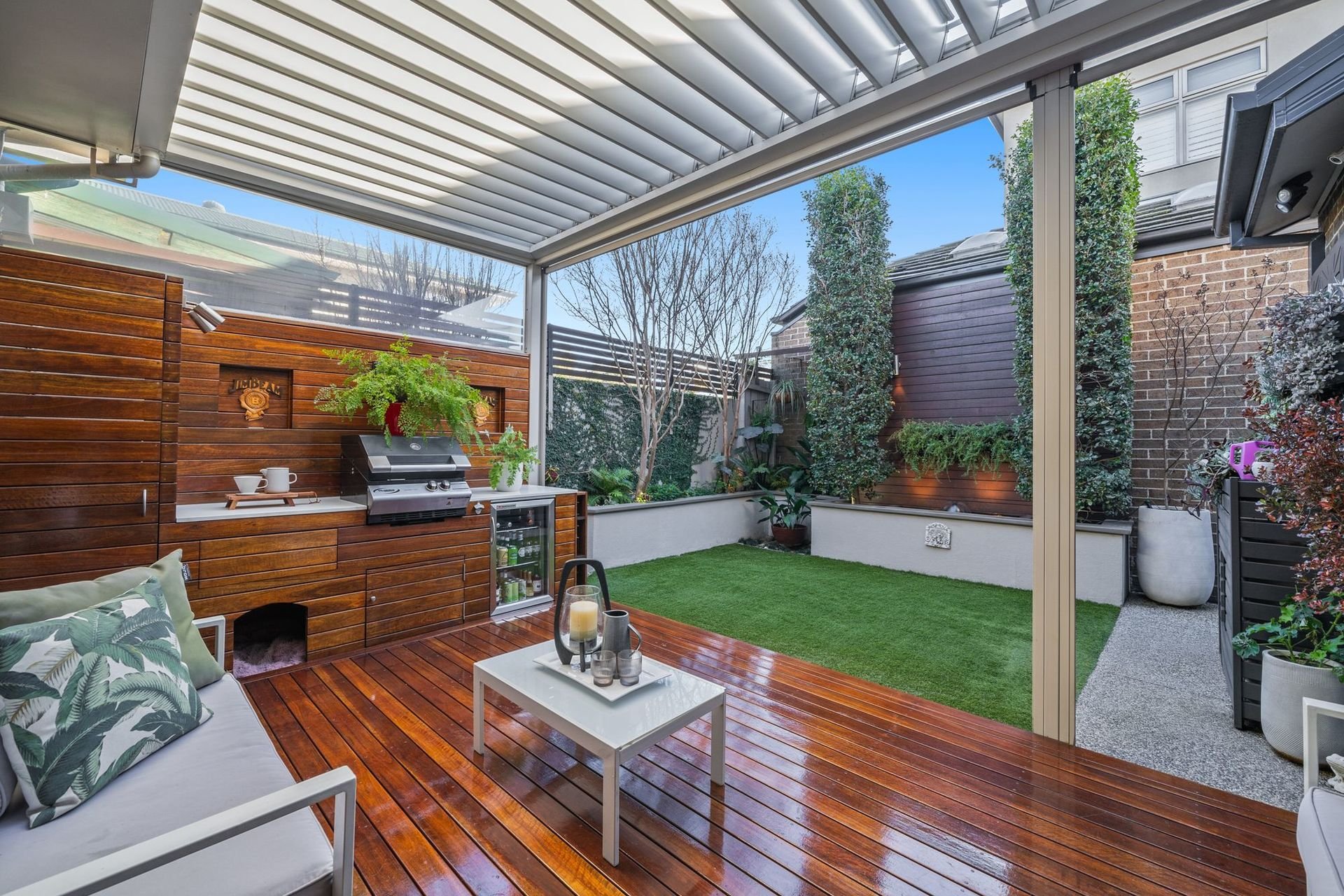 Designed for year round enjoyment, the outdoor entertaining zone features an automated Vergola roof system, built in barbeque kitchen, café blinds, tranquil pond and established, beautifully landscaped gardens with garden lighting and automated irrigation.