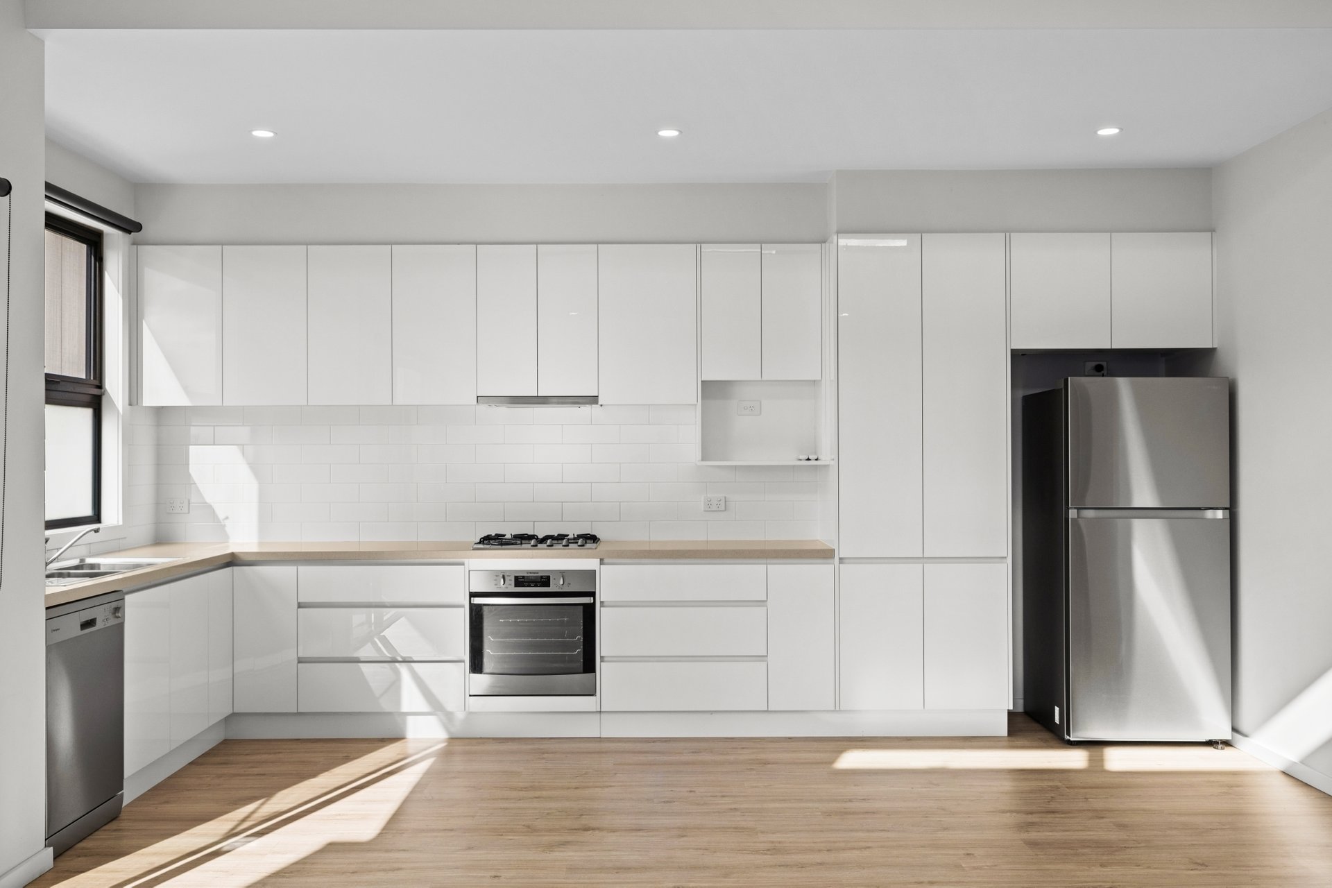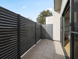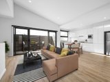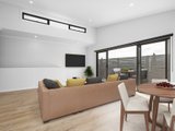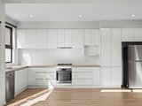 The top-floor living and dining room, highlighted by a raked ceiling with clerestory windows, is a sublimely light-filled domain for unwinding or entertaining, opening through dual sliding doors with flyscreens to a private alfresco balcony. A fully equipped kitchen with Westinghouse stainless steel appliances, soft-close cabinetry, Caesarstone benches and tiled splashbacks complements the space.