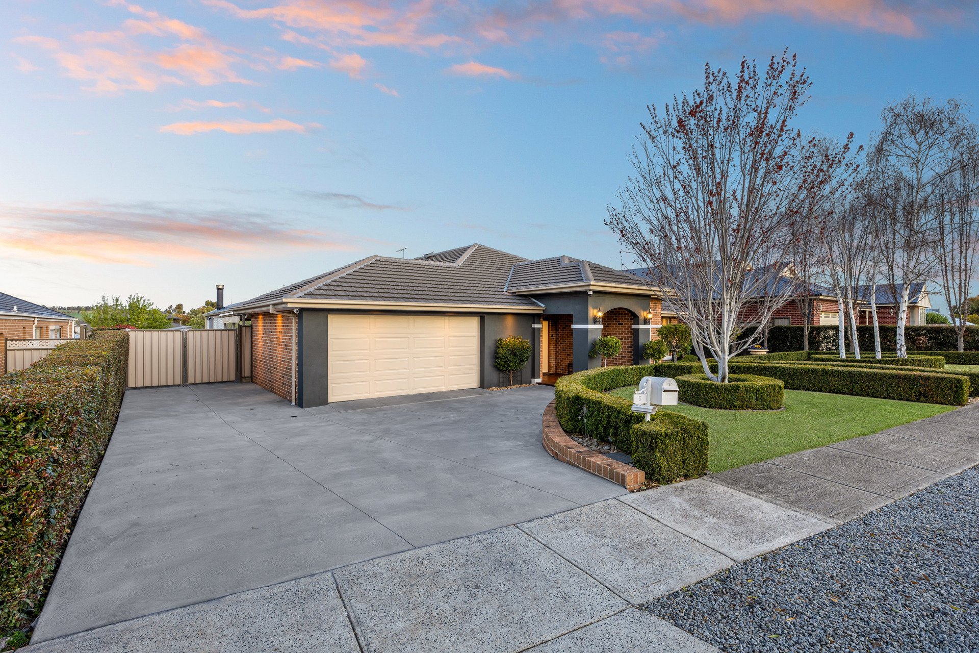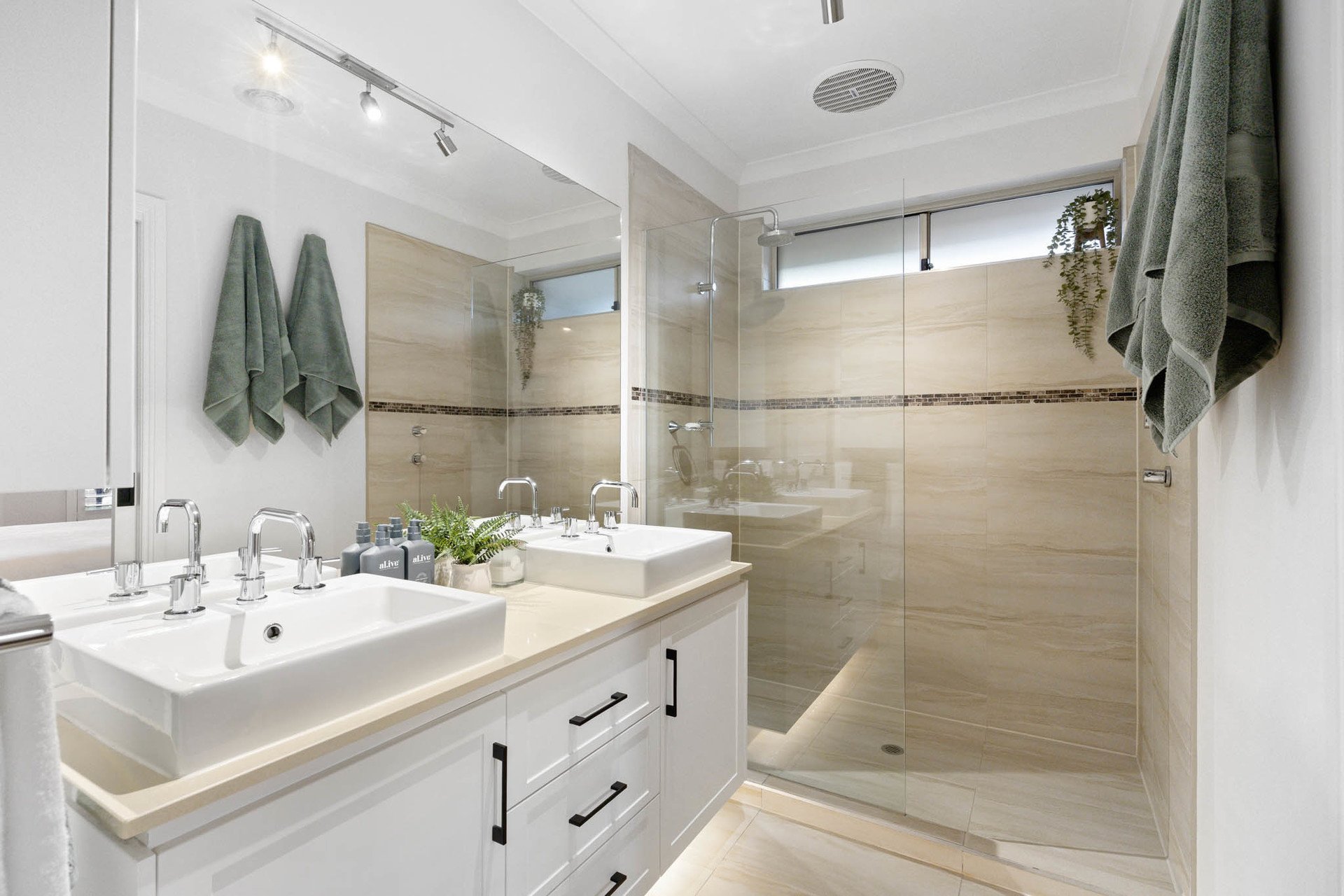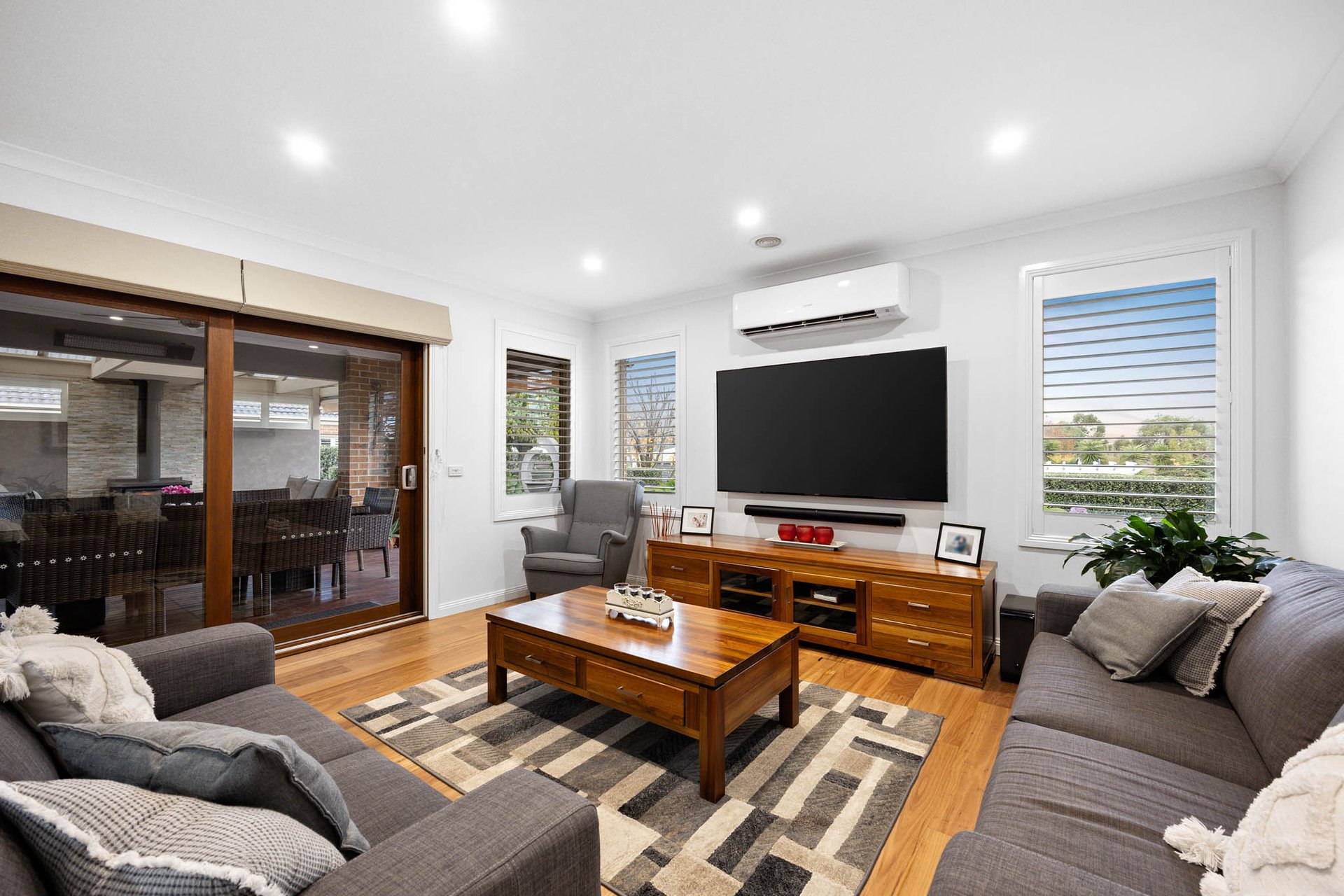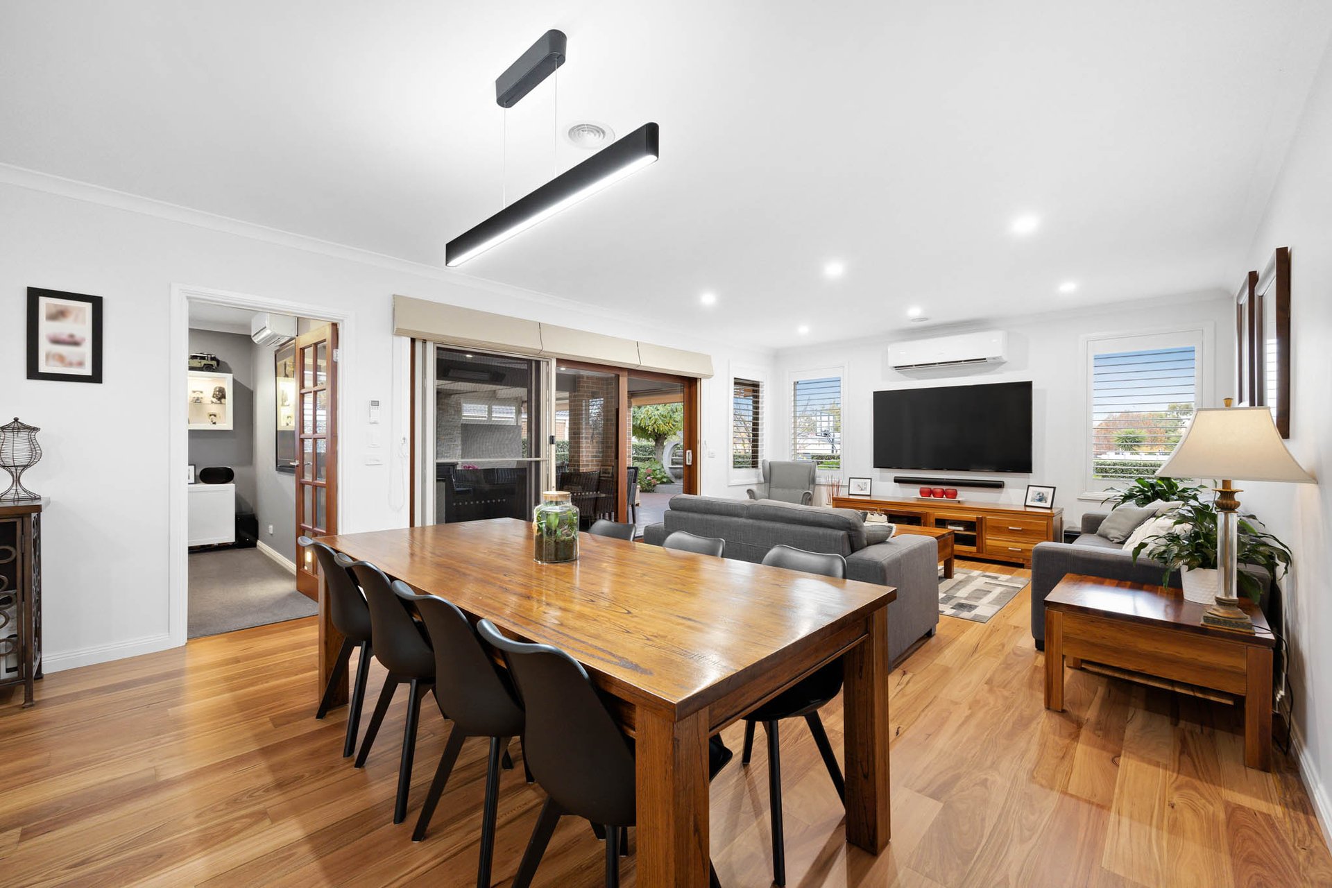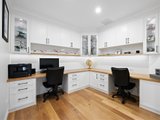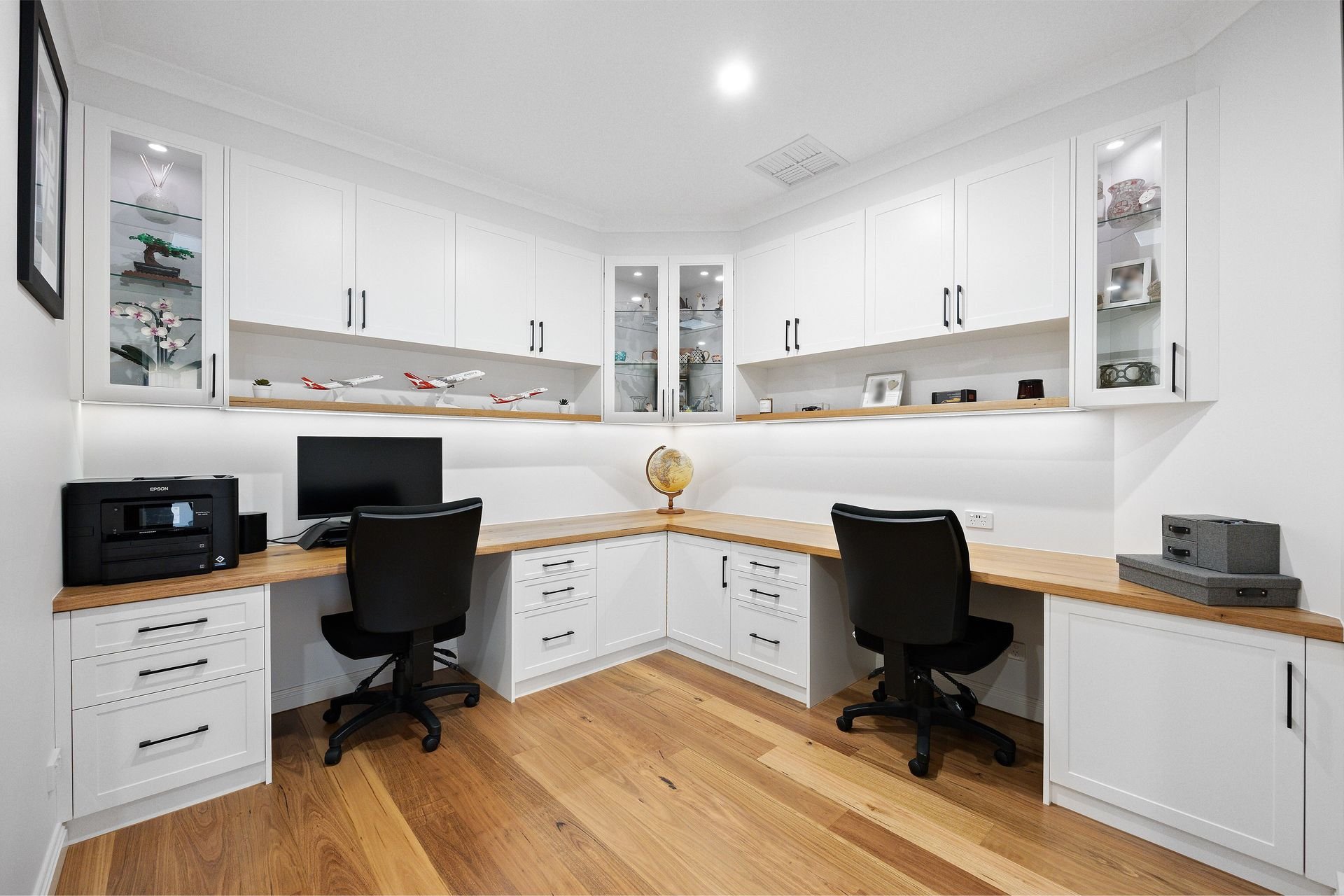 Accommodation comprises four spacious bedrooms including a luxurious main suite with a walk-in robe and elegant ensuite featuring a frameless glass shower and twin stone vanity. The remaining bedrooms, all with built-in robes, are serviced by a central bathroom with a bath, shower, and separate toilet, while a fitted study with custom Blackbutt desking provides an ideal work-from-home solution.
