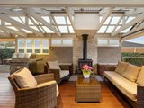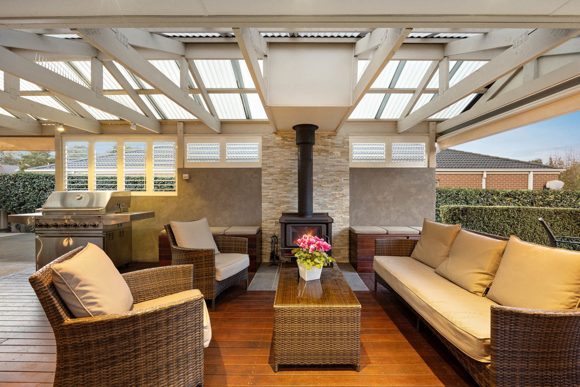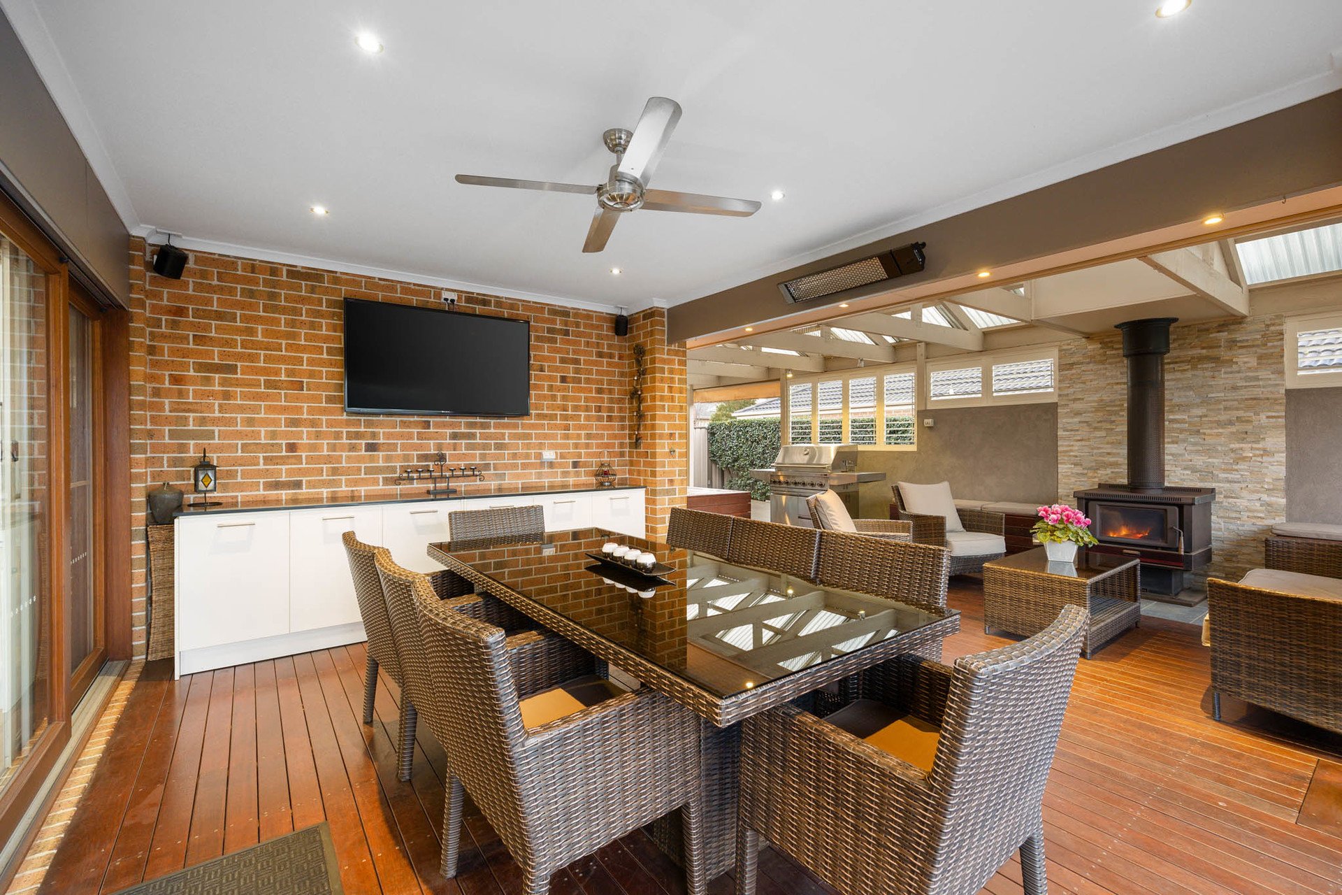 Internal French doors open to a sound-dampened theatre room, while glass stacker doors extend the main living area to a grand outdoor entertaining domain complete with an exterior fan, heater, retractable bistro blinds, stone-topped cooking storage, and a wood-fuelled heater.
