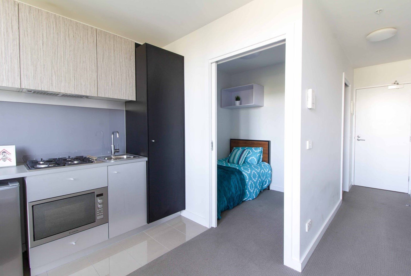 The studio features an open-plan living and separate sleeping area with shelves, a kitchen/meals space with gas cooktop and ample cupboard storage, and a bathroom with shower and toilet. A split system ensures comfort all year round, while a small private balcony provides the perfect spot to unwind. Additional features include a communal laundry and a secure storage area downstairs for scooters and bikes. No onsite parking available pr provided.
