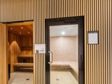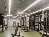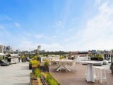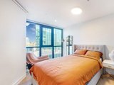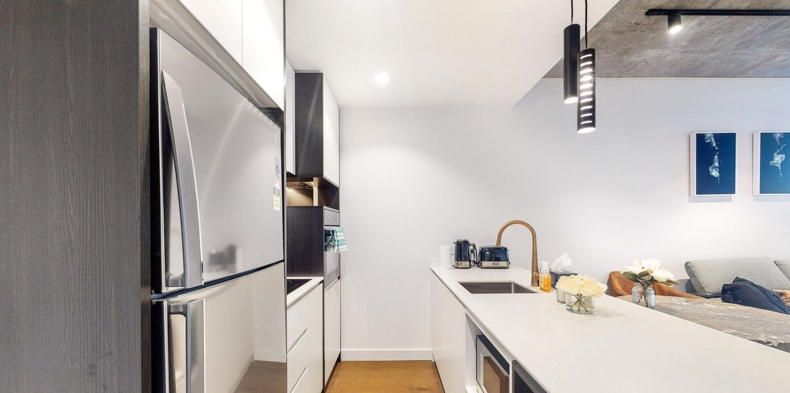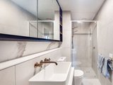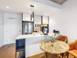Inside, bold design elements come together to create a striking yet welcoming atmosphere. Soaring concrete ceilings are contrasted by the warmth of timber floors, while expansive double-glazed windows flood the interior with natural light, enhancing the apartment's already impressive sense of space. Ideal for entertaining or unwinding after a long day, the open-plan living and dining area extends effortlessly onto a deep, private balcony. At the heart of the home, the sleek stone kitchen is beautifully appointed with premium appliances and a streamlined layout, ideal for home cooking or casual hosting.
