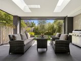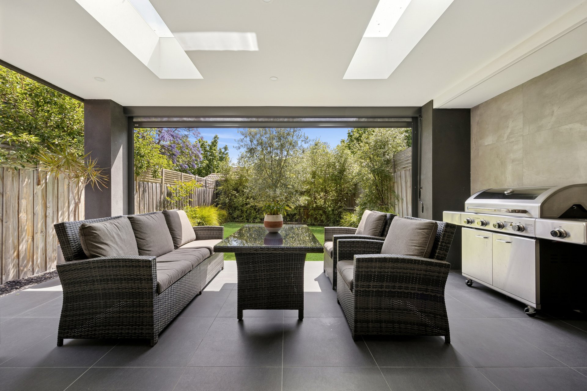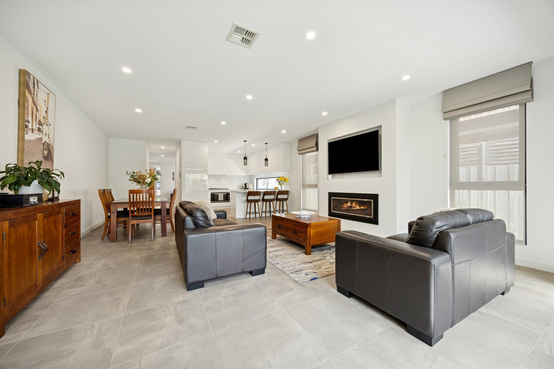 The entry reveals a fitted study tucked quietly to the side, complete with twin desks and extensive cabinetry. It is a polished workspace that sits well away from the main living zones. Further in, a relaxed lounge opens via sliding doors to a private side courtyard, while the family and dining area centres around a gas fireplace and connects seamlessly to the kitchen. Stone benchtops, a wide breakfast bar, 900mm cooktop and oven, and a dishwasher make the kitchen both social and hardworking. From here, bi-fold doors seamlessly extend the comfort to a covered alfresco with two skylights and a manual pull-down blind, essentially creating a fourth living zone that works twelve months a year, overlooking the generous rear garden.