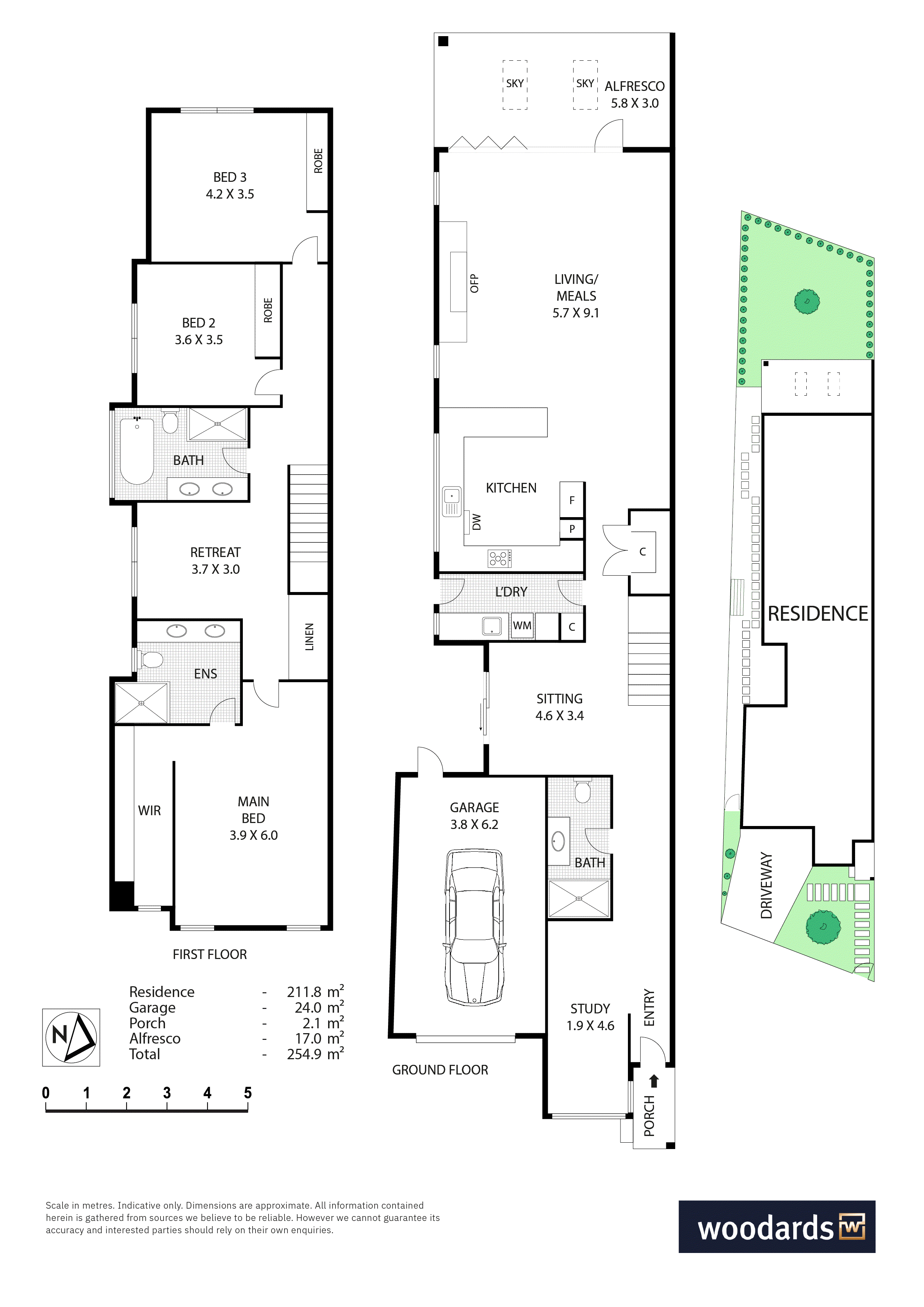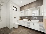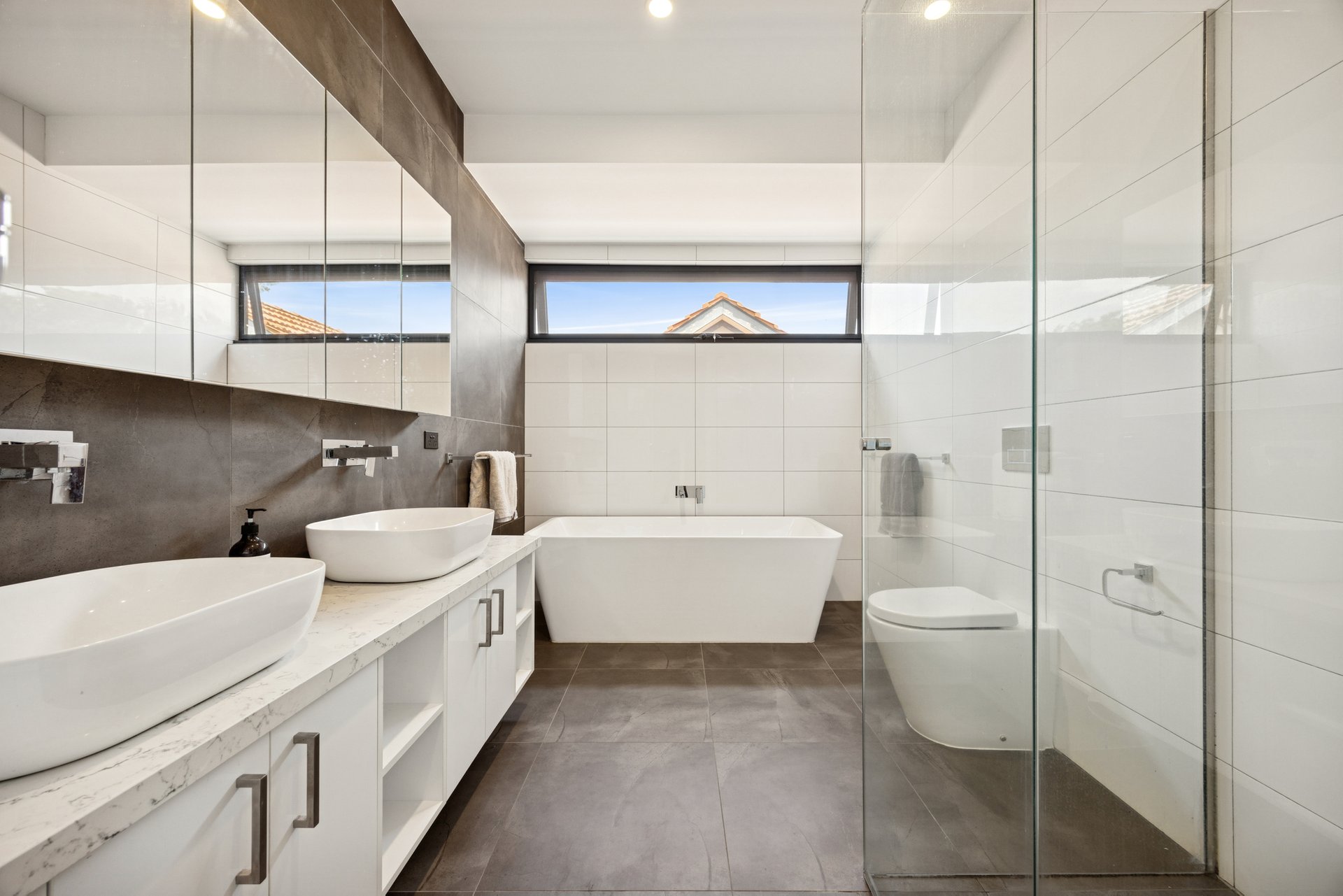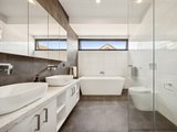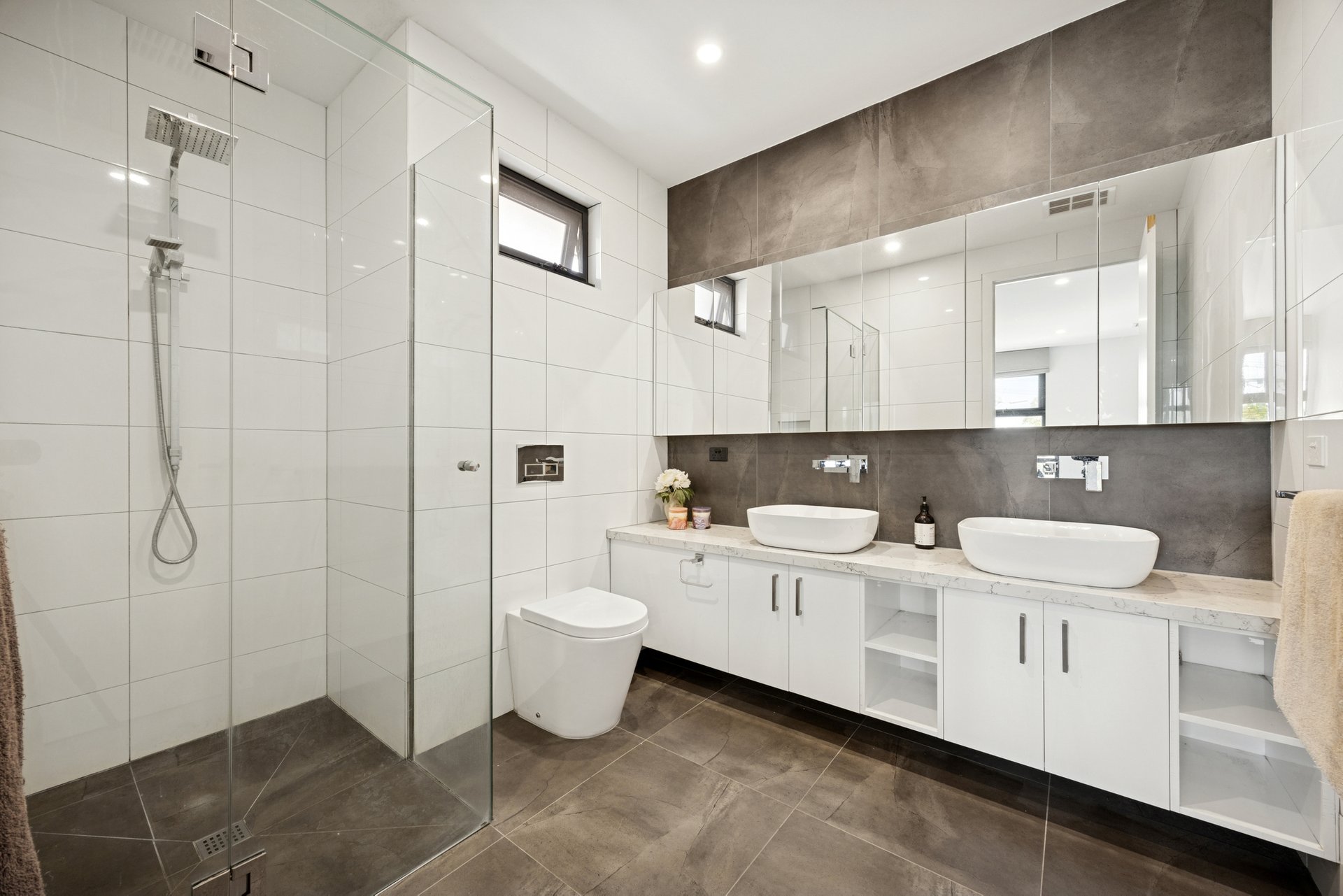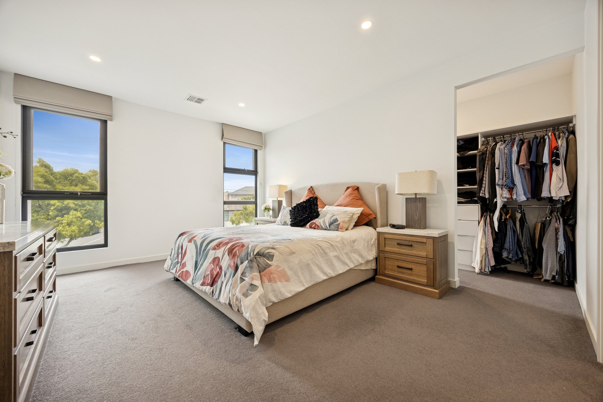 Upstairs, a retreat buffers the bedrooms. The main bedroom enjoys its own privacy with walk-in robe and a refined ensuite featuring twin vanities. Two further bedrooms with built-in robes share a family bathroom complete with a soaking tub, shower and twin basins. Additional highlights include a full downstairs bathroom, laundry, under-stair storage, single garage, timber staircase, video-monitored intercom entry, zoned refrigerated air conditioning and heating, and solar hot water.