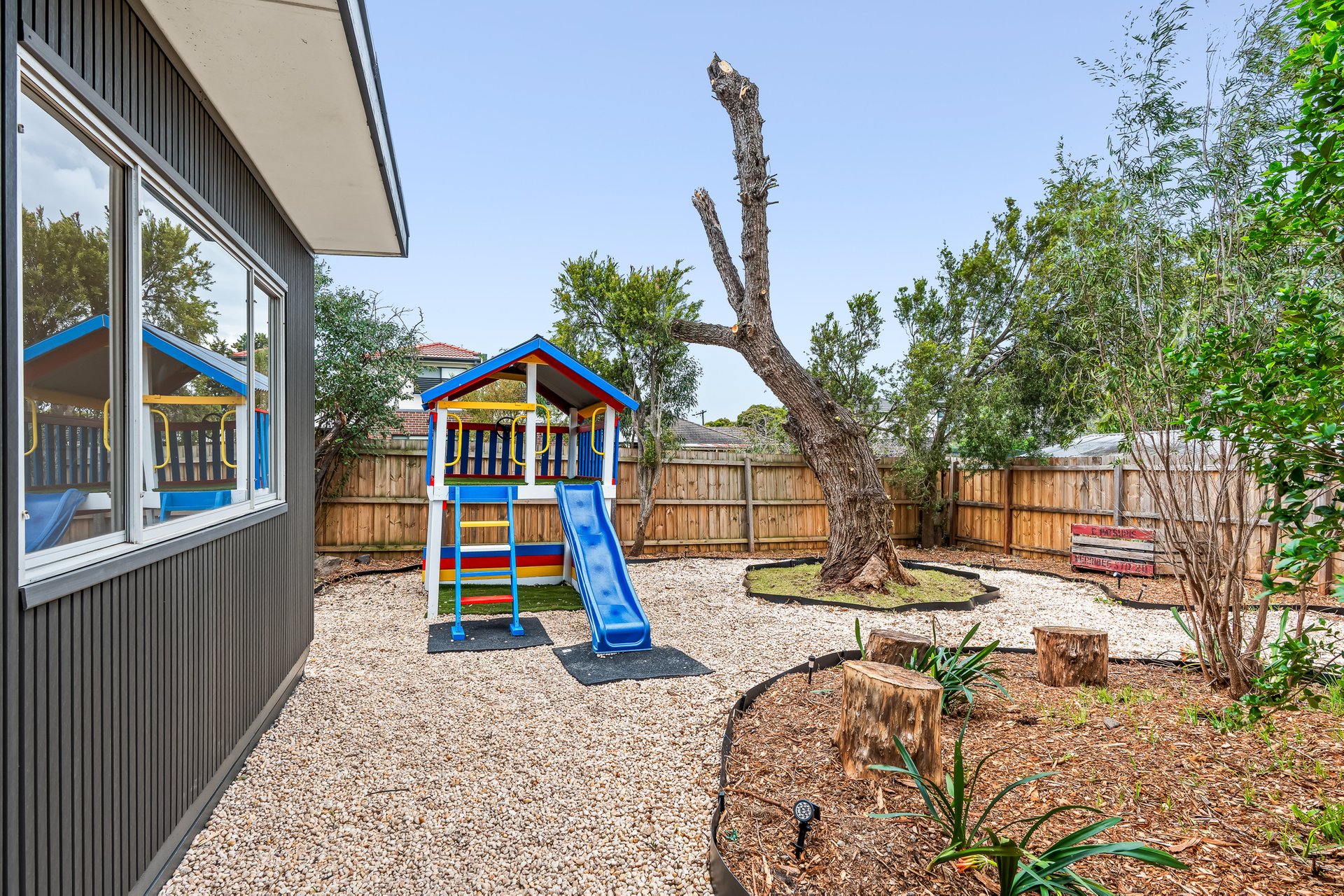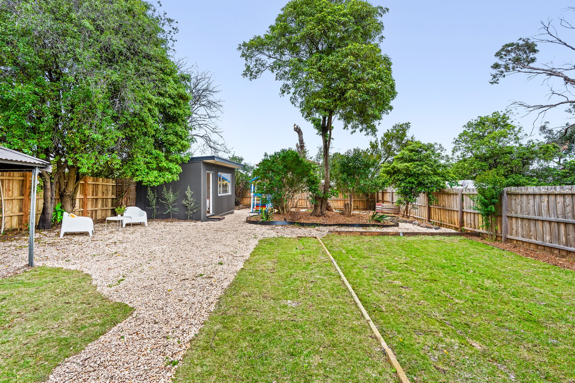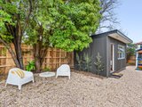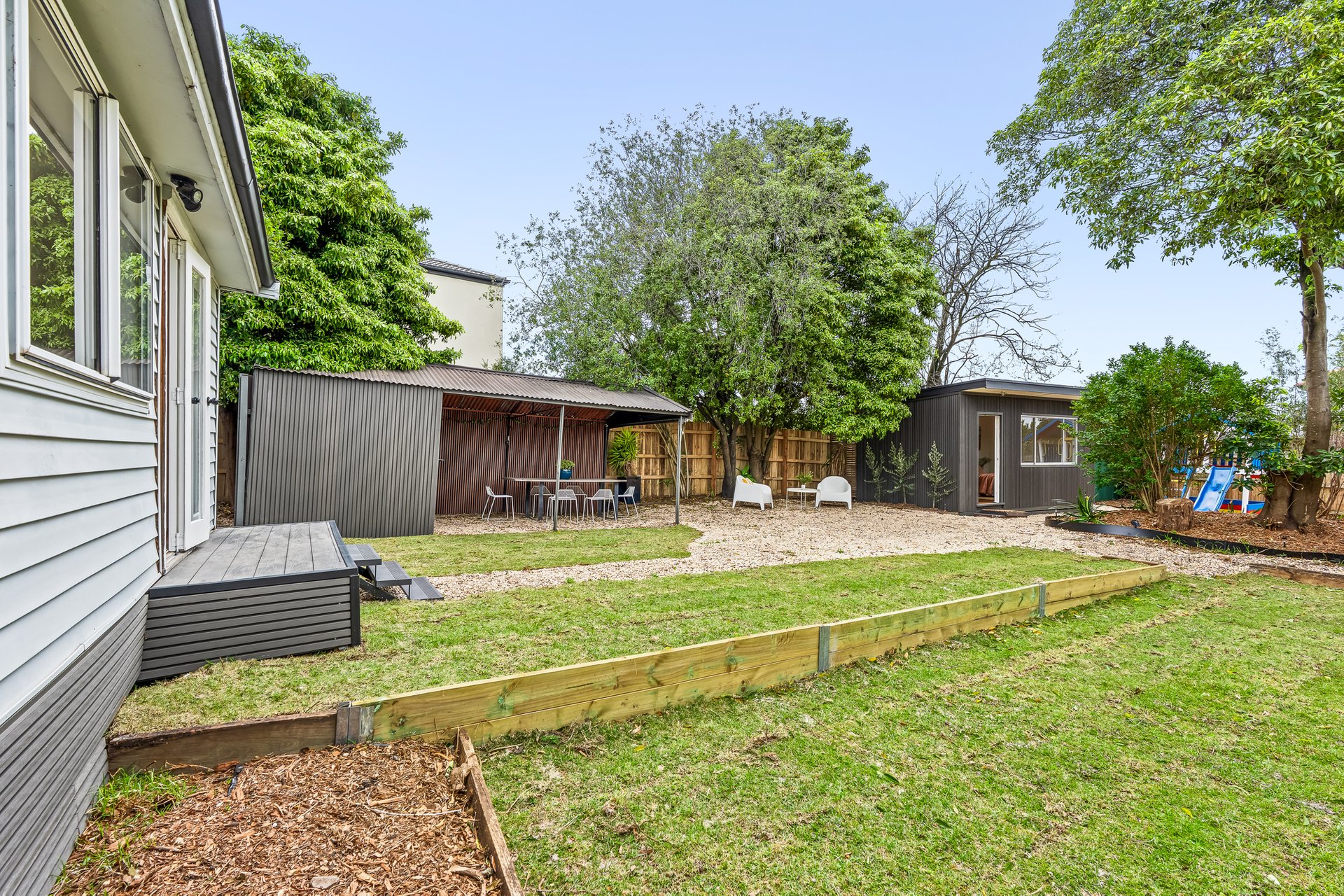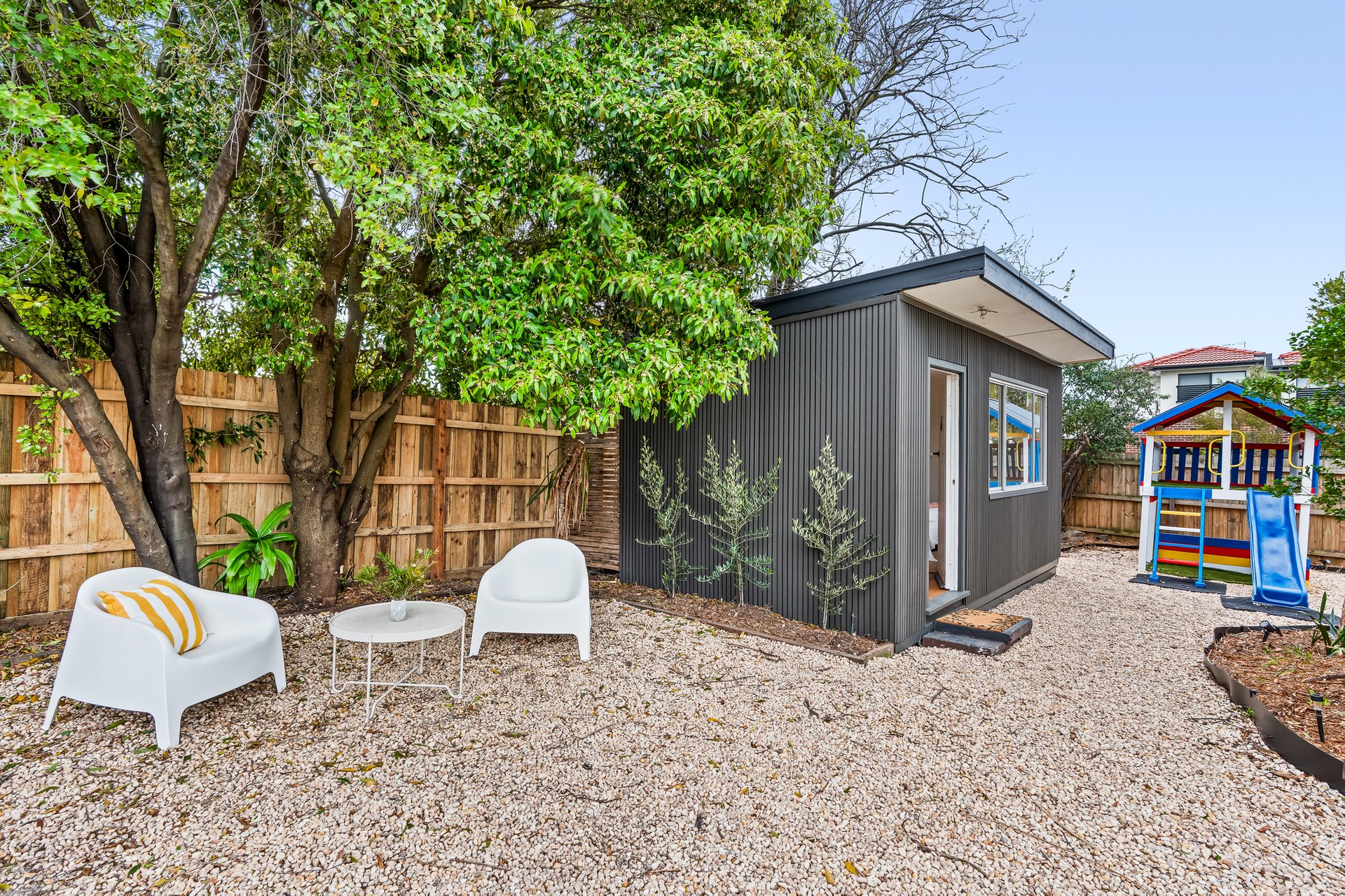 The heart of the home is the contemporary kitchen, complete with sleek countertops and ample storage, seamlessly flowing into the expansive dining area. This layout is ideal for entertaining guests or enjoying family meals together. A beautifully landscaped north-facing backyard, complete with lush greenery and a charming cubby house, provides a serene escape for both adults and children. The separate studio space offers flexibility for a home office, additional bedroom or creative pursuits, ensuring that every family member’s needs are met.