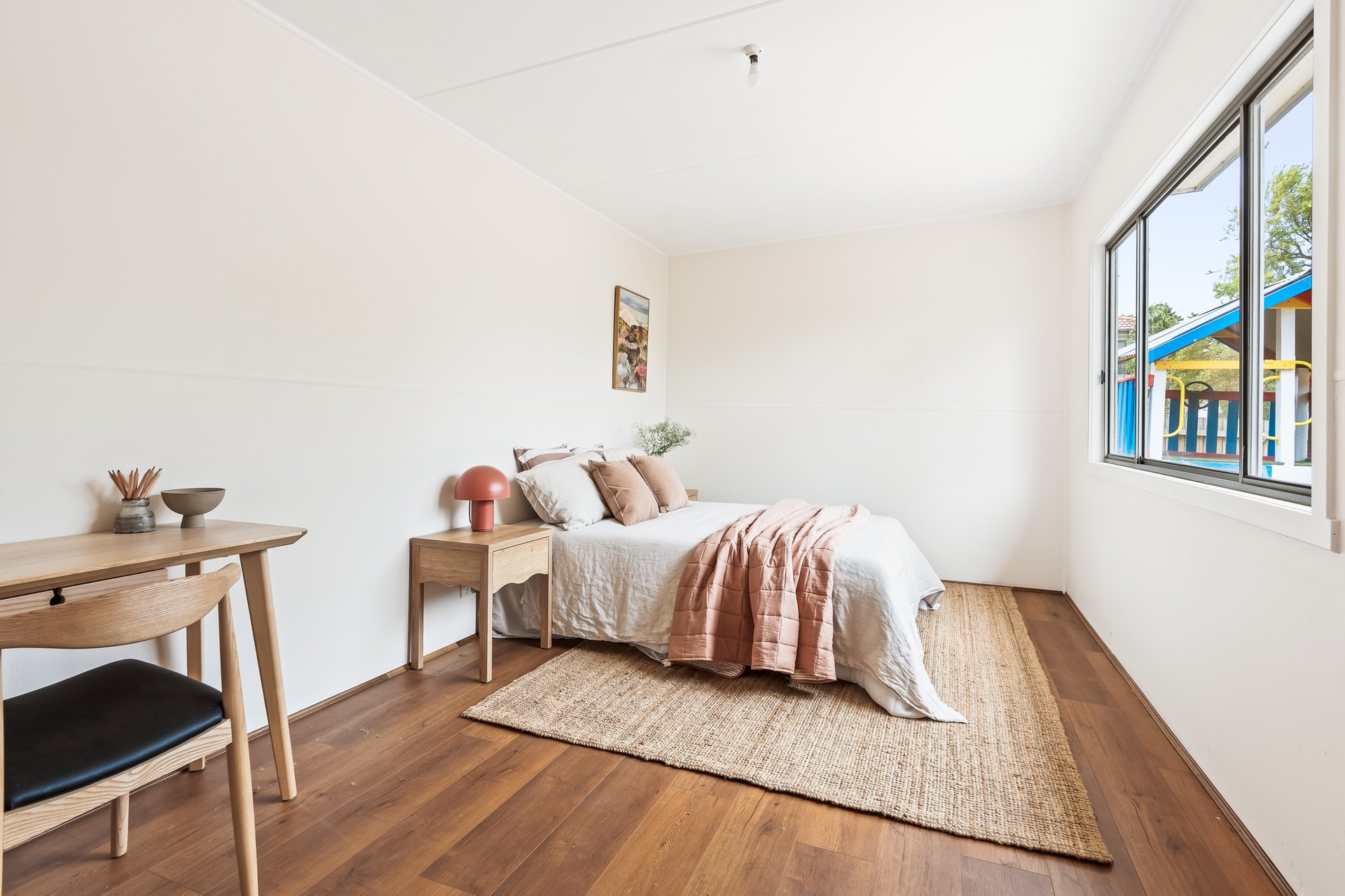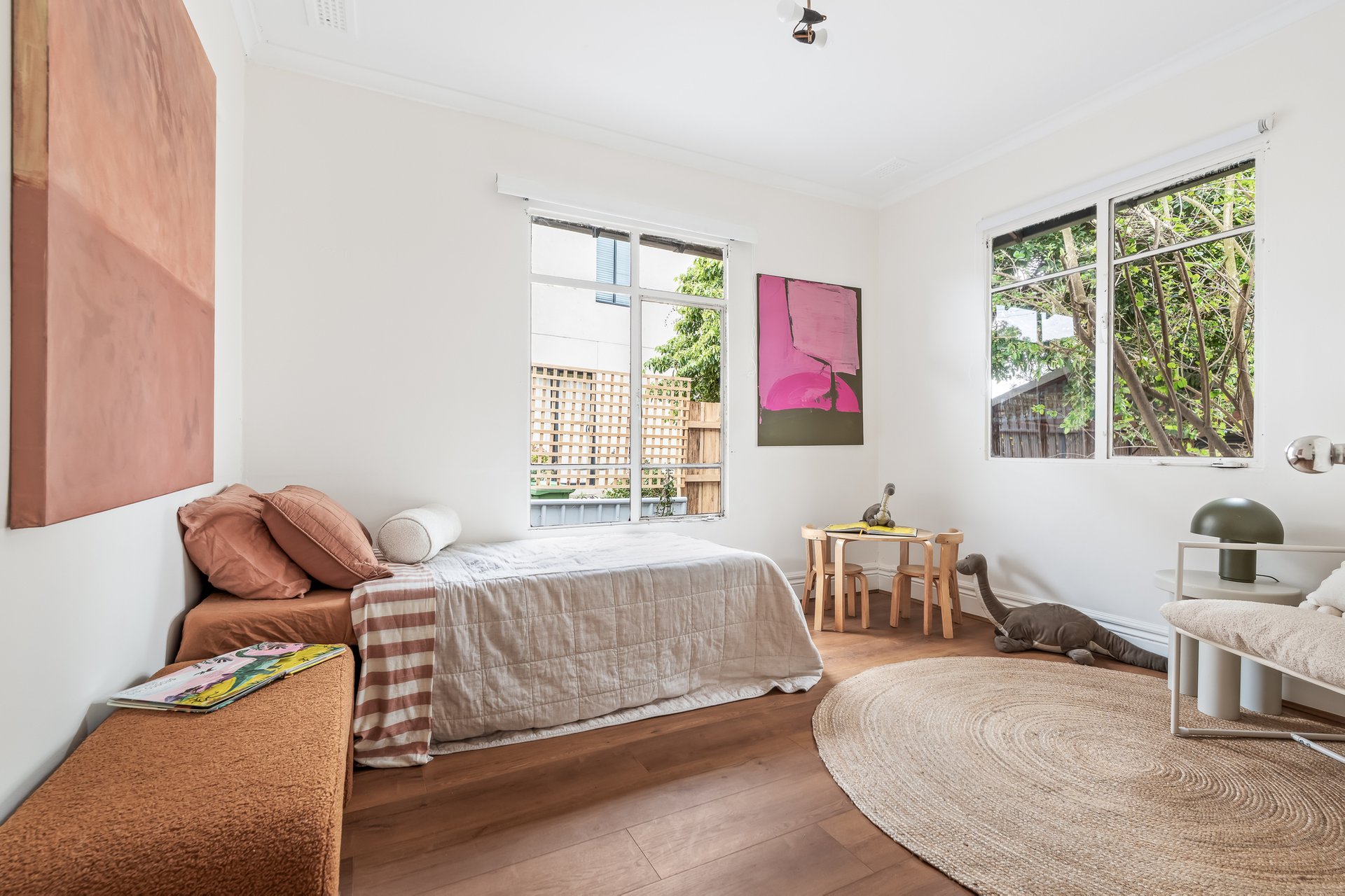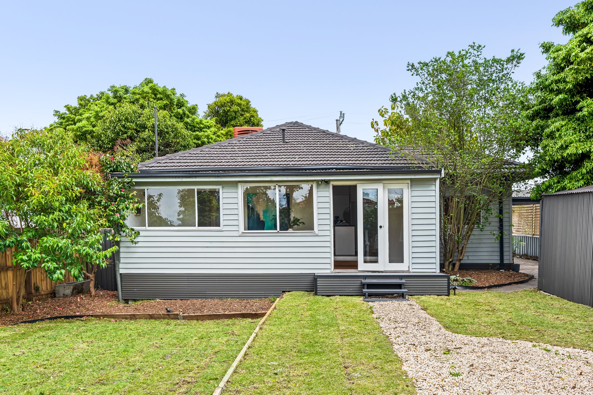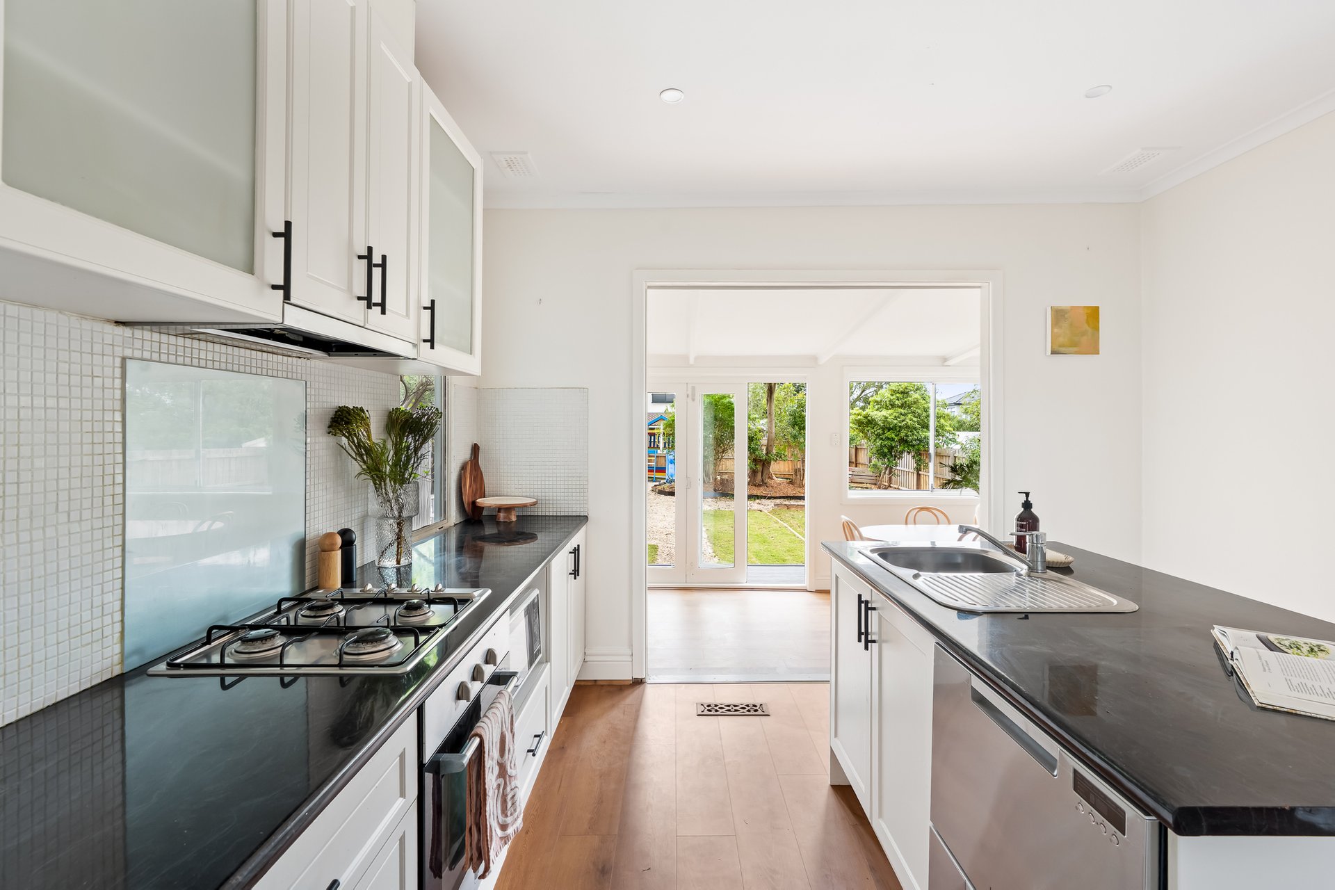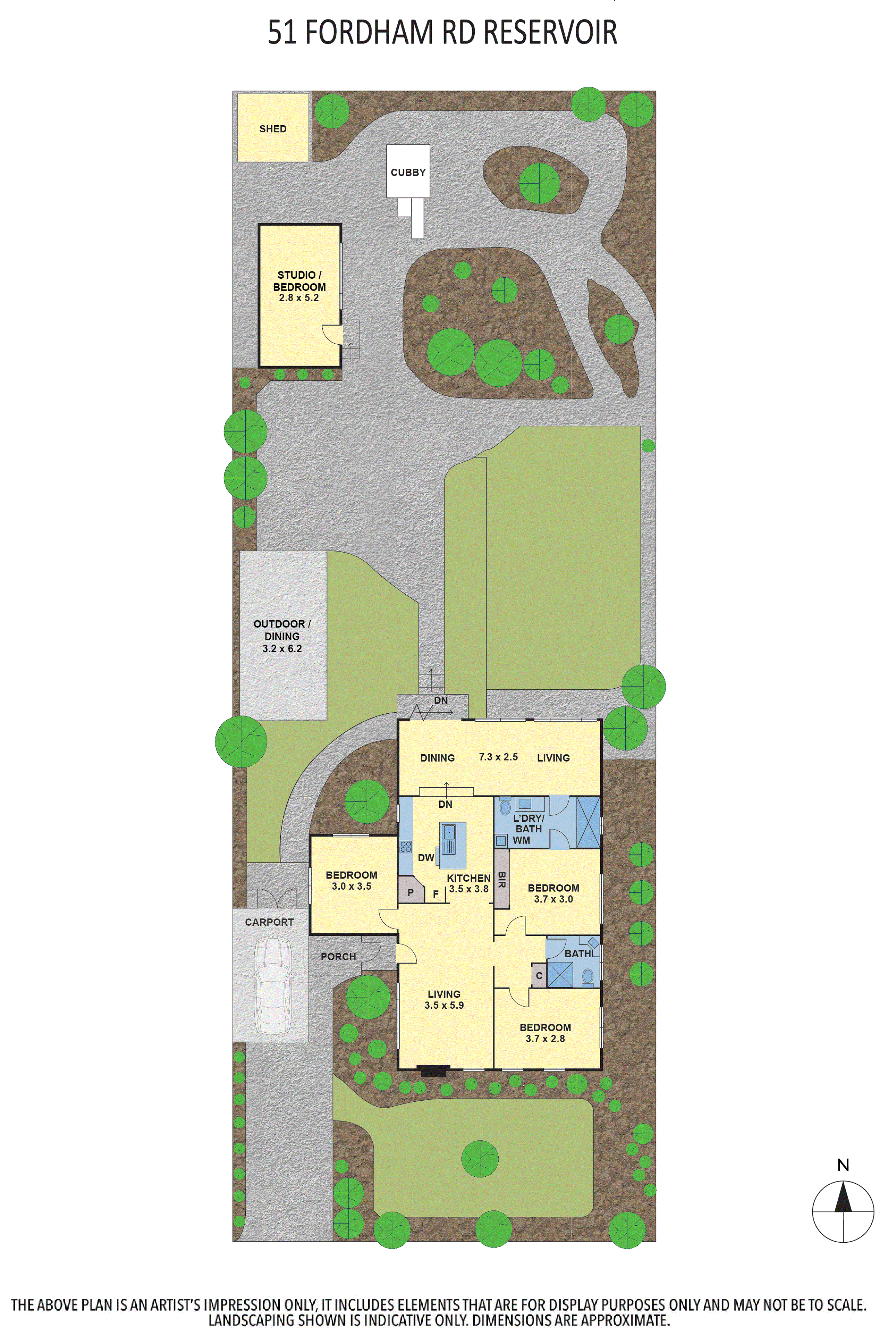 The heart of the home is the contemporary kitchen, complete with sleek countertops and ample storage, seamlessly flowing into the expansive dining area. This layout is ideal for entertaining guests or enjoying family meals together. A beautifully landscaped north-facing backyard, complete with lush greenery and a charming cubby house, provides a serene escape for both adults and children. The separate studio space offers flexibility for a home office, additional bedroom or creative pursuits, ensuring that every family member’s needs are met.