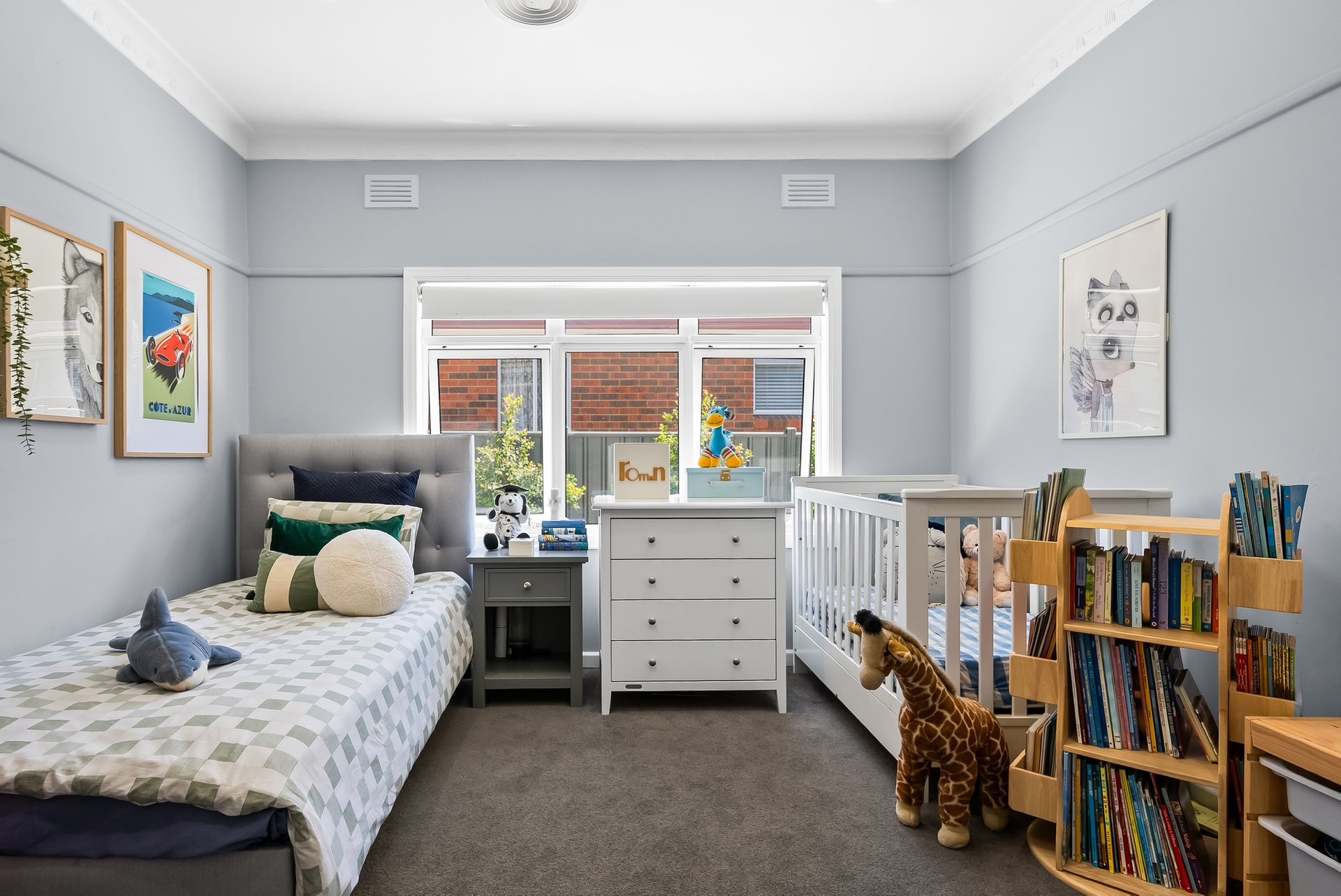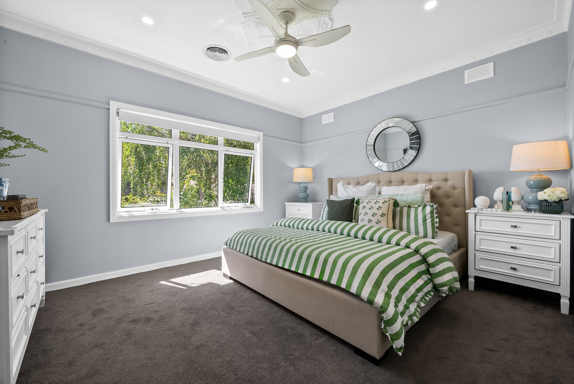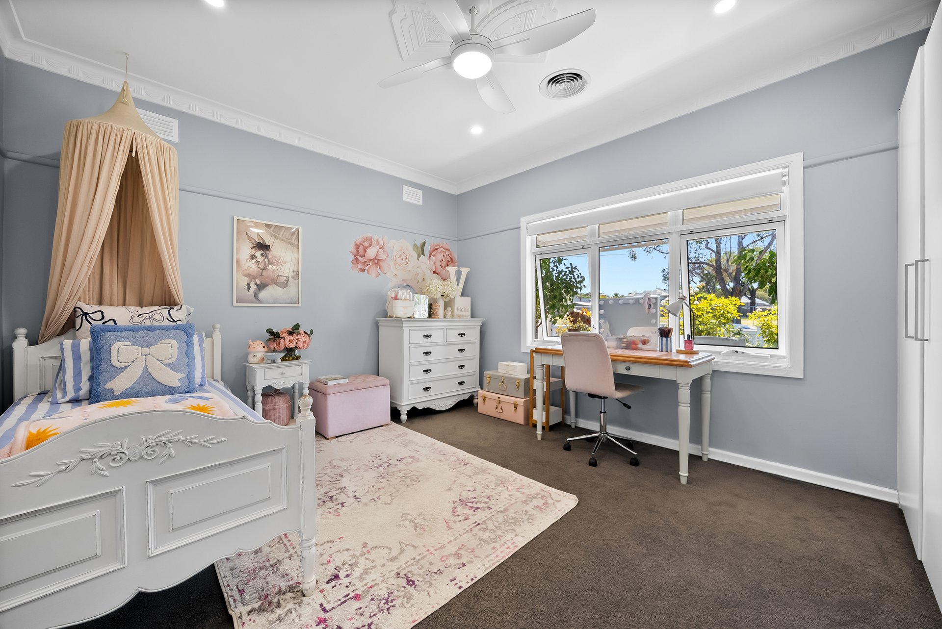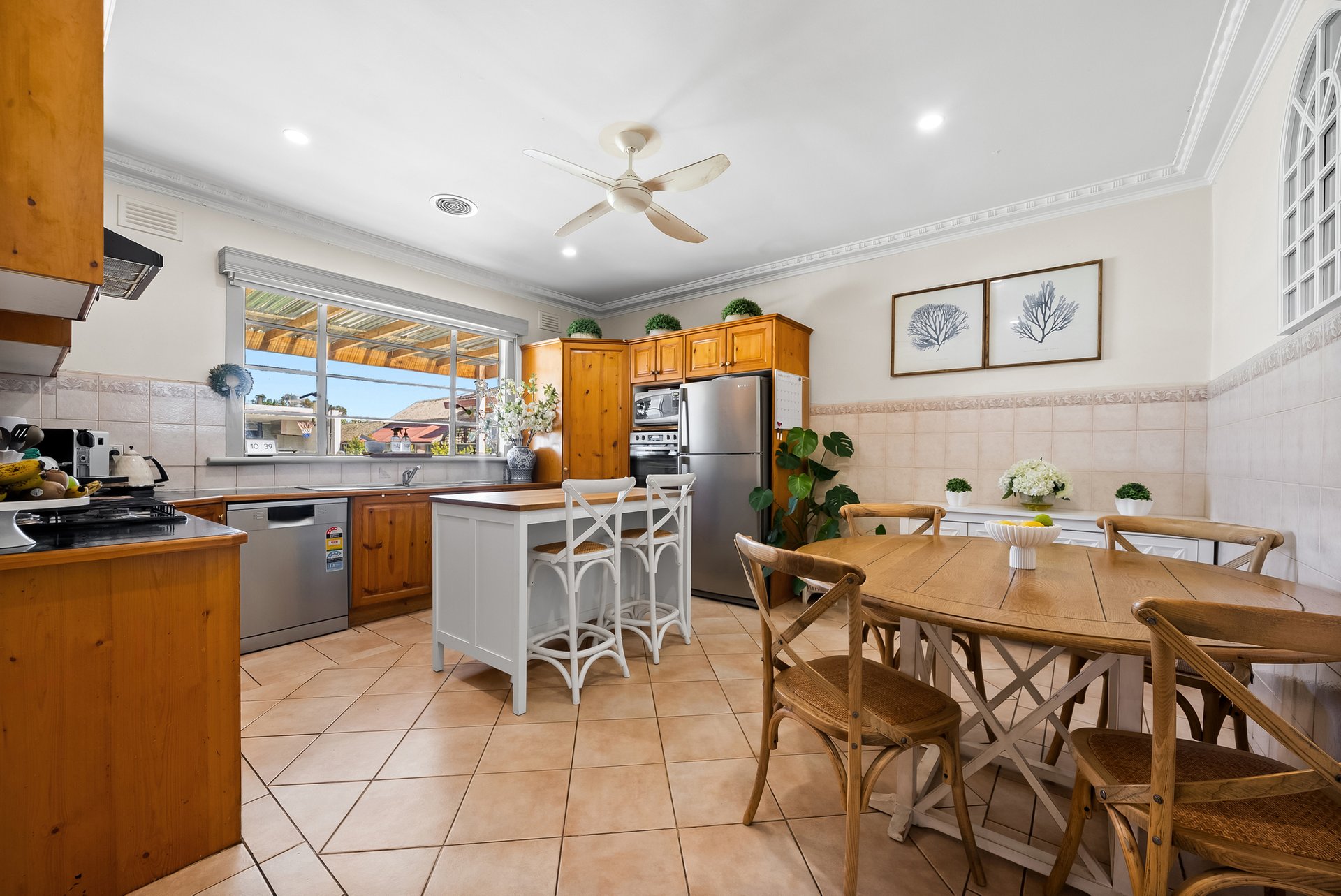 The kitchen and dining area is functional and family-friendly, featuring tiled floors, cornicing, wooden cabinetry, black benchtops and a large window above the sink. There’s ample space for a dining table, with scope to modernise or reconfigure to suit your lifestyle.