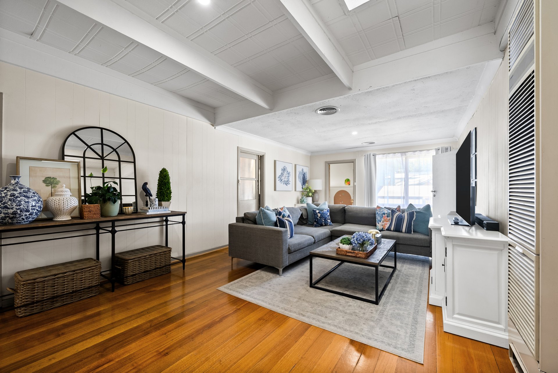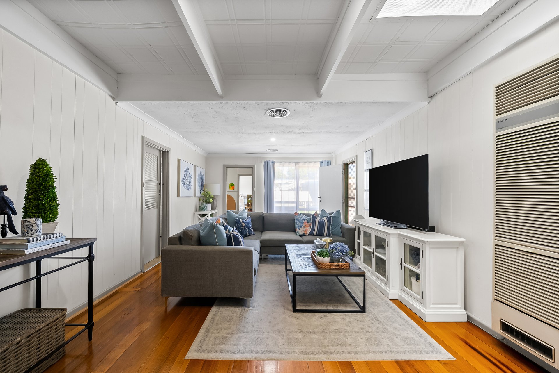 The central living room showcases original timber floors, exposed beams and a large skylight that fills the space with natural light. While the home is comfortable to live in as is, it also presents an excellent opportunity for buyers to add value through cosmetic updates and improvements over time. Positioned to overlook the backyard, the living area connects seamlessly to the covered alfresco, making it perfect for everyday family living.